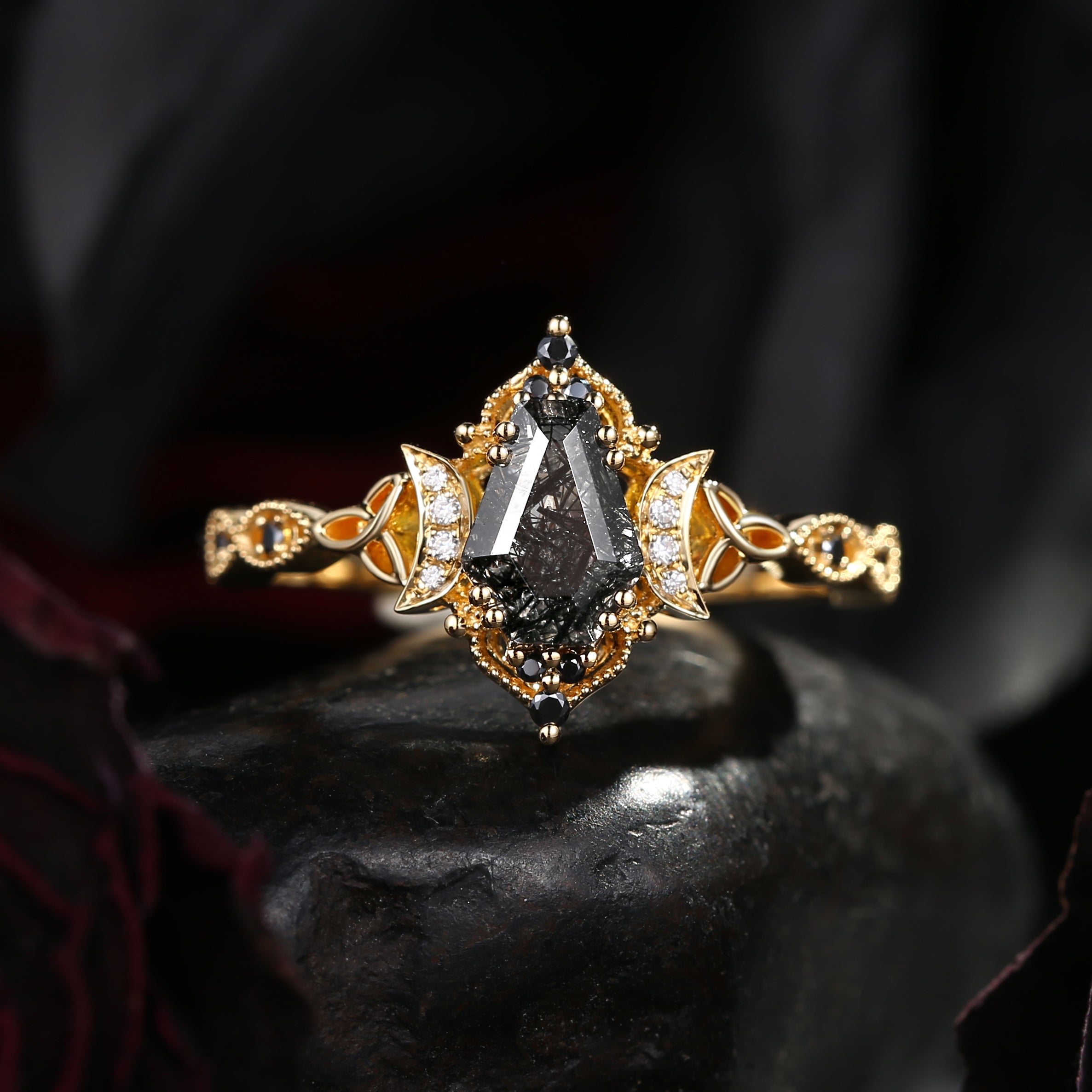 Crescent Moon | Unique Coffin Black Rutilated Quartz Infinity Celtic Engagement Ring