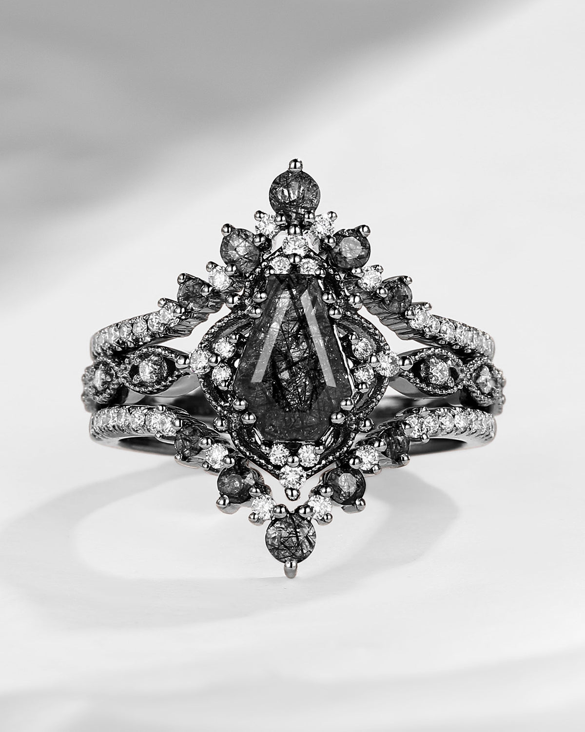 Kite Cut Black Rutilated Quartz Vintage Inspired Engagement Ring Set 2pcs