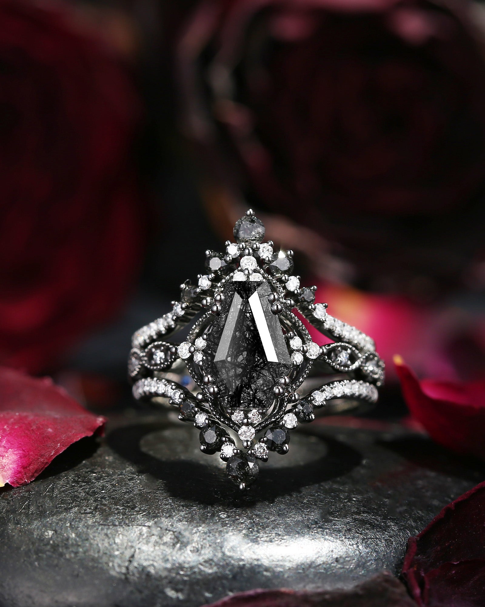 Cluster Coffin Black Rutilated Quartz Spider Web Engagement Ring Set 2pcs