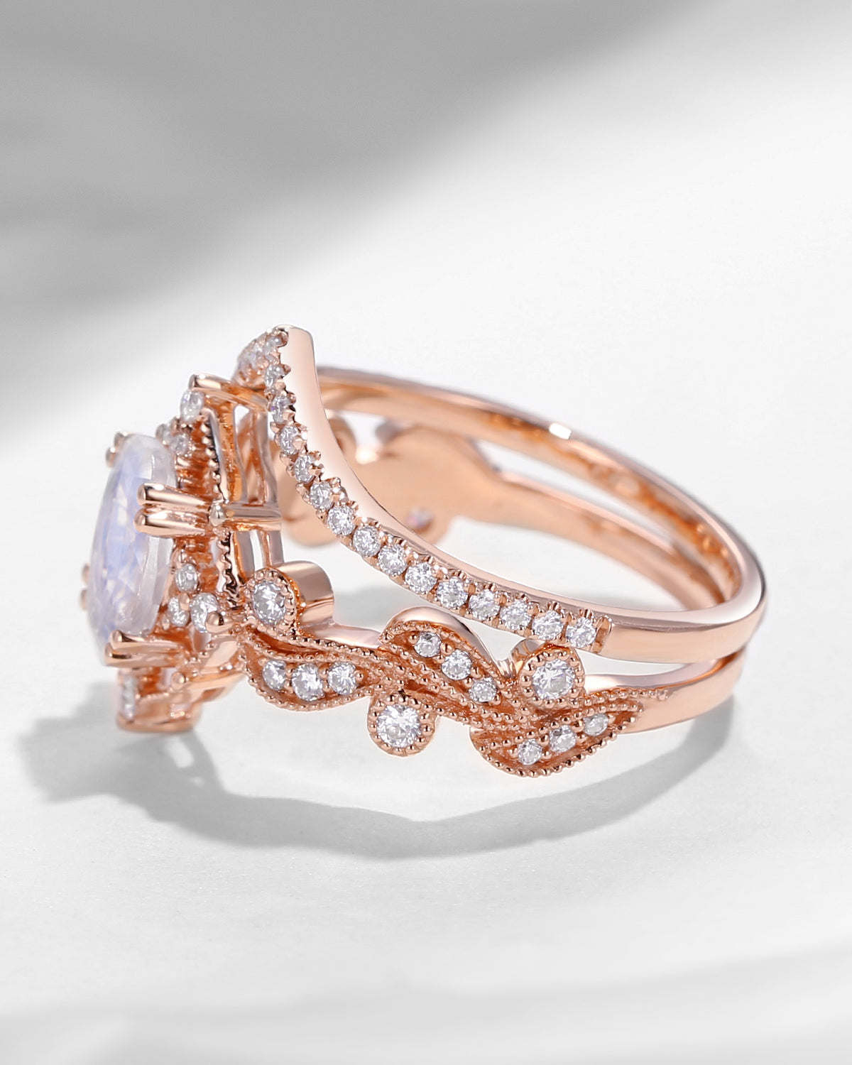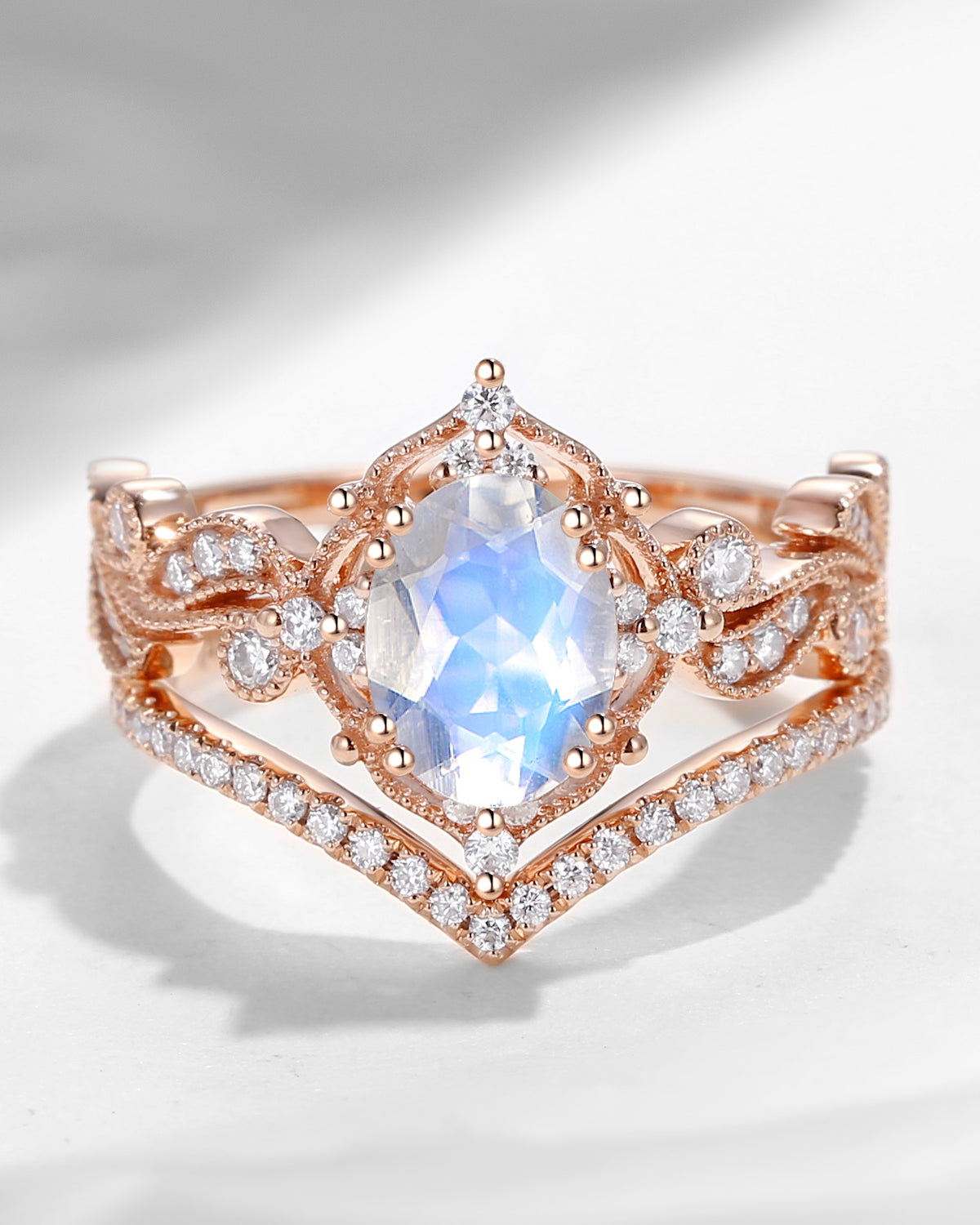 Unique Twist Oval Cut Moss Agate Nature Inspired Engagement Ring Set 2pcs