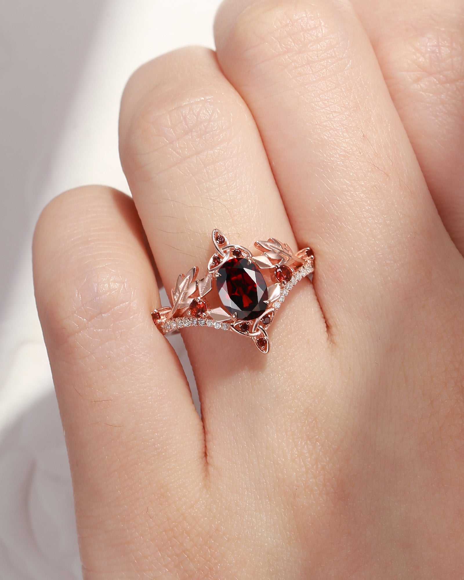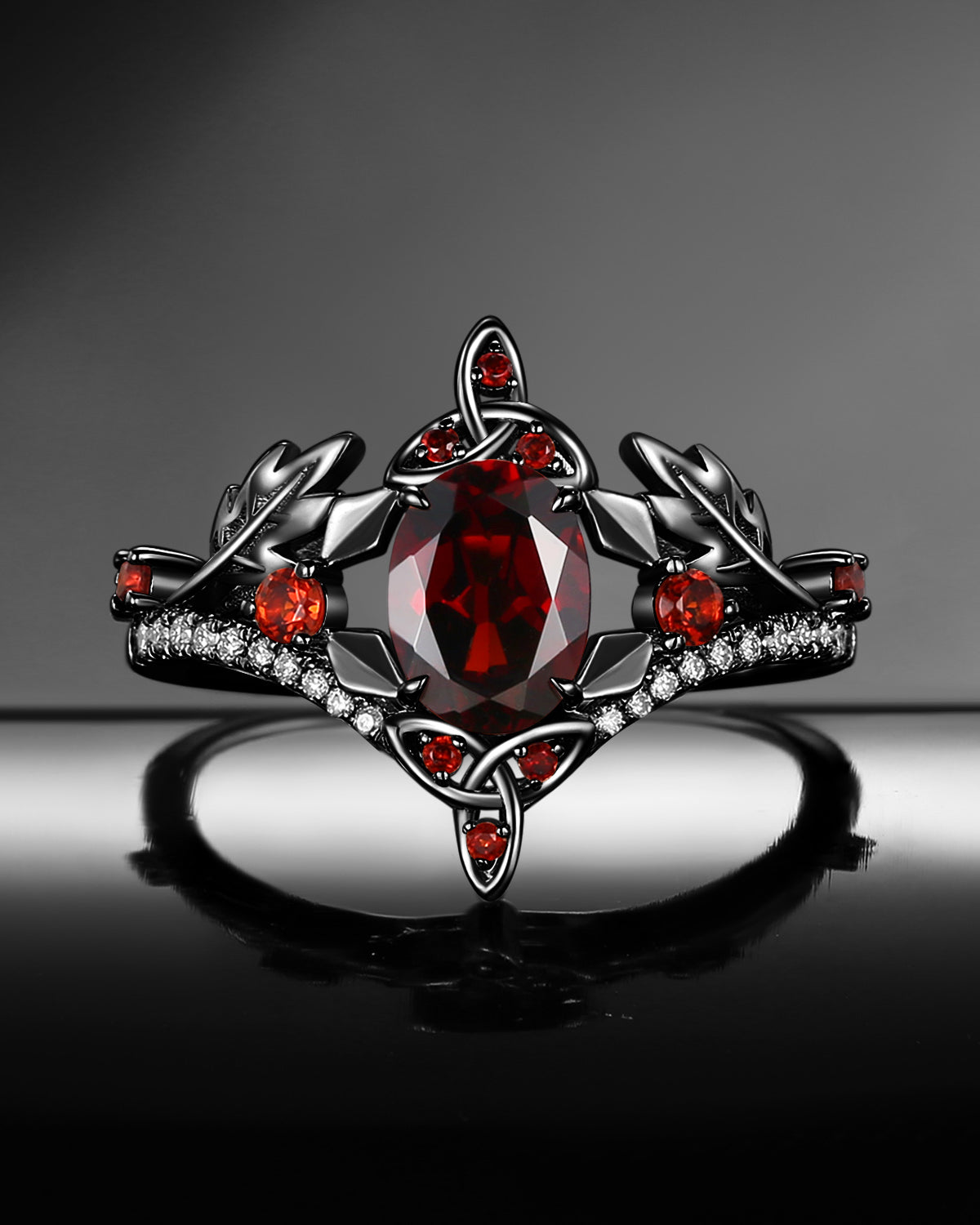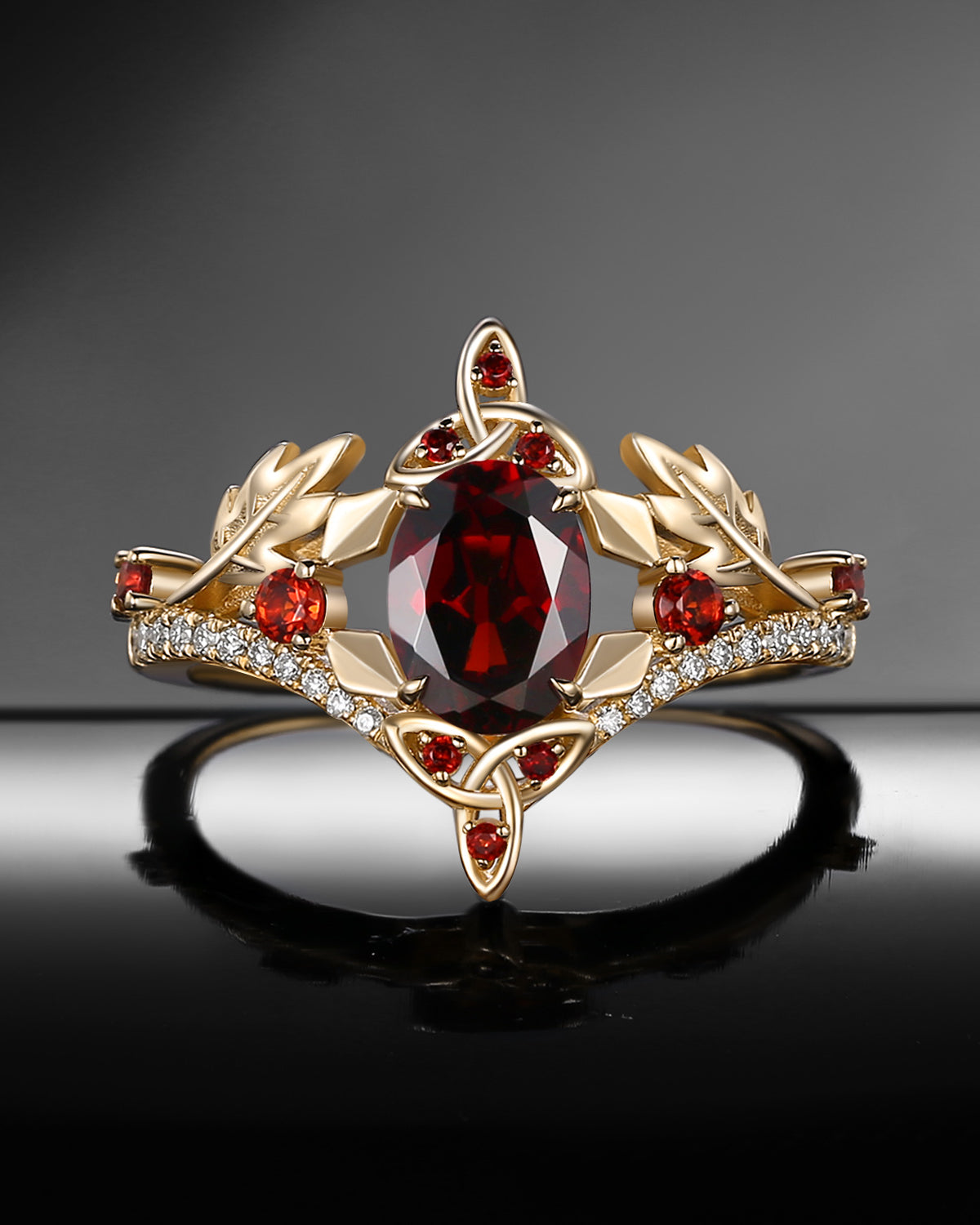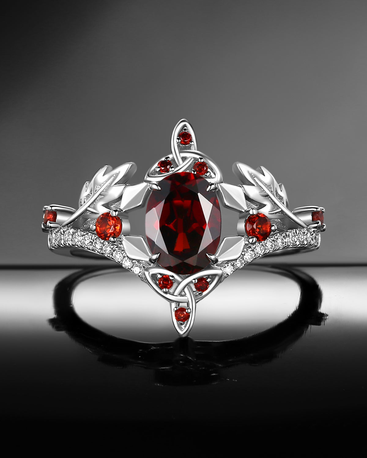 Celtic Moon | Oval Cut Garnet Infinity Celtic Moon Engagement Ring Set 2pcs