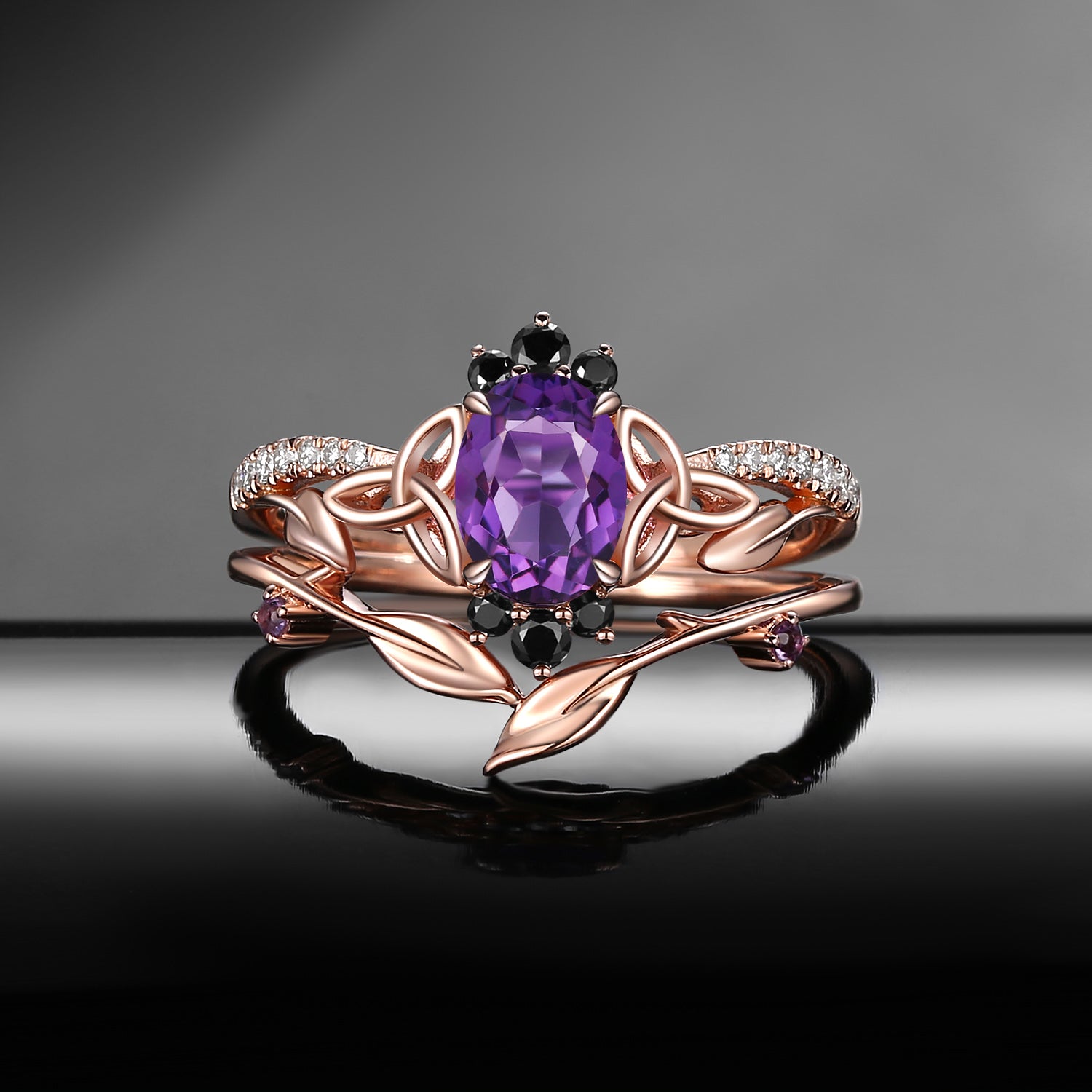 Celtic Calendar | 1.21-2.17 | Oval Amethyst Nature Inspired Rowan Leafy Celtic Ring Set 2pcs Birthstone Ring Promise Ring Celtic Inspired Rings