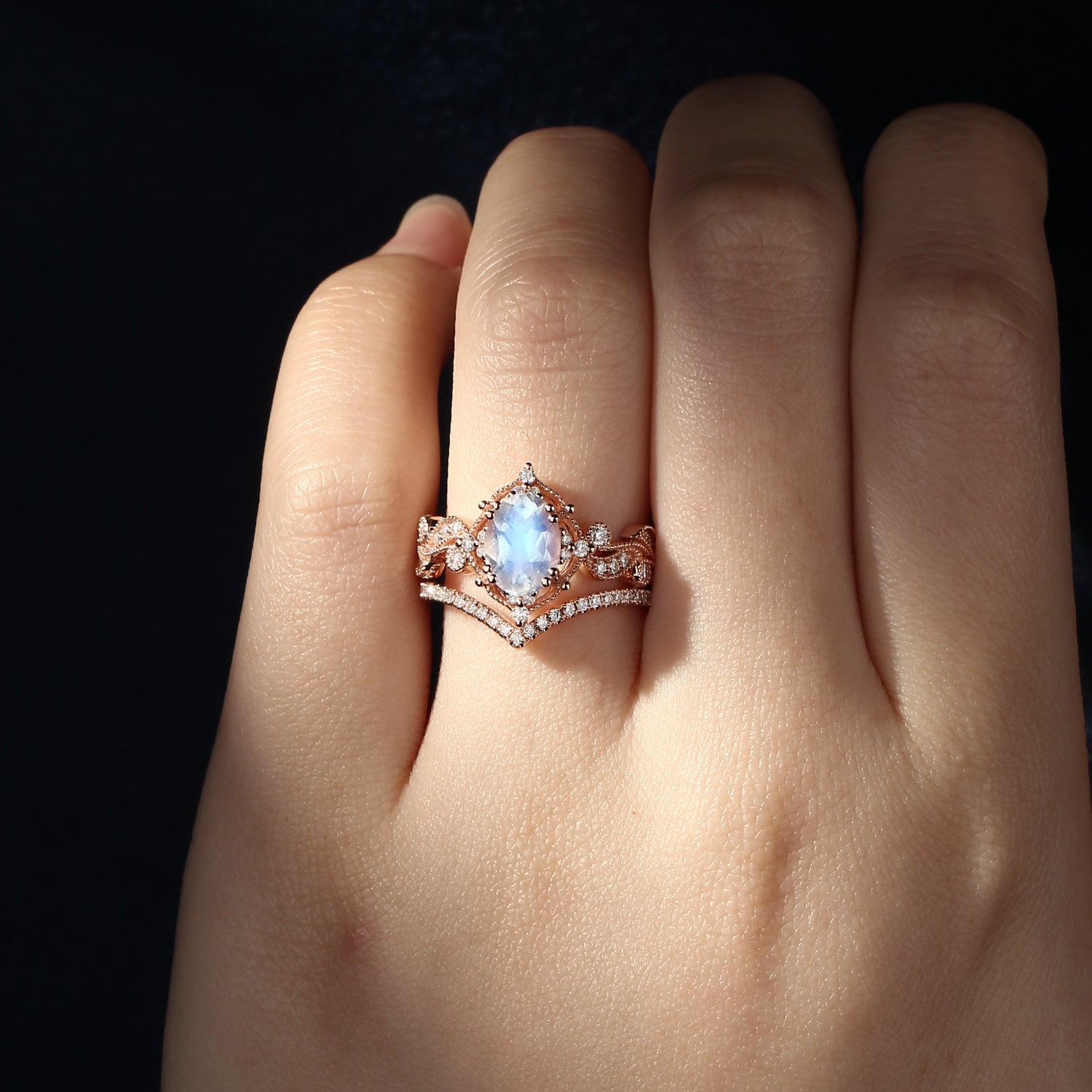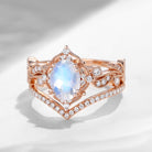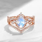 Flower Moonstone Bridal Set Rose Gold Cluster Rings Oval Engagement Ring V Shaped Chevron Band Women Petal Ring Vine Milgrain Leafy Band 2pcs