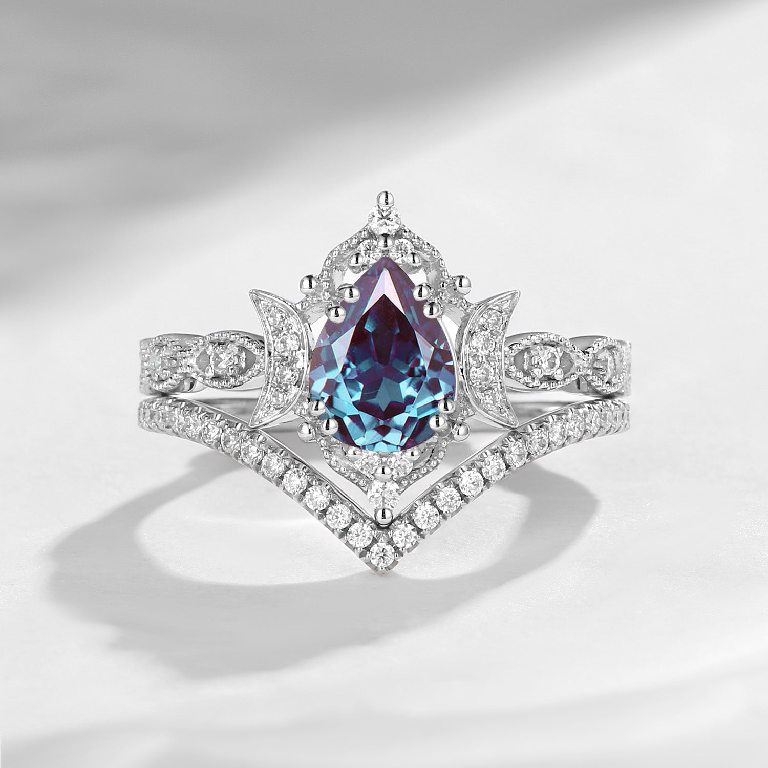 Crescent Moon | Antique Pear Shaped Lab Alexandrite Engagement Ring 2pcs