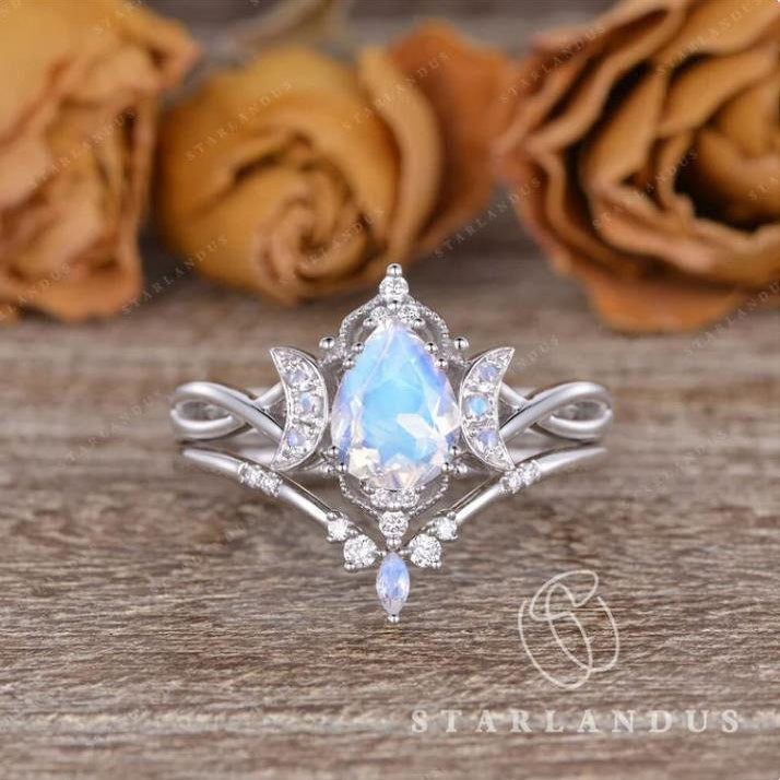 White Gold Infinity Engagement Ring 2pcs Moonstone Ring Unique Crescent Ring Vintage Inspired Moon Ring Galaxy One of a kind Vine Flower Set