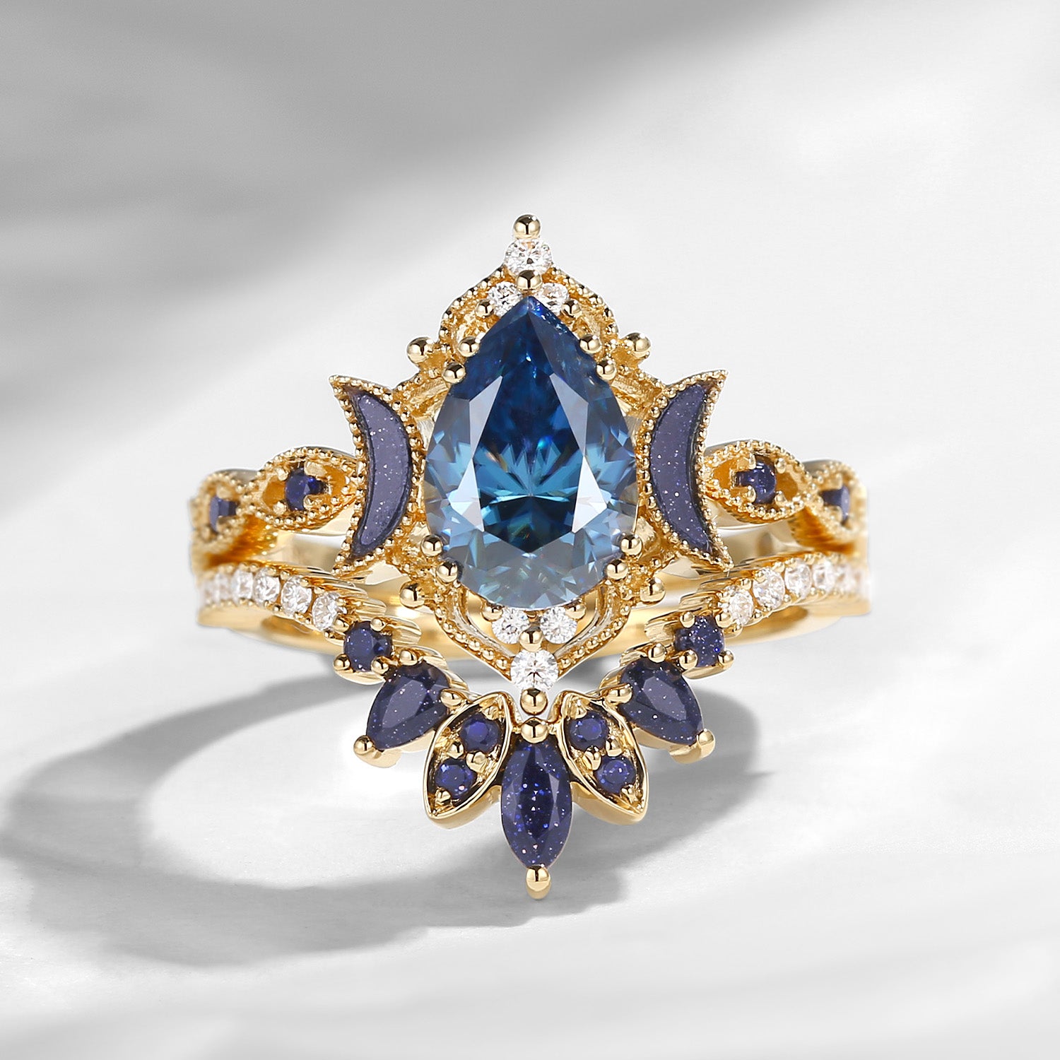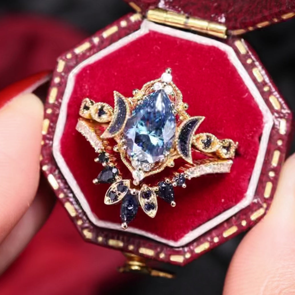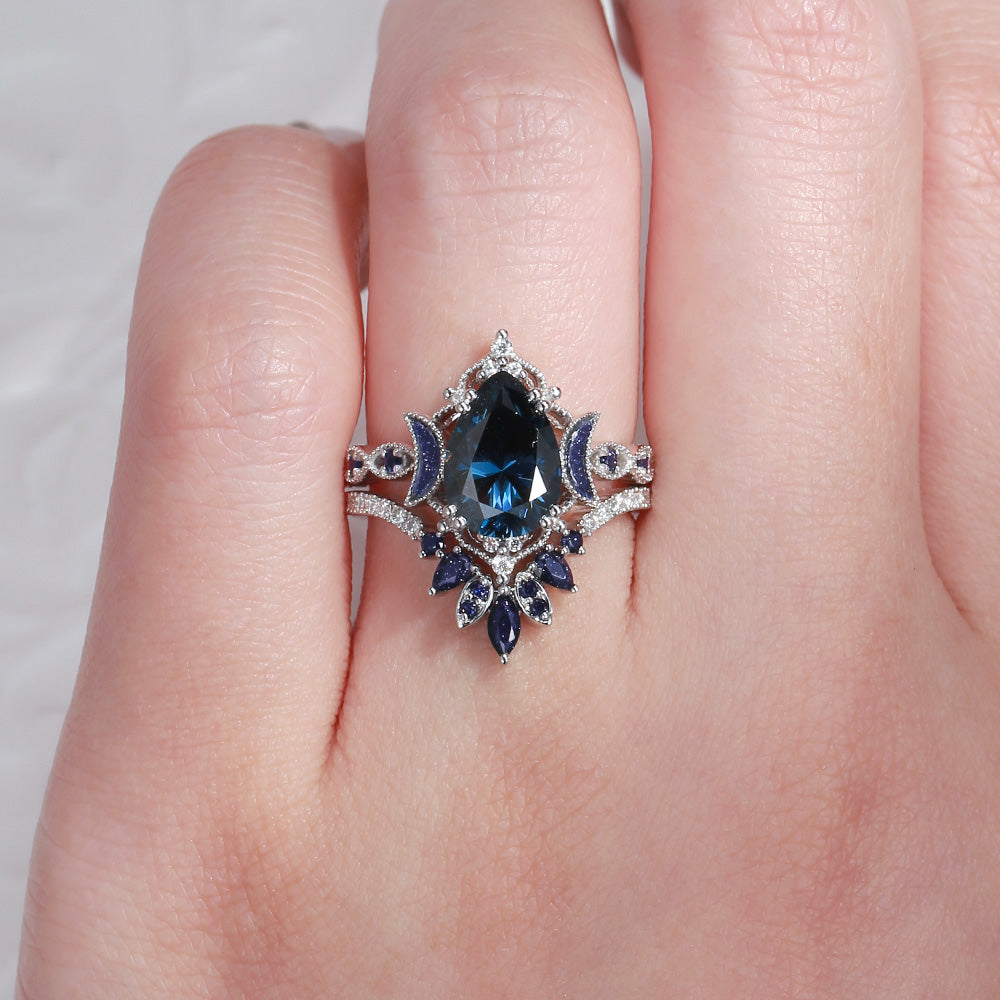 Crescent Moon | Pear Cut Blue Moissanite 'Ultra Galaxy' Engagement Ring Set 2pcs