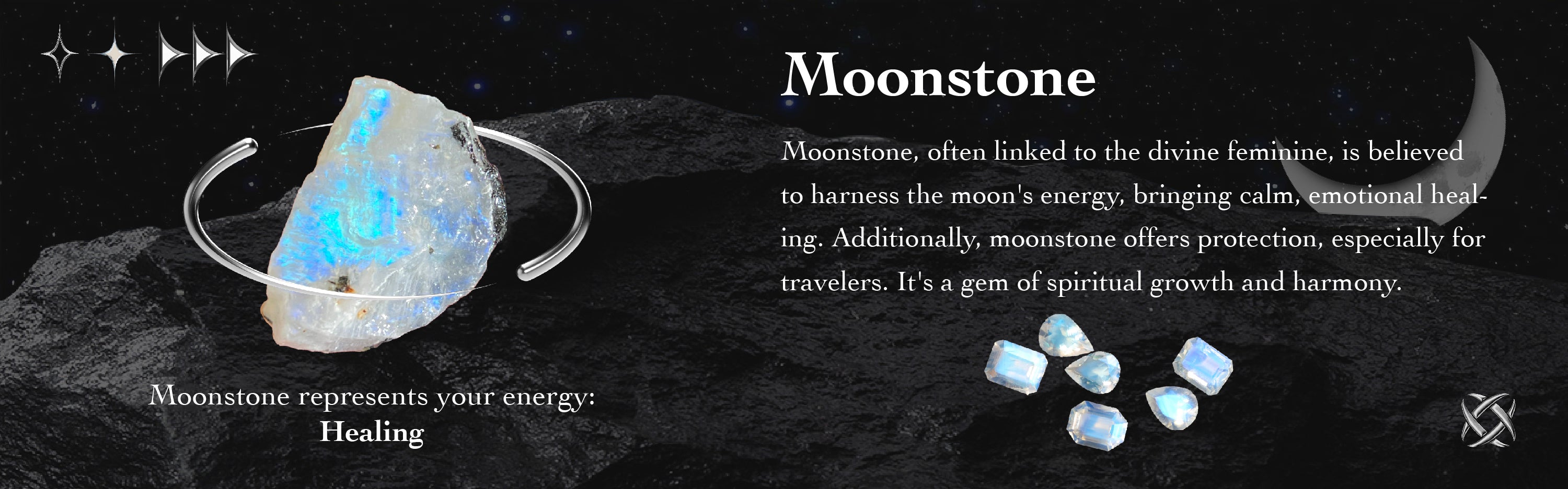 • Center Stone - Moonstone, Its unique glow, as misty and beautiful as moonlight, bringing a healing power. It also symbolizes beautiful love.
