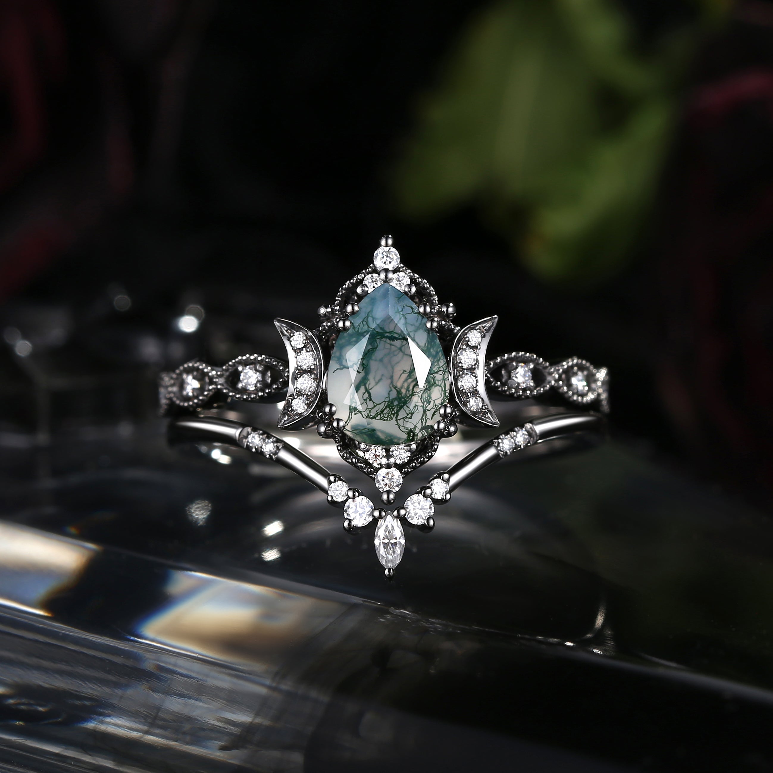 Crescent Moon | Unique Pear Shape Moss Agate Black Gold Engagement Ring Set 2pcs - Luna