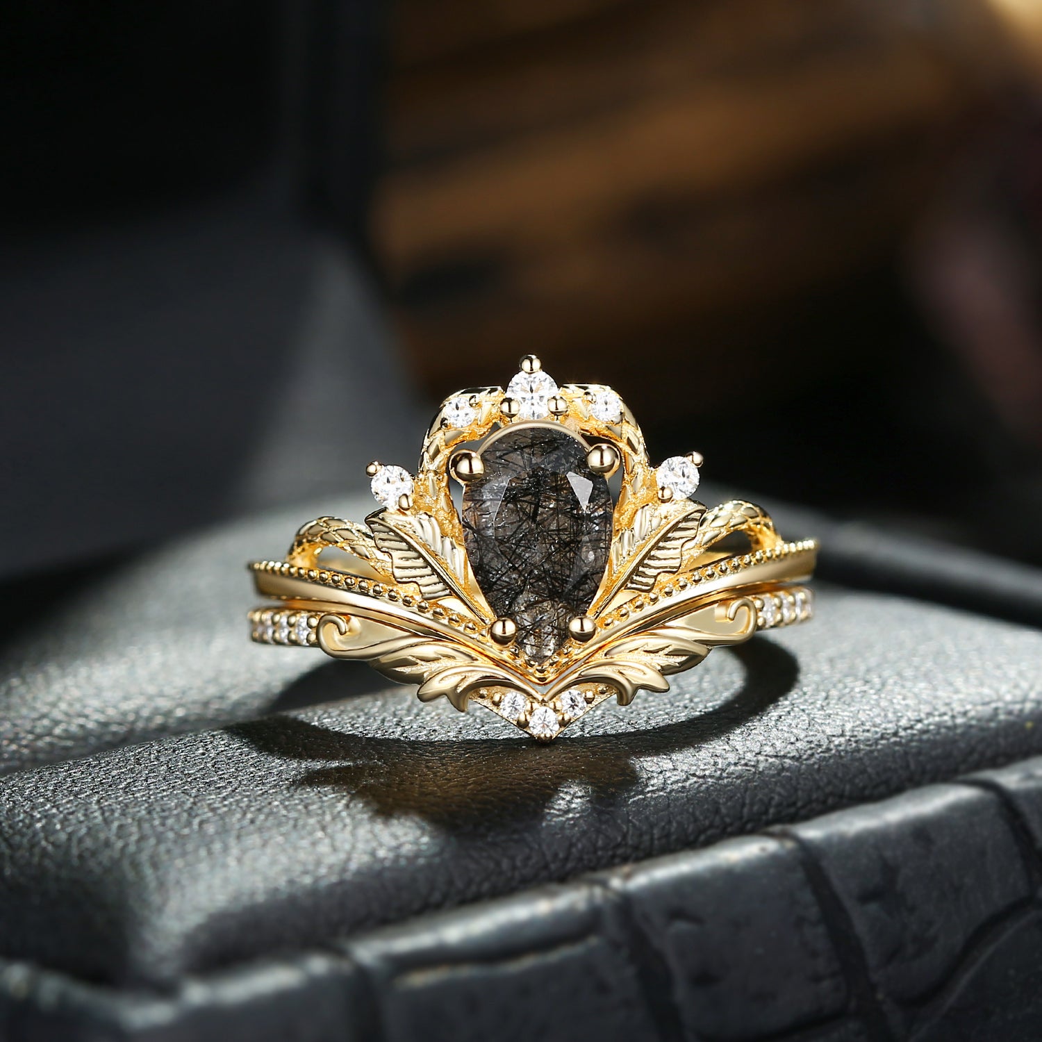 Gothic Nature Inspired Pear Cut Black Rutilated Quartz Engagement Ring Set 2pcs - Serpent's Embrace