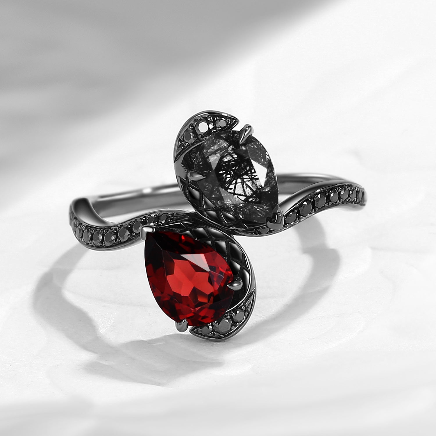 Select more'Twin Flames' Snake Pear Cut Garnet & Black Rutilated Quartz Toi et Moi Gold Engagement Ring - Serpent's Embrace