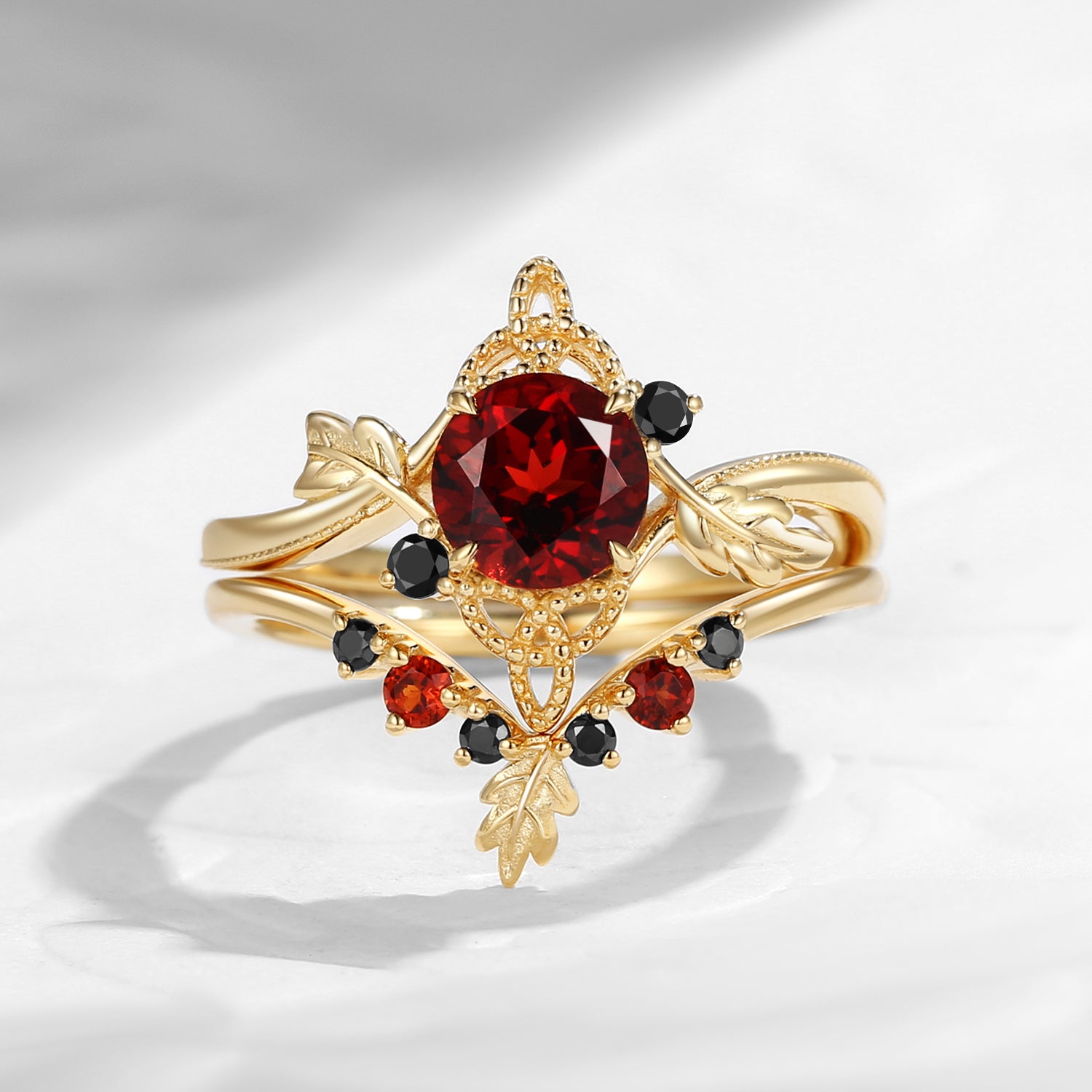 Celtic Calendar | 12.24-1.20 | Round Cut Garnet Nature Inspired Birch Leafy Celtic Ring Set 2pcs