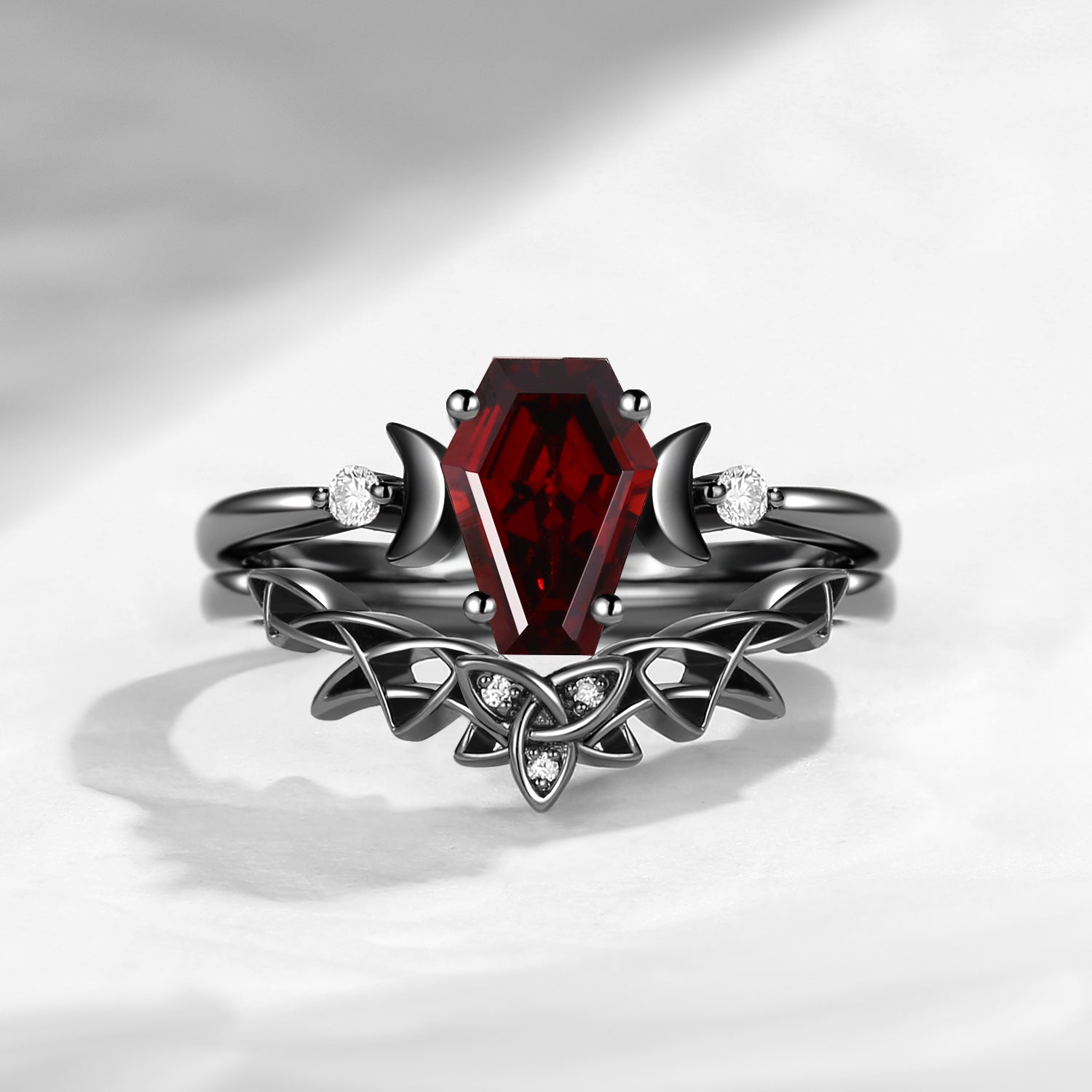 Celtic Moon | Coffin Cut Garnet Celtic Gothic Engagement Ring Set 2pcs