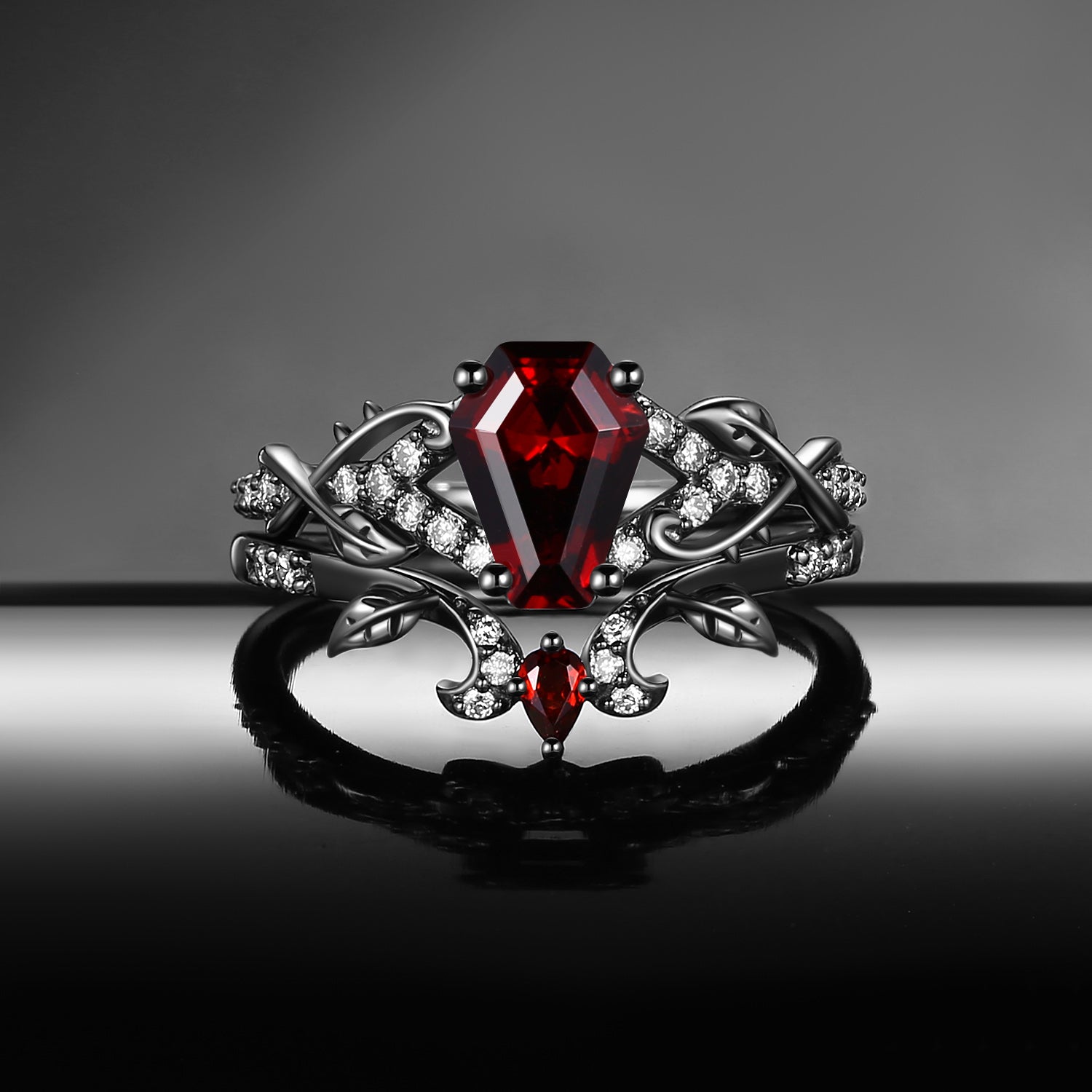 Gothic 'Thorns & Roses' Coffin Shaped Garnet Nature Inspired Engagement Ring Set 2pcs
