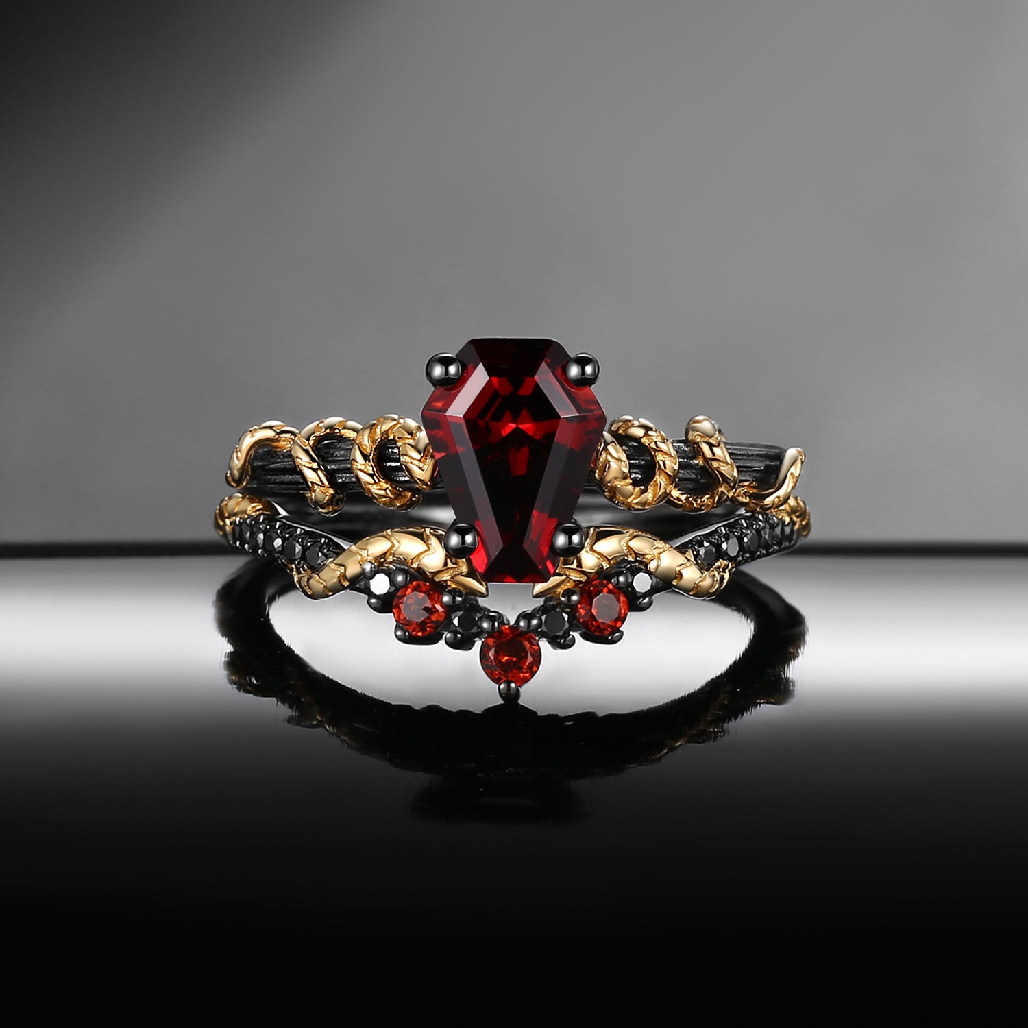 Gothic Twist Coffin Cut Garnet Two-Tone Gold Engagement Ring Set 2pcs - Serpent's Embrace