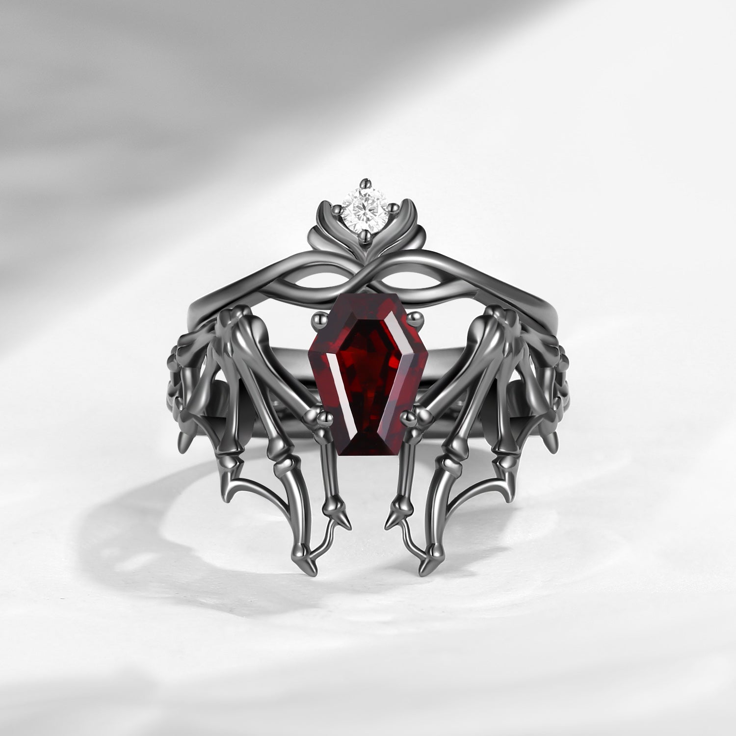Non-Traditional Coffin Moissanite Vampire Black Gold Ring Set 2pcs - Bat Ring