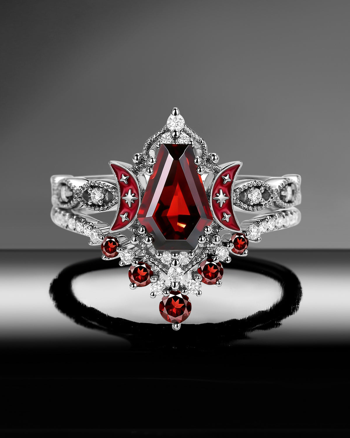 Crescent Moon | Coffin Cut Garnet Red Enamel 'Ultra Celestial' Ring Set 2pcs