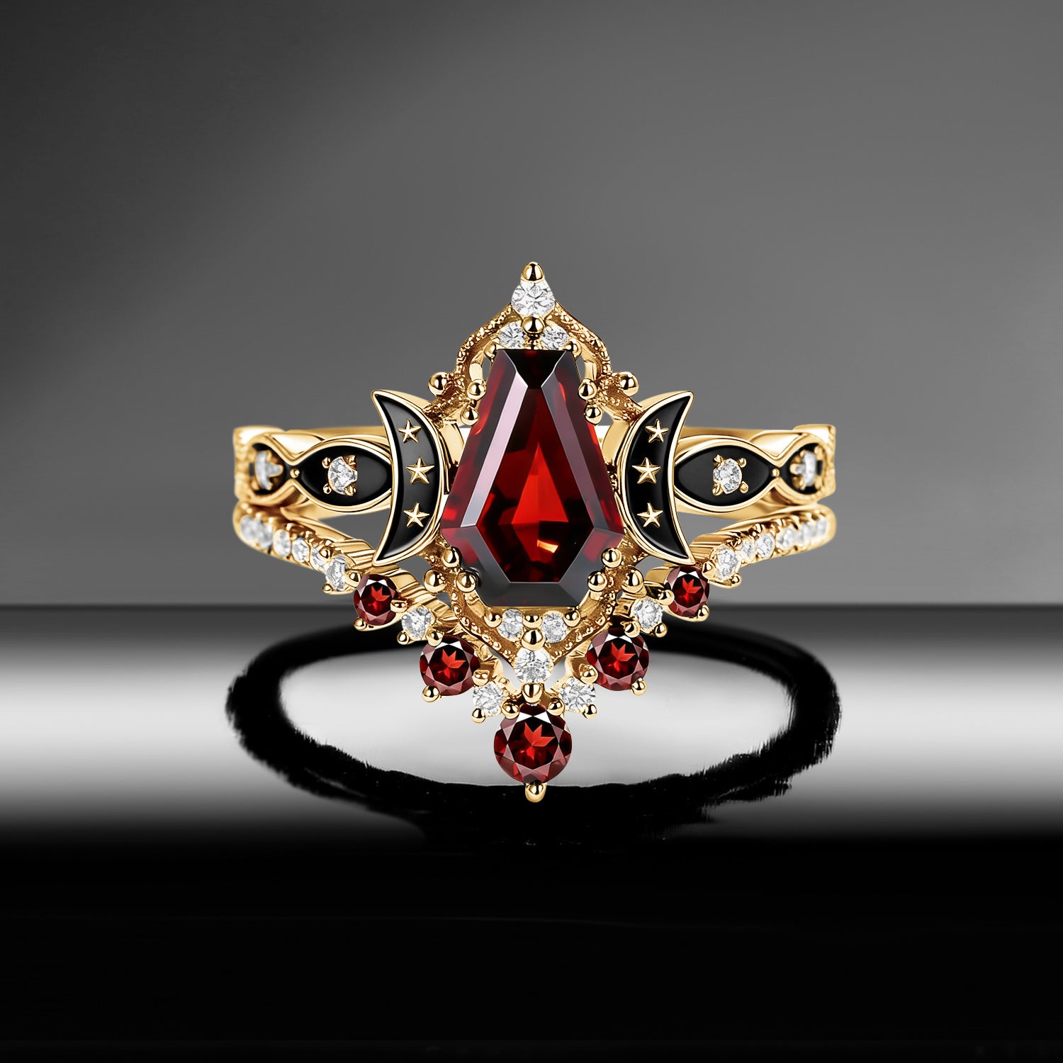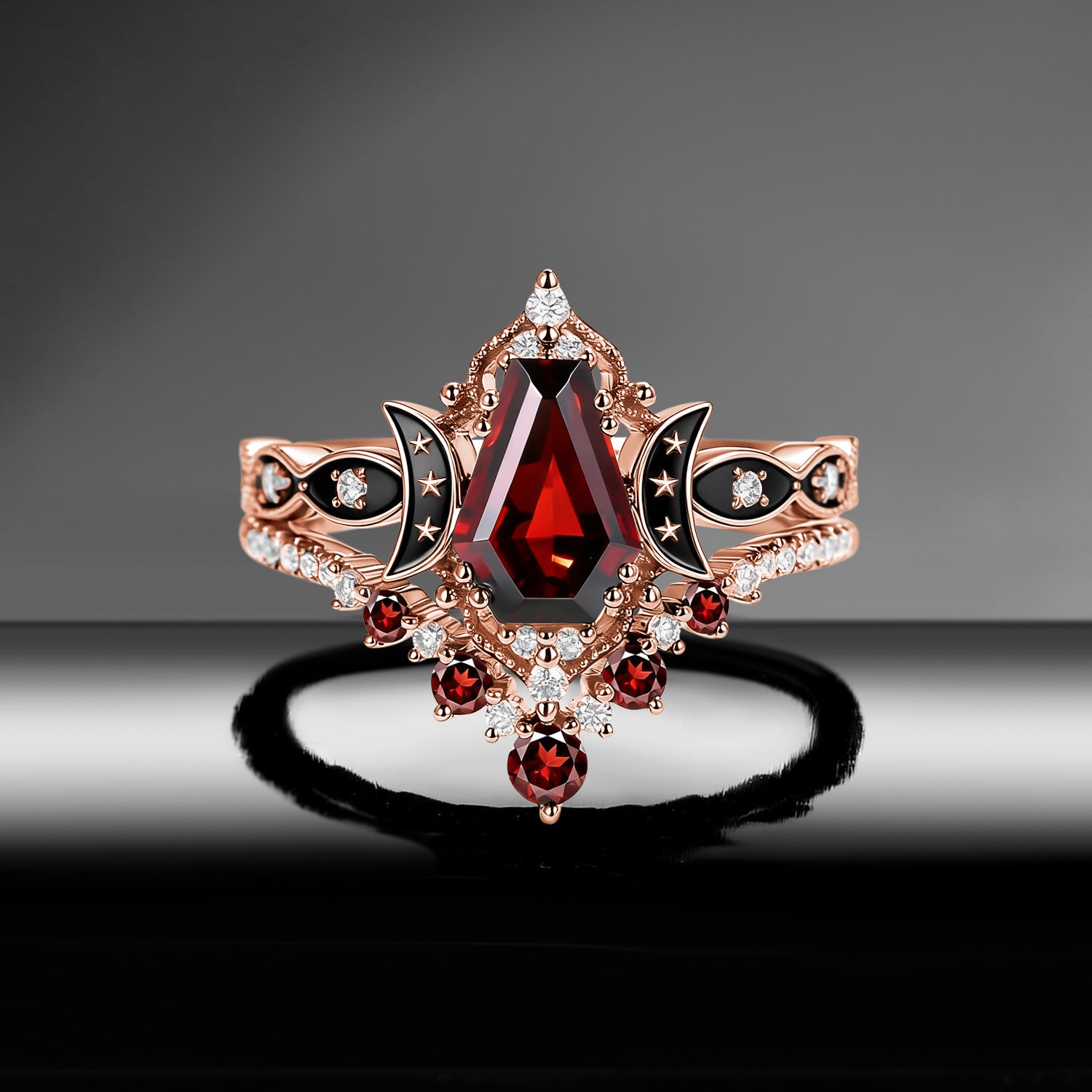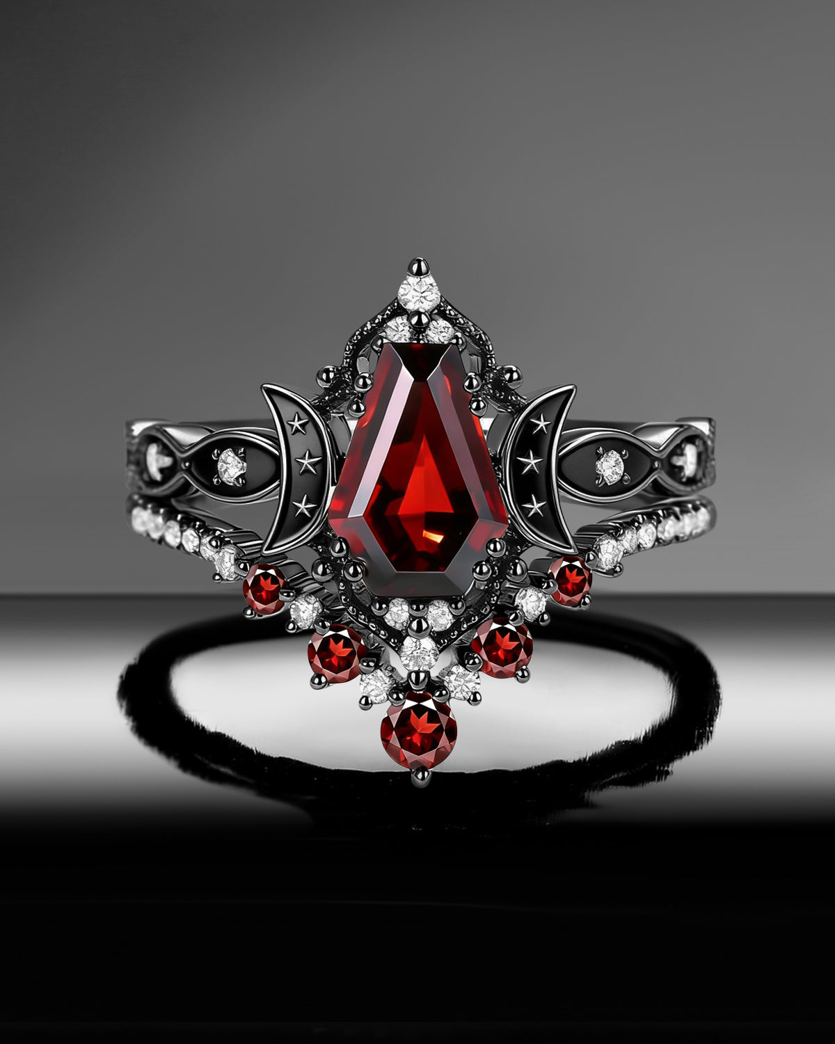 Crescent Moon | Unique Coffin Cut Garnet Celtic Moon Engagement Ring Set 2pcs