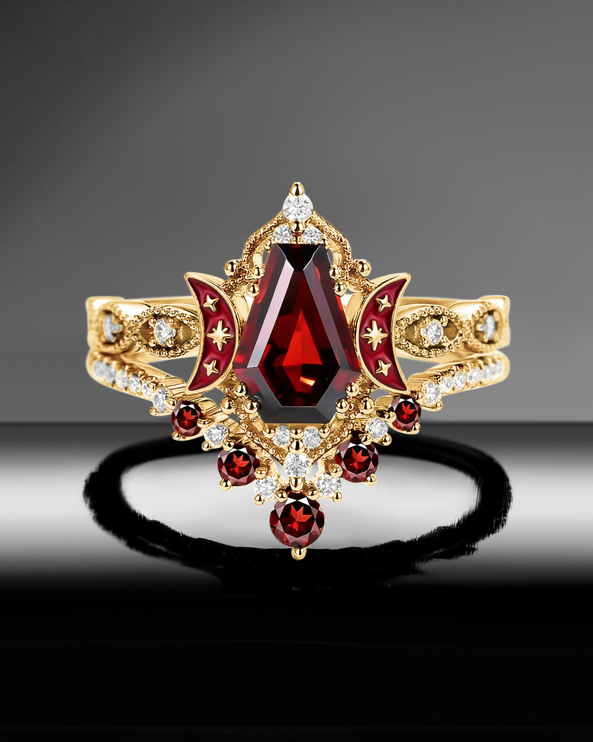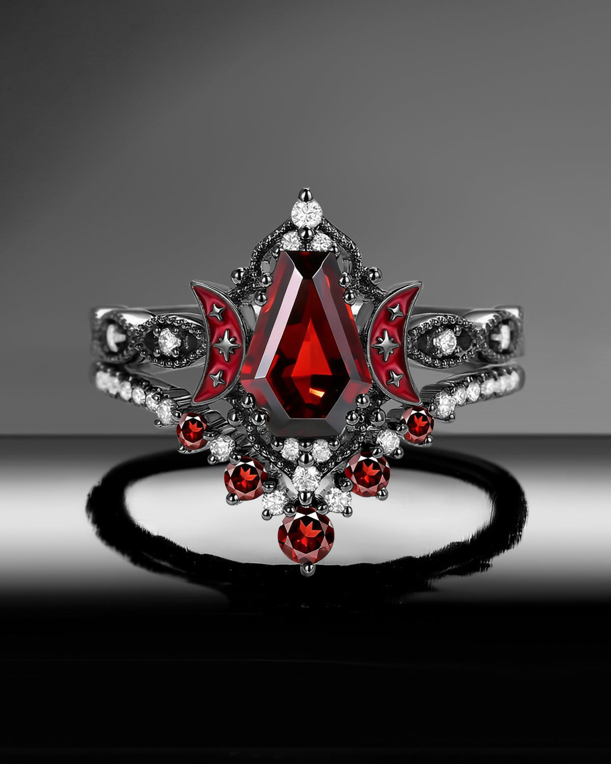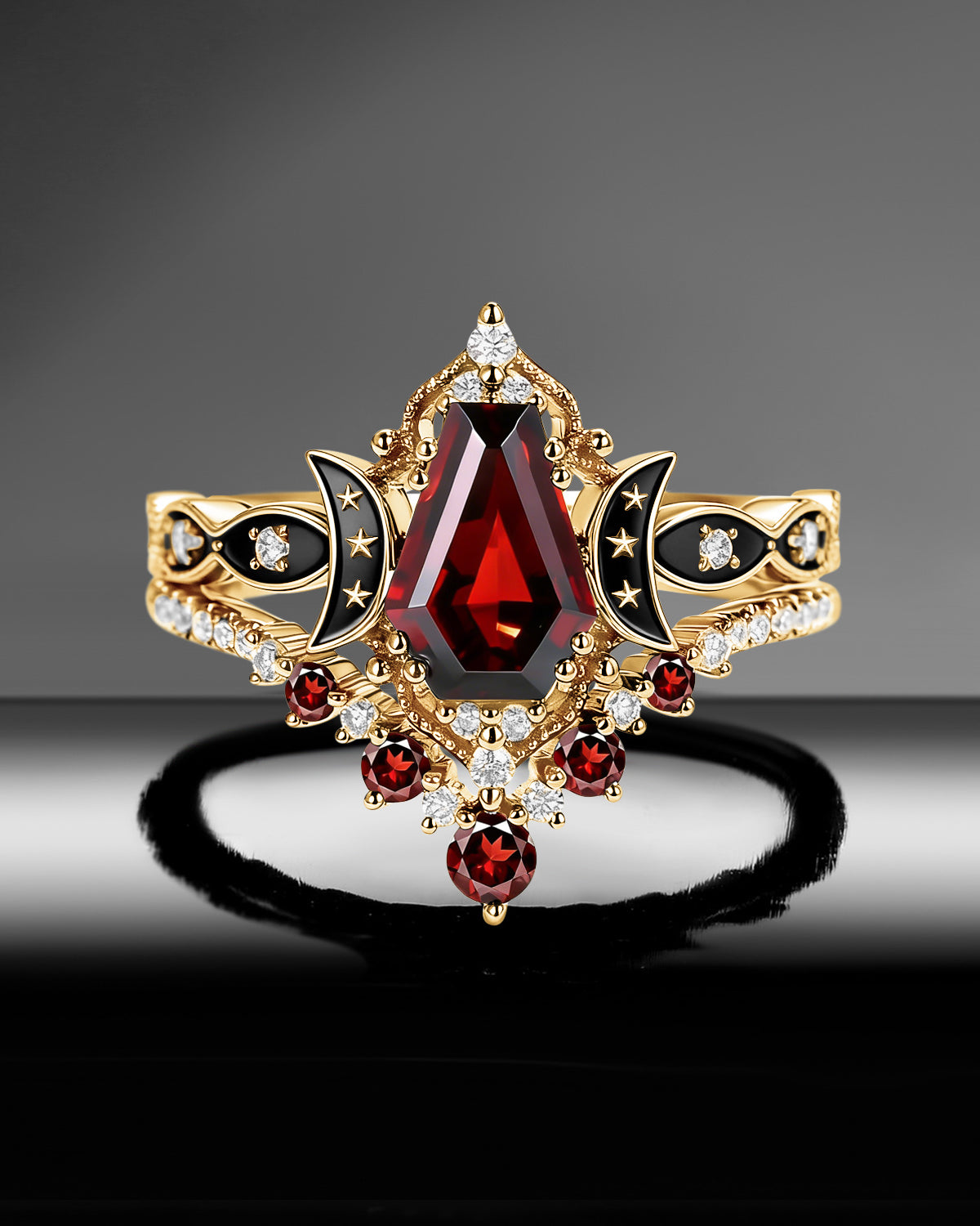 Crescent Moon | Unique Coffin Cut Garnet Celtic Moon Engagement Ring Set 2pcs