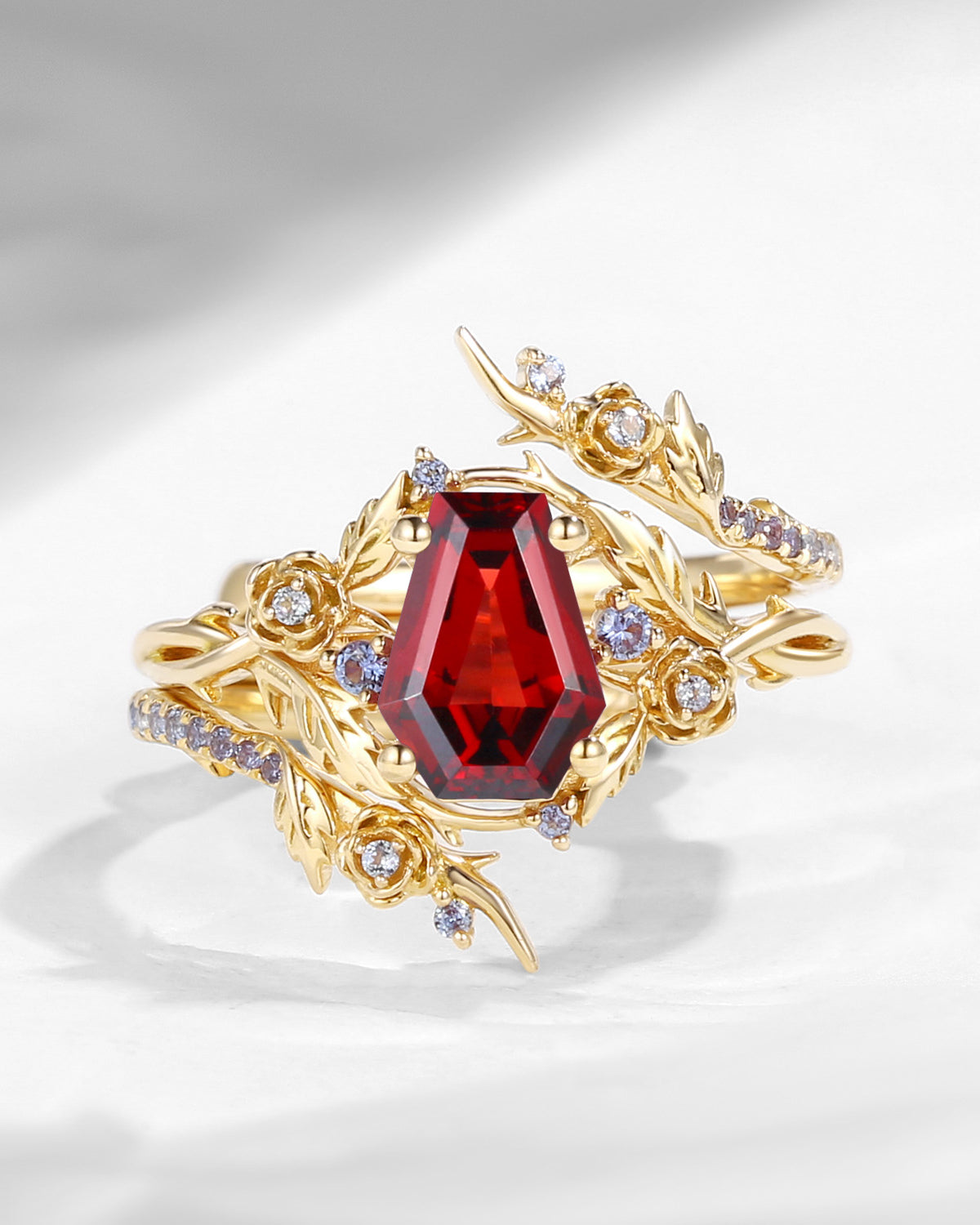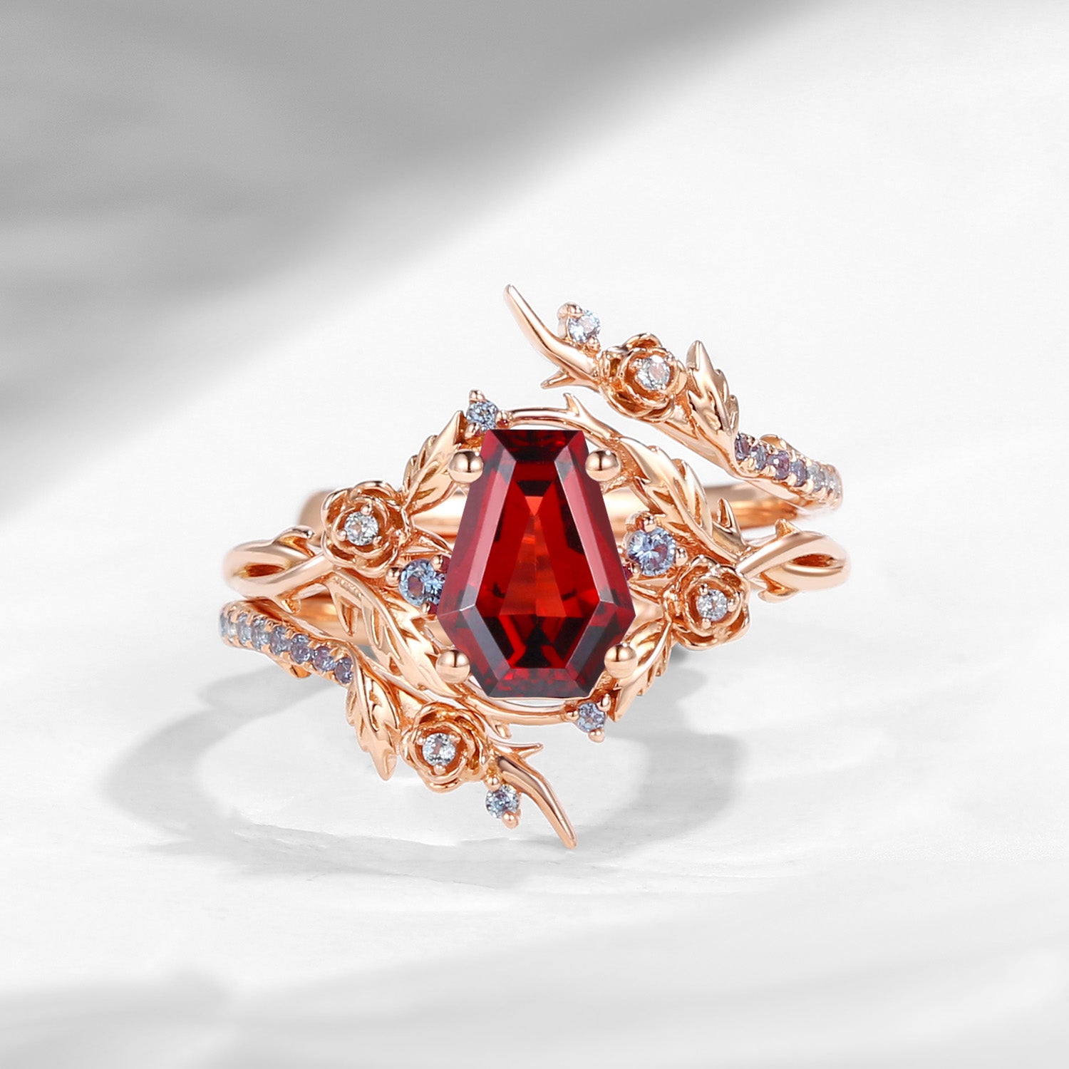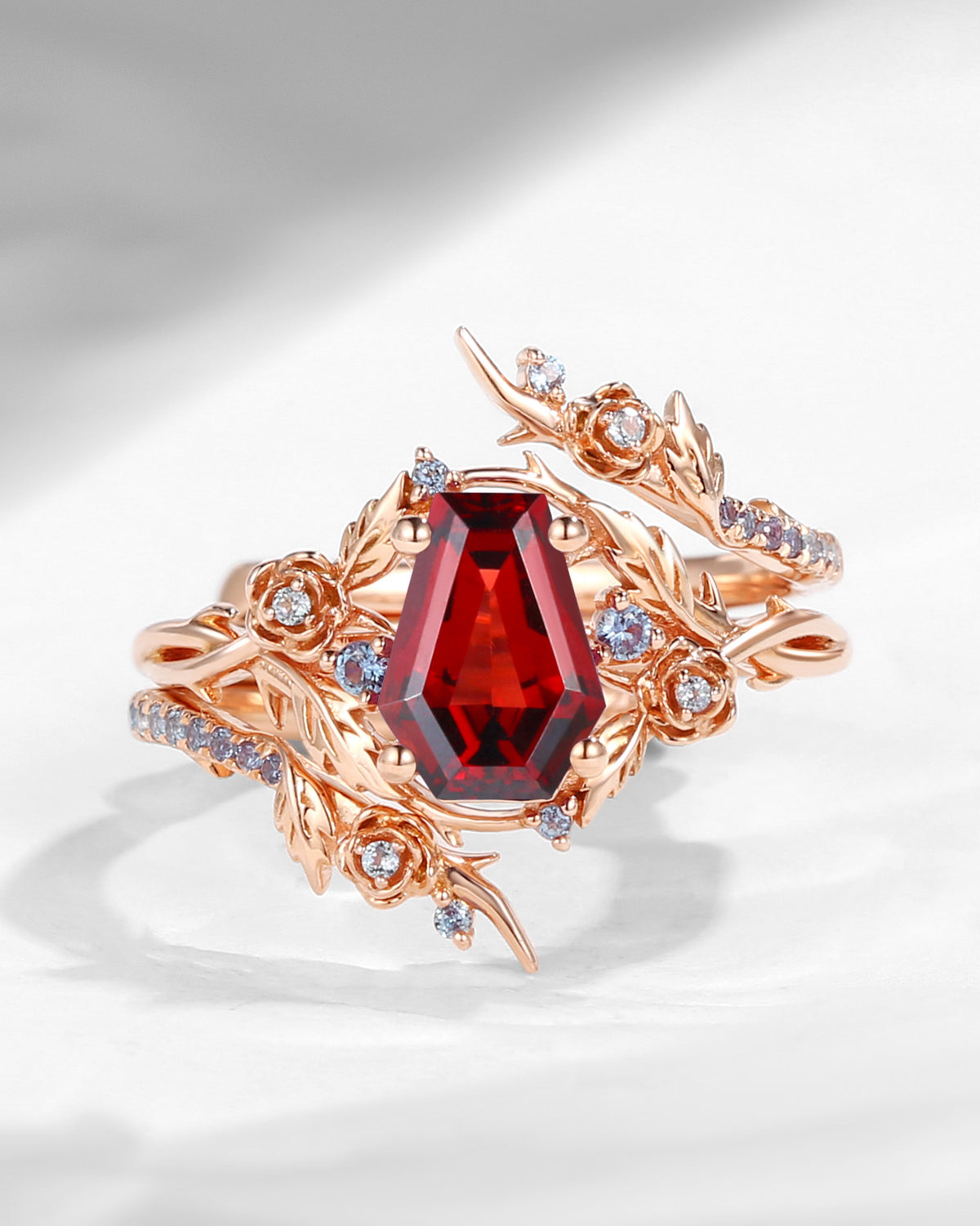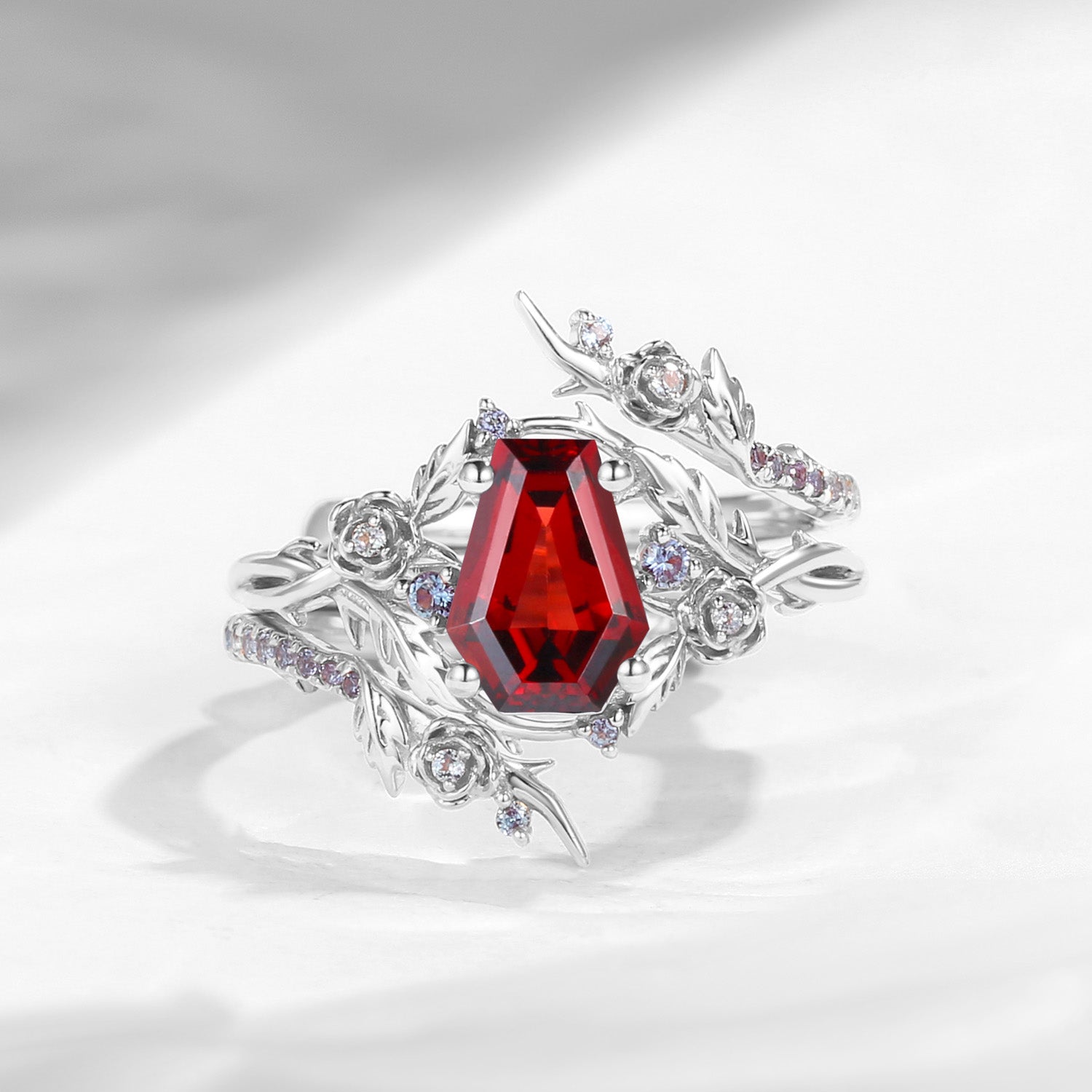 Unique Coffin Garnet Gothic Rose Flower Engagement Ring Set 3pcs
