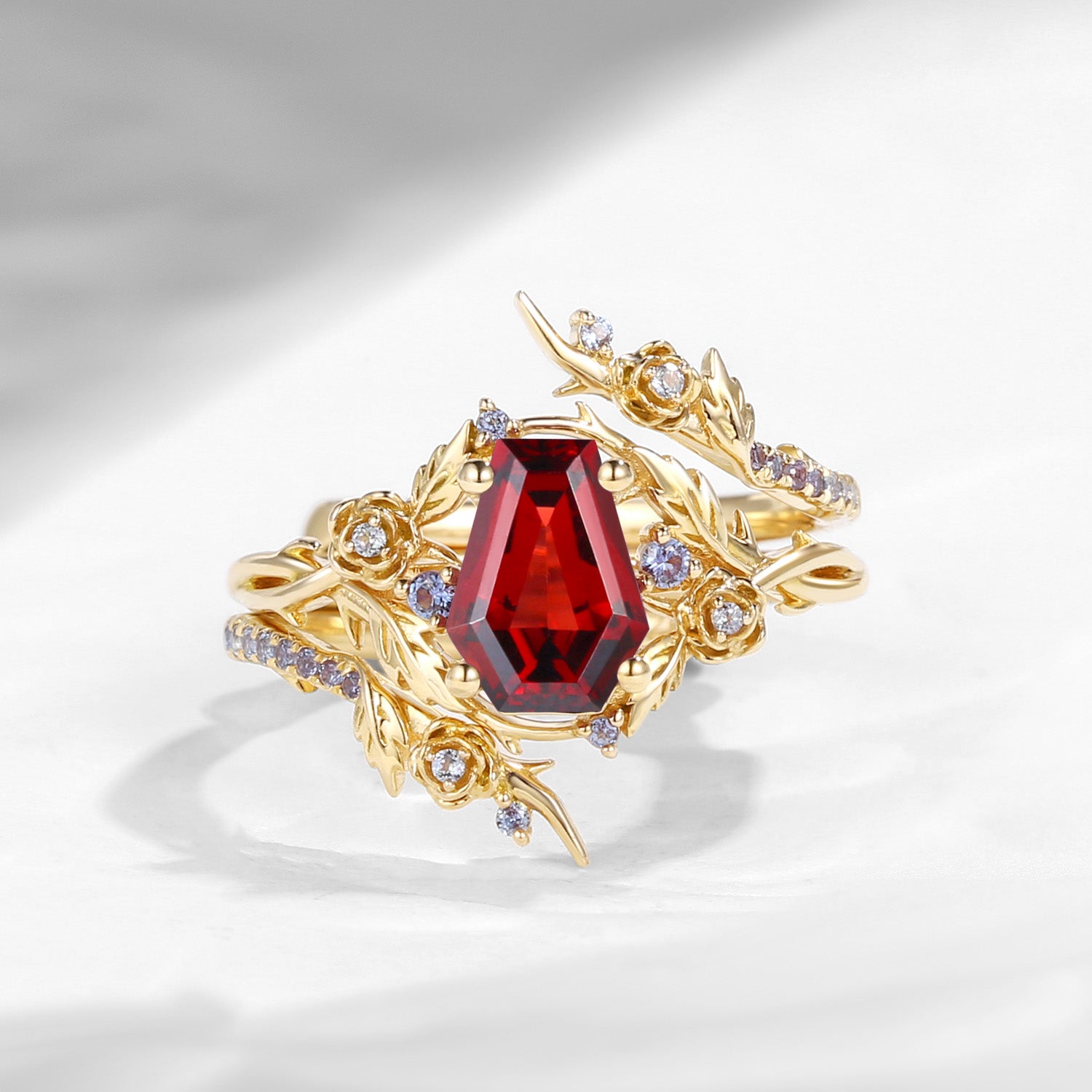 Nature Inspired Twist Coffin Cut Garnet Engagement Ring Set 2pcs
