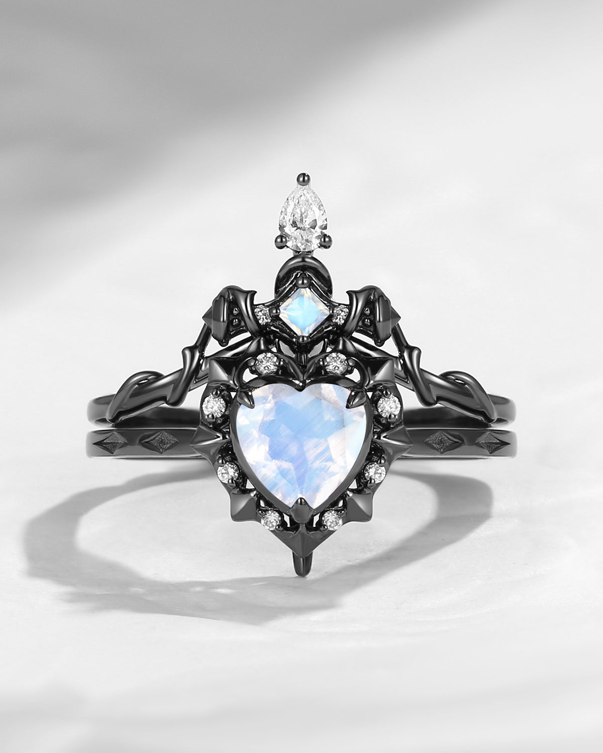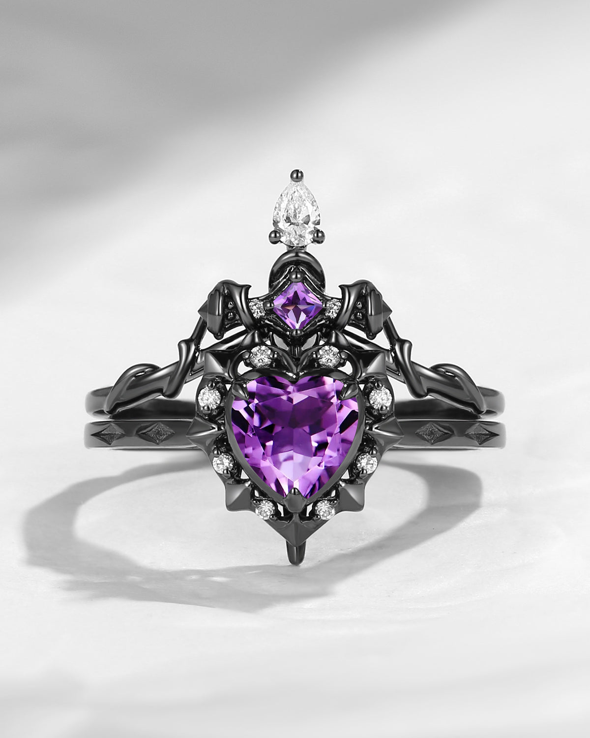Gothic 'Cupid's Arrow' Heart Garnet Black Gold Engagement Ring & Devil Wing Inspired Couple Necklaces Set