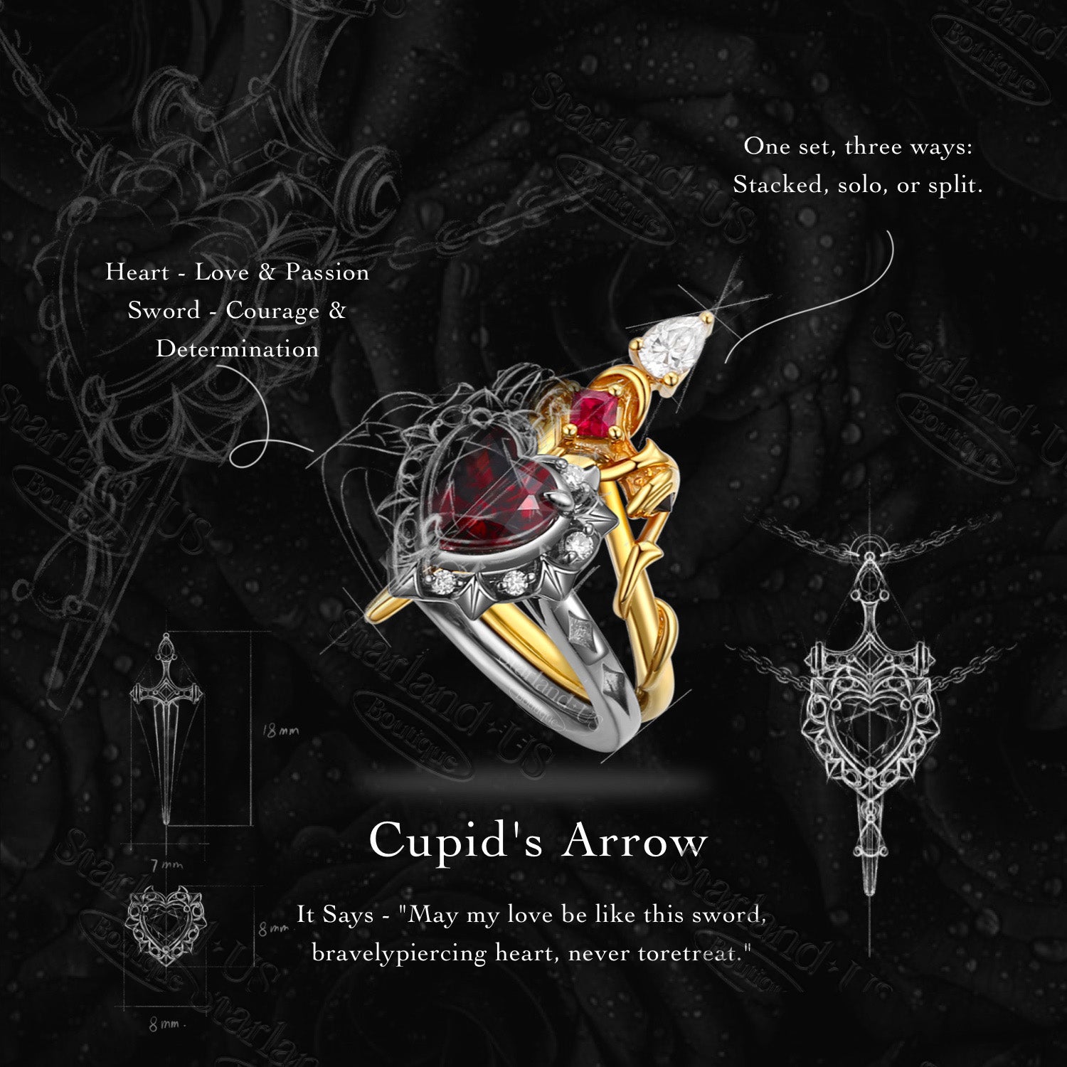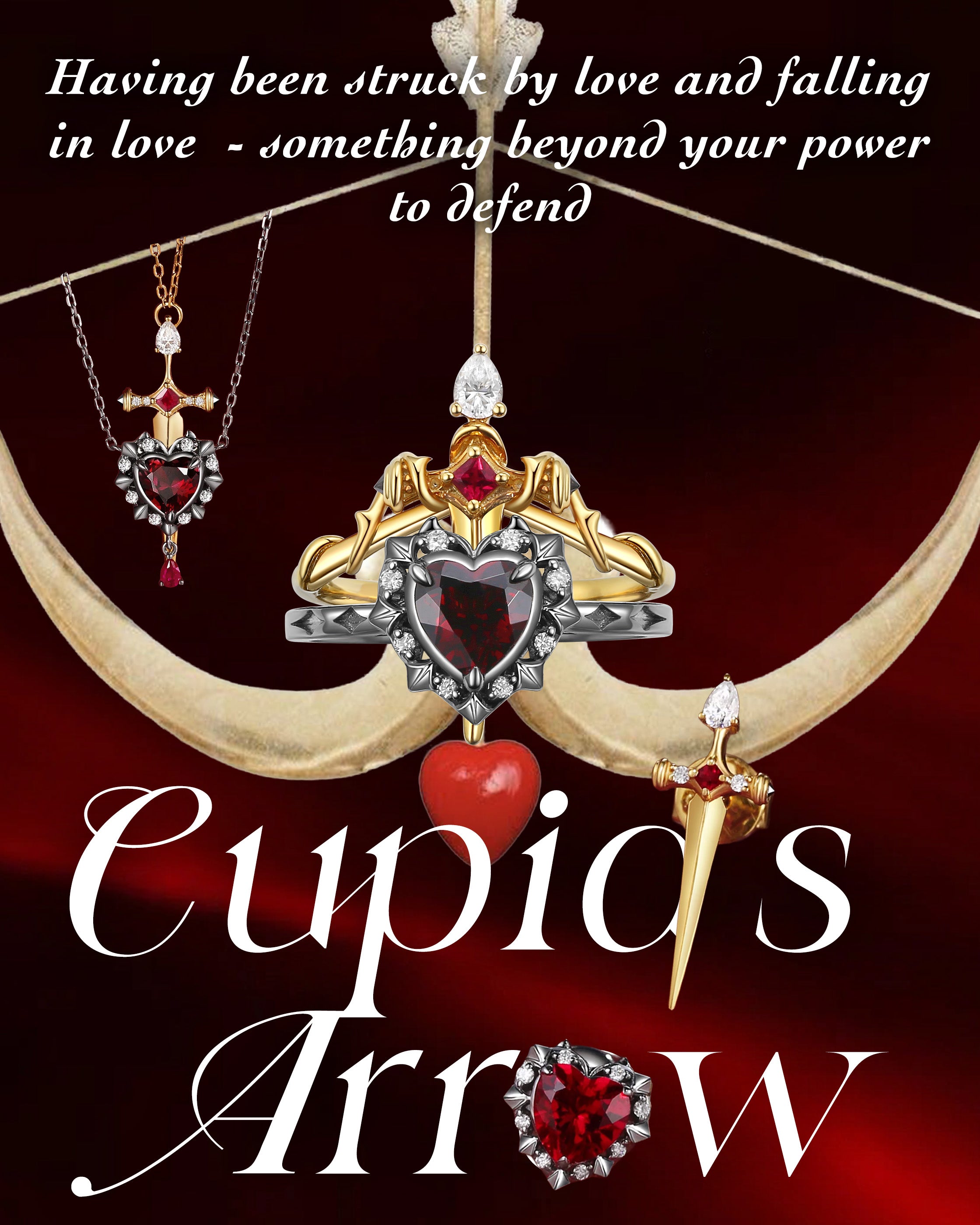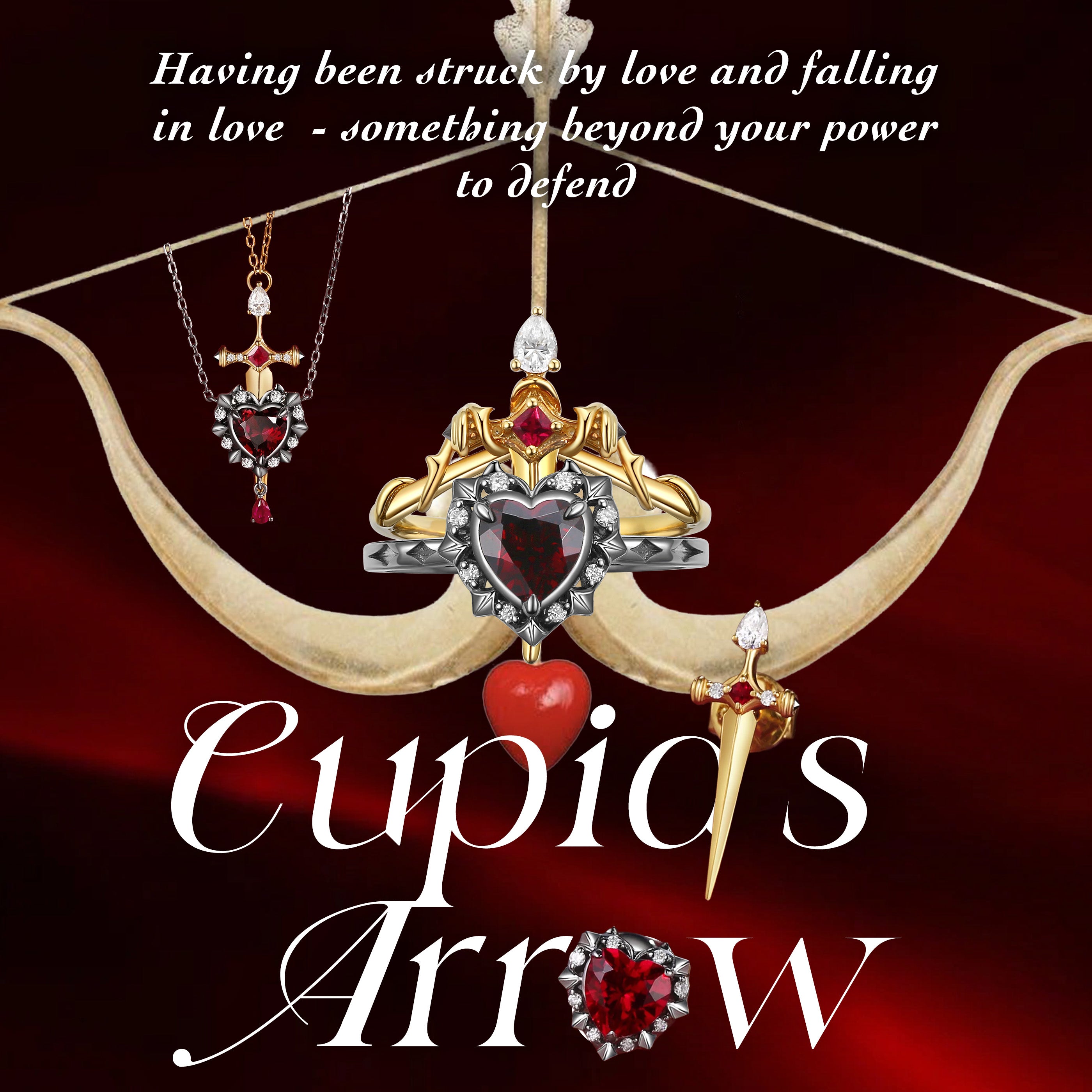Unique Heart Shaped Garnet Sword Ring Bridal Set 2pcs - Cupid's Arrow