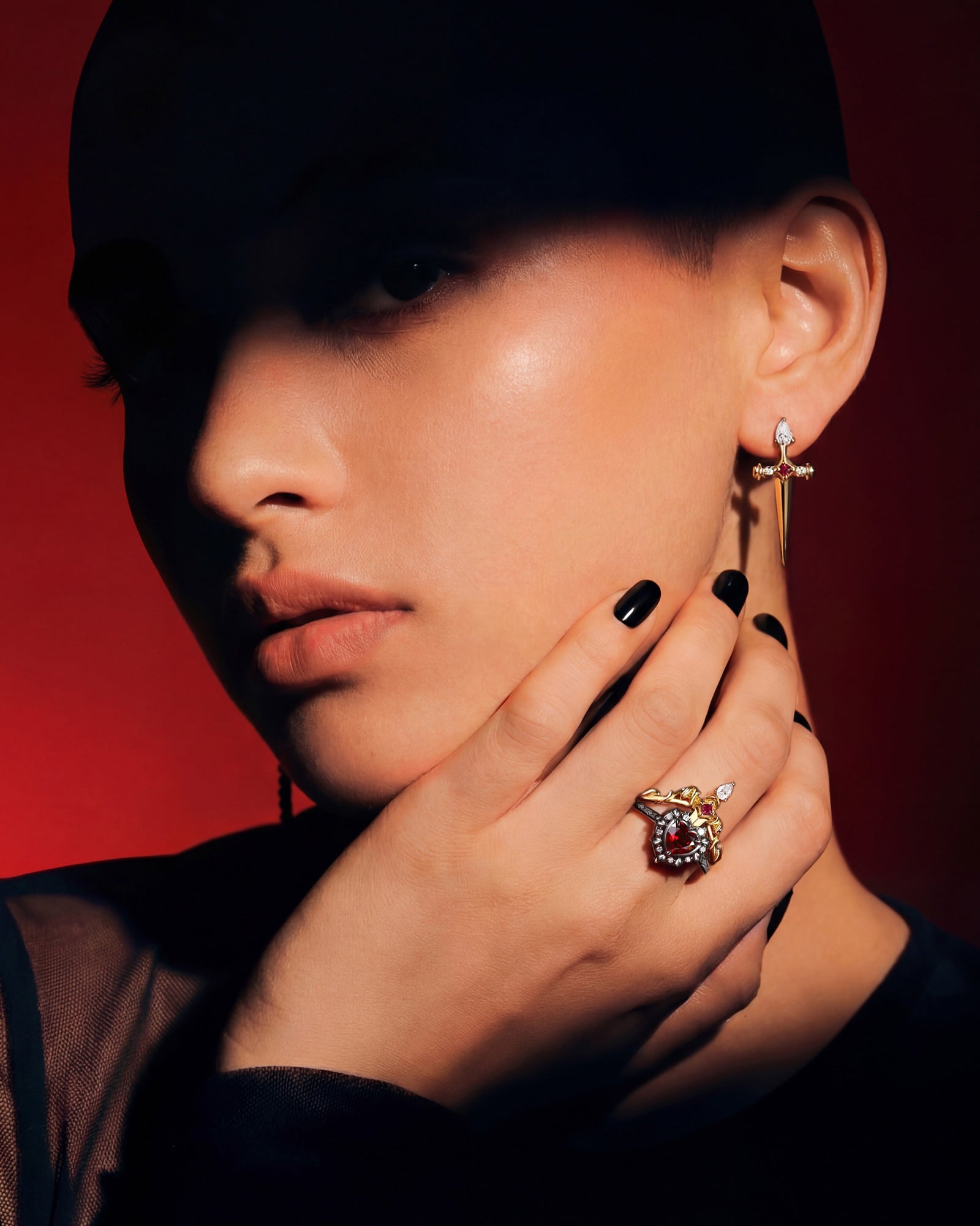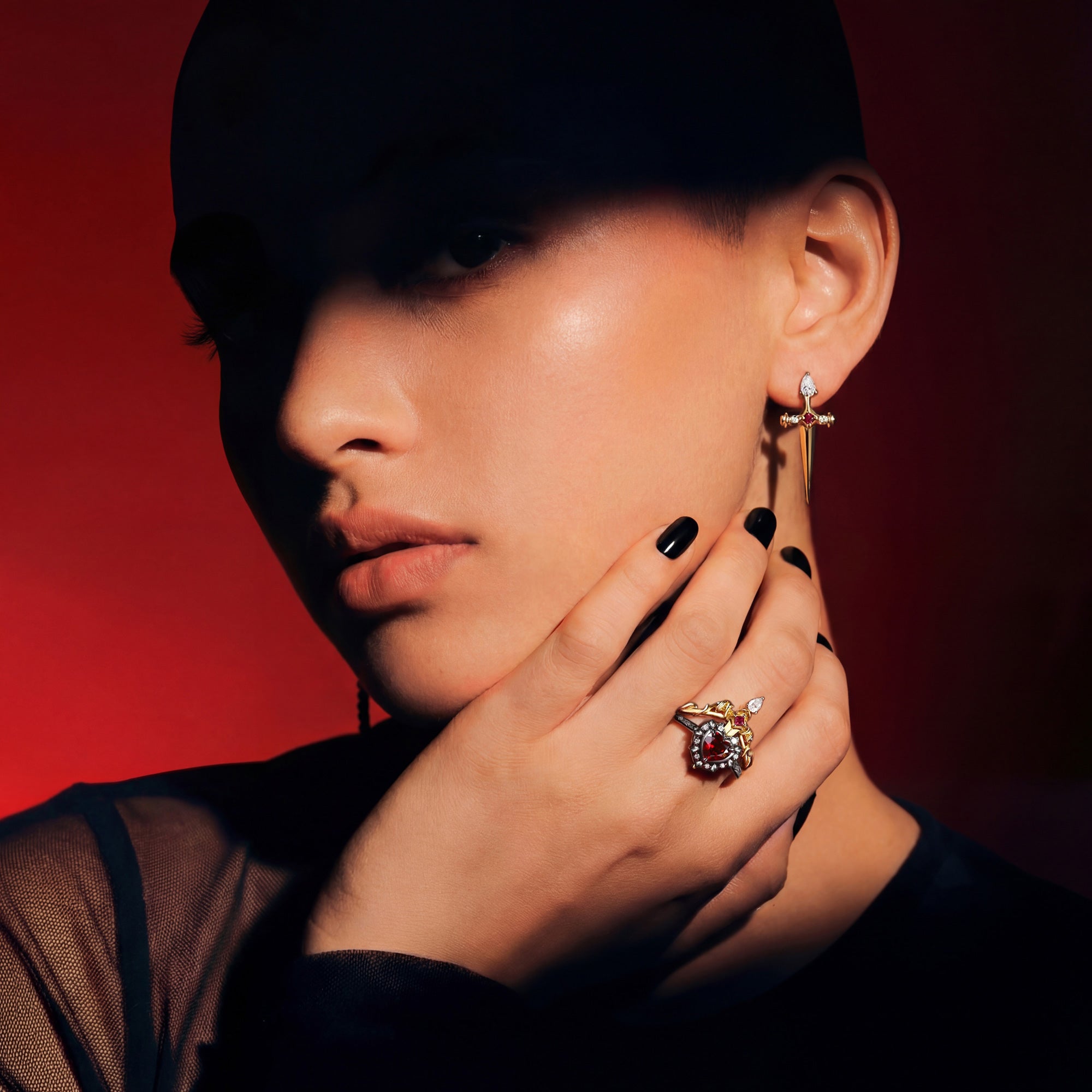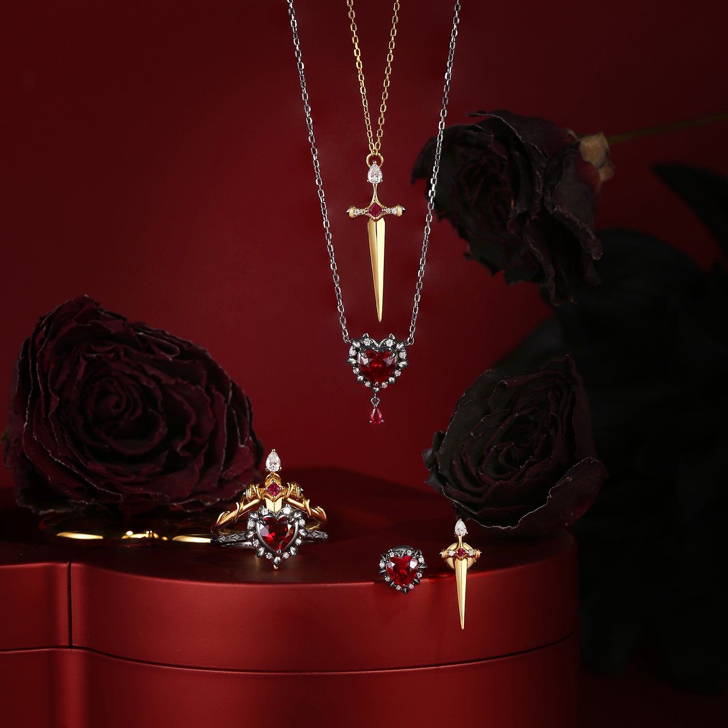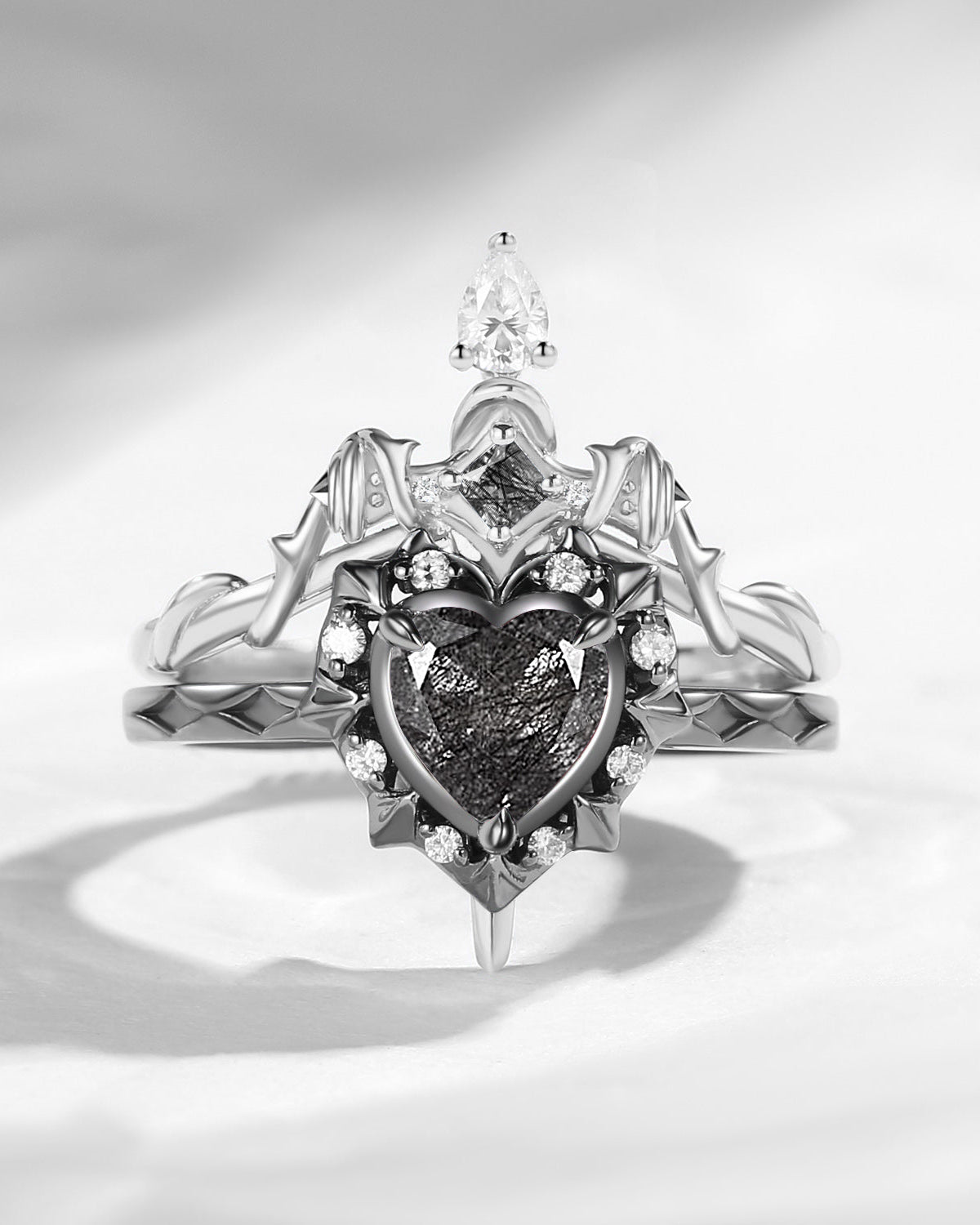 Unique Heart Shaped Garnet Sword Ring Bridal Set 2pcs - Cupid's Arrow