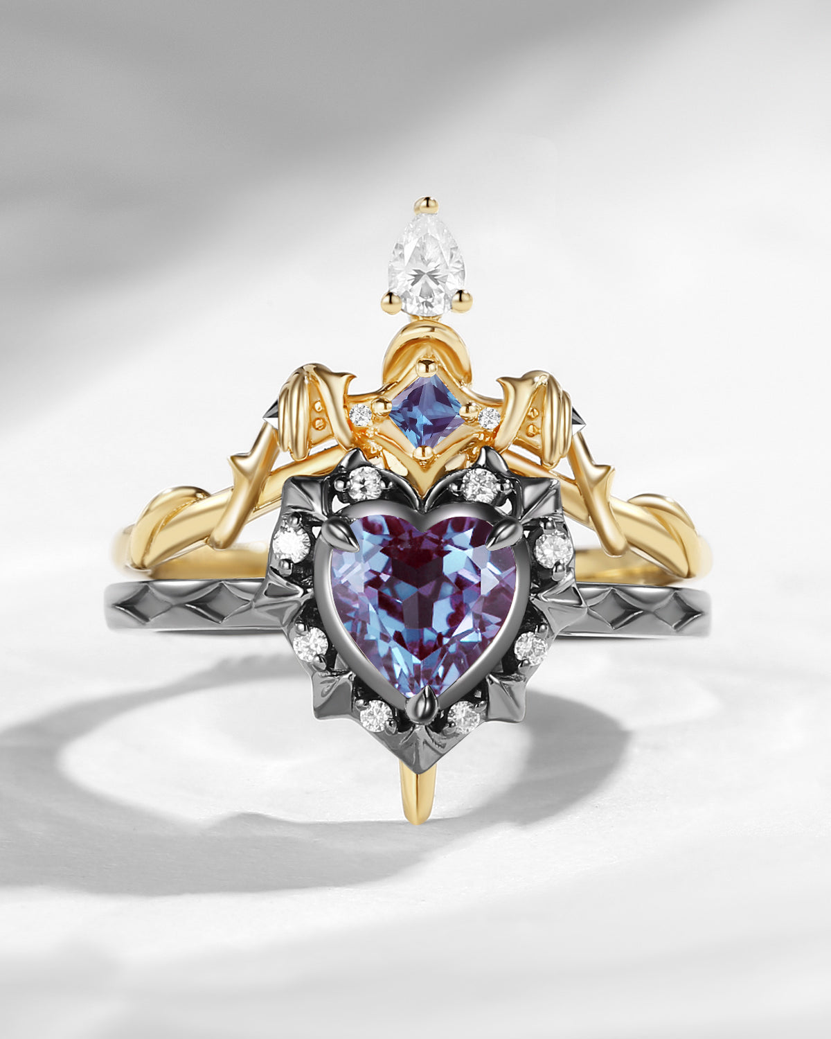 Crescent Moon | 18K Heart Shaped Lab Alexandrite Engagement Ring Set 2pcs - Luna