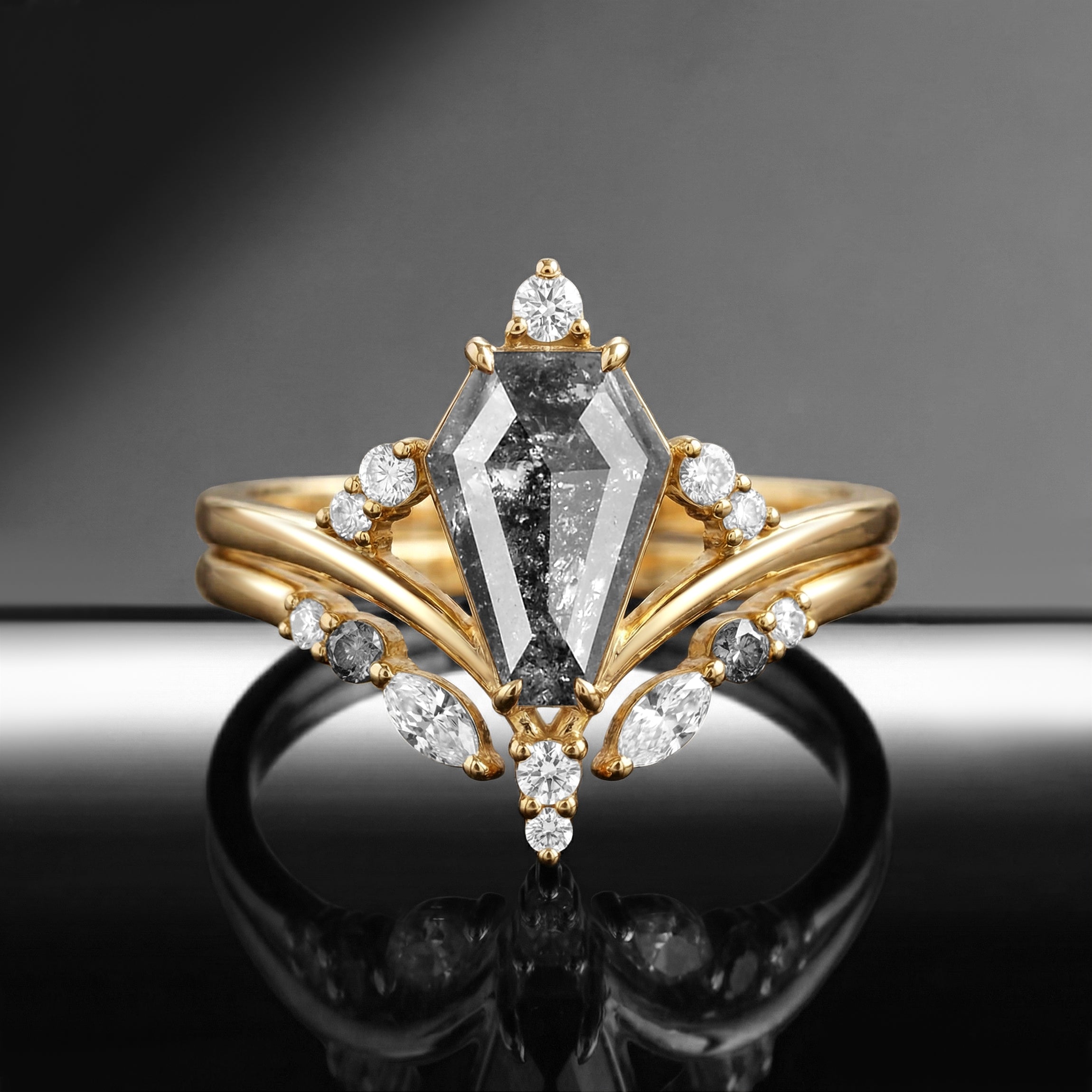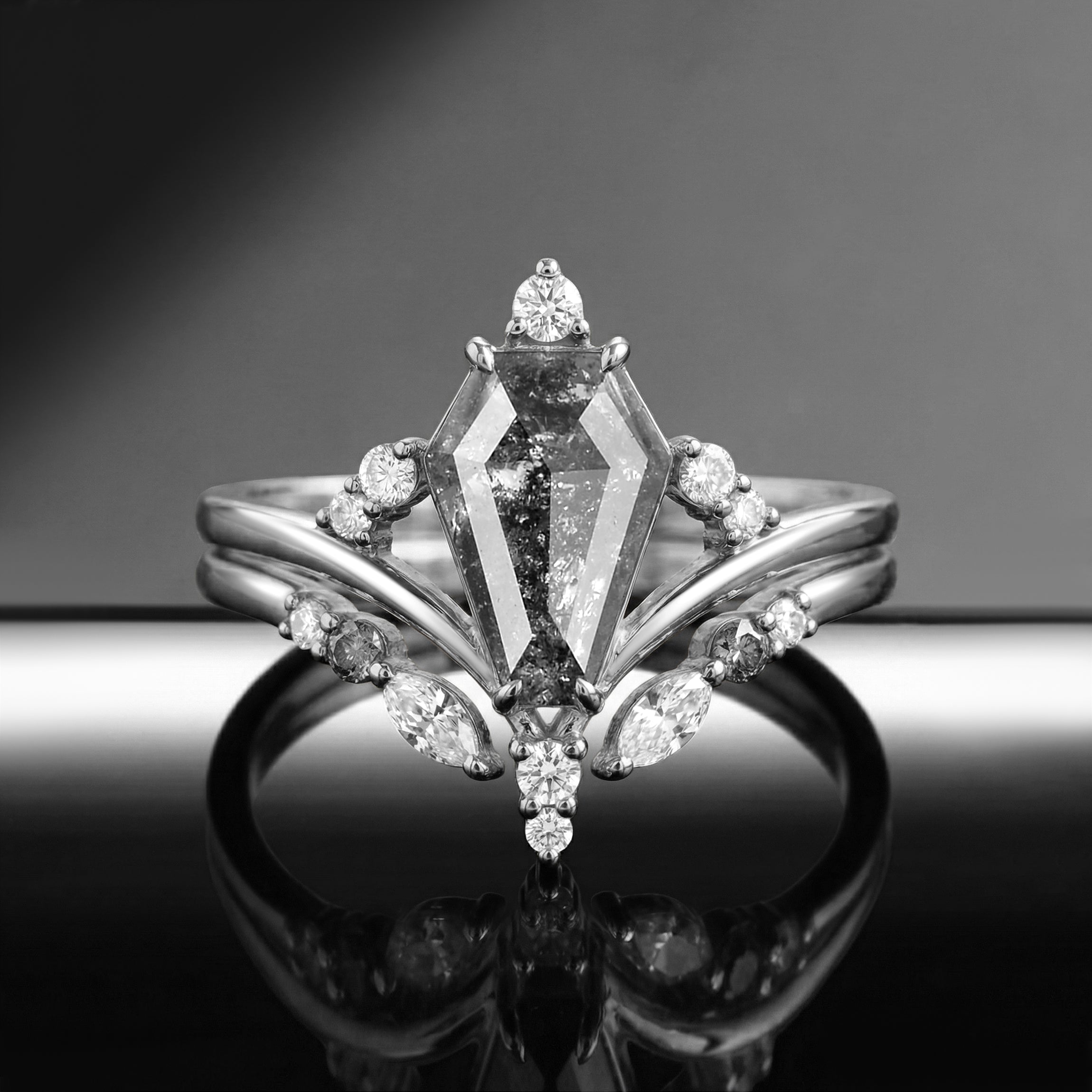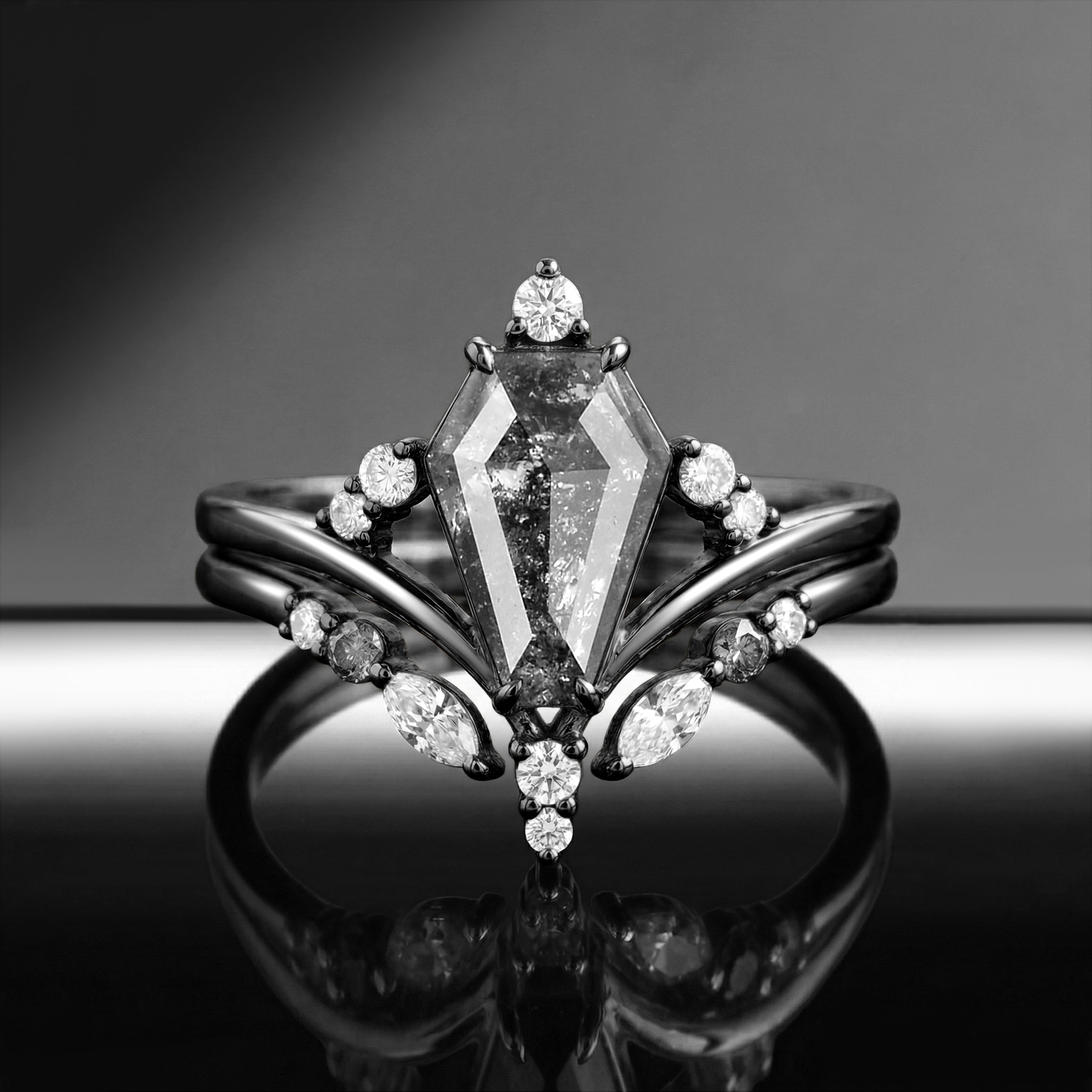 Coffin Cut Salt & Pepper Diamond Art-Deco Engagement Ring Set 2pcs - Loren