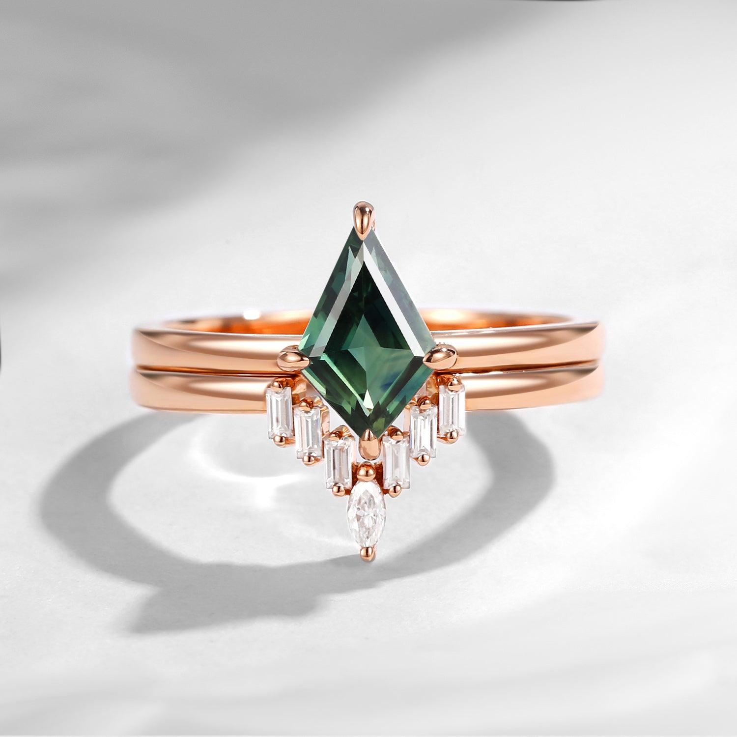 18K Kite Shaped Natural Teal Sapphire Engagement Ring Set 2pcs