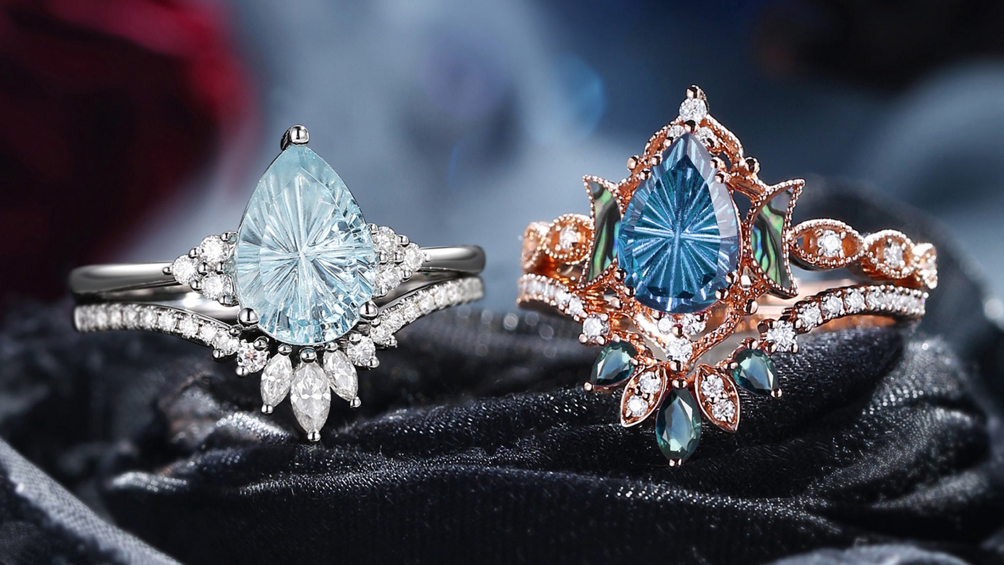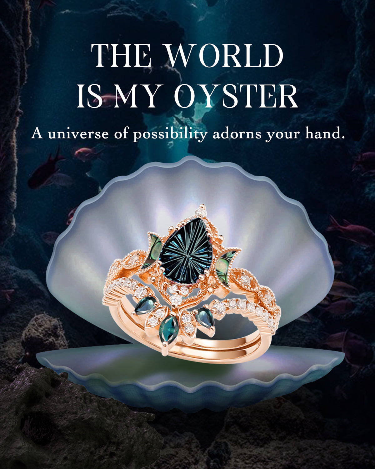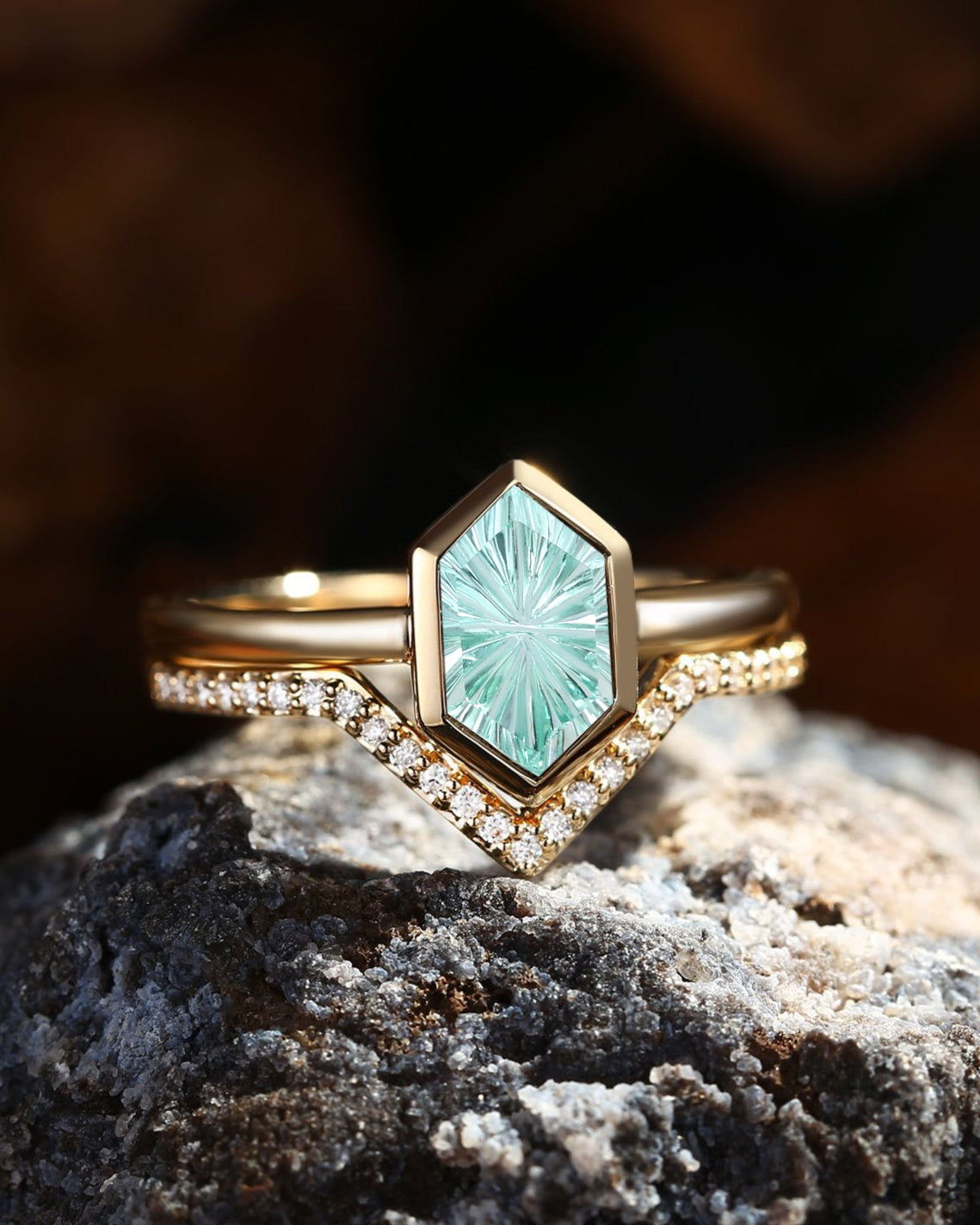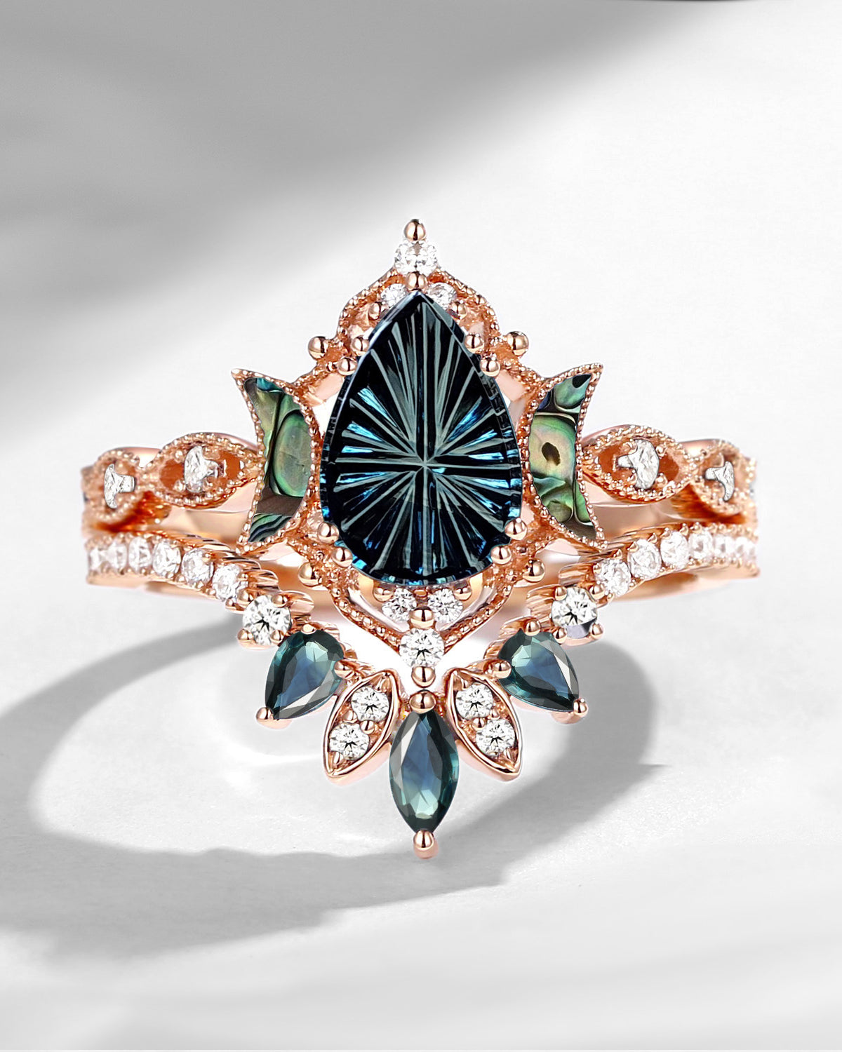 Firework Cut Natural Teal Sapphire Engagement Ring Set 2pcs - Ultra Galaxy