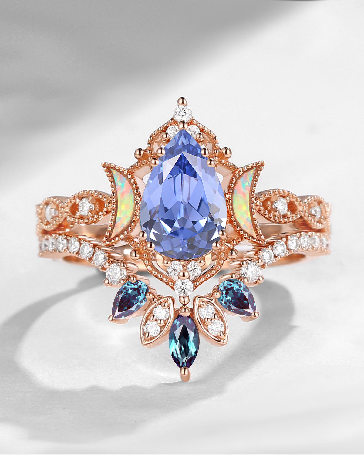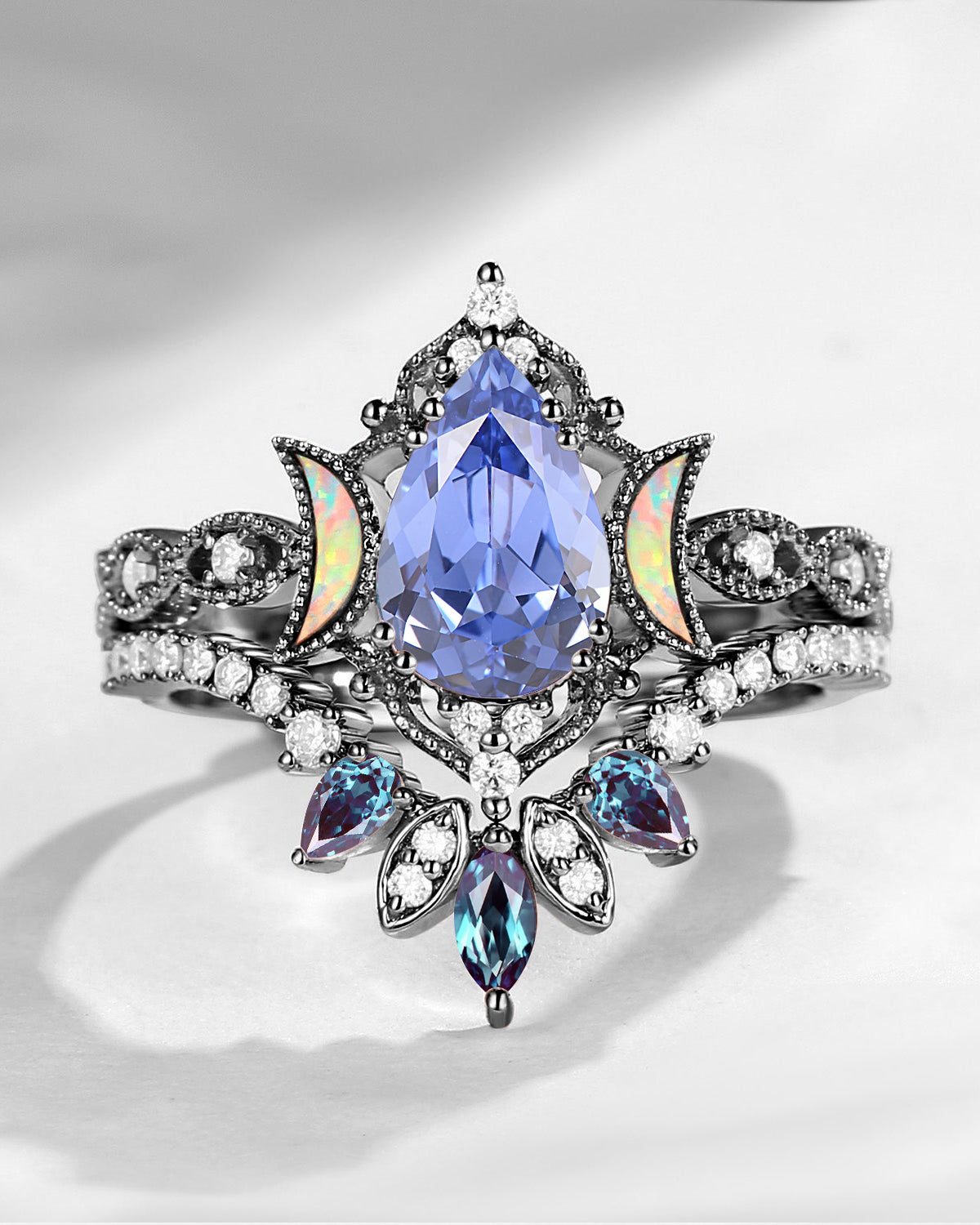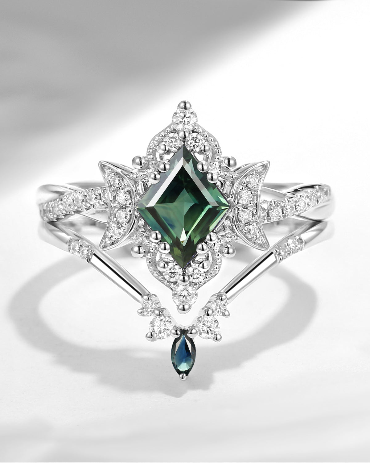 Crescent Moon | Unique Kite Cut Infinity Natural Teal Sapphire Ring Set 2PCS