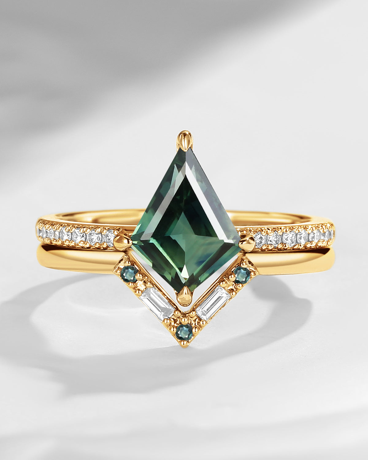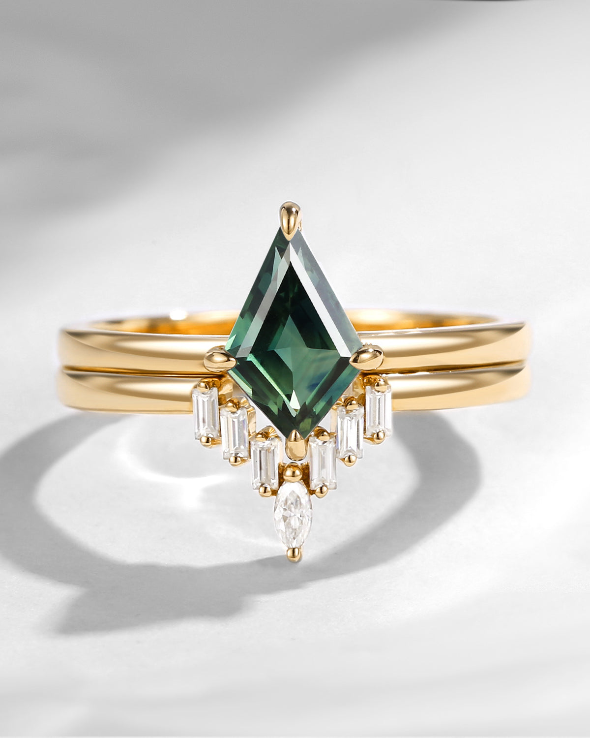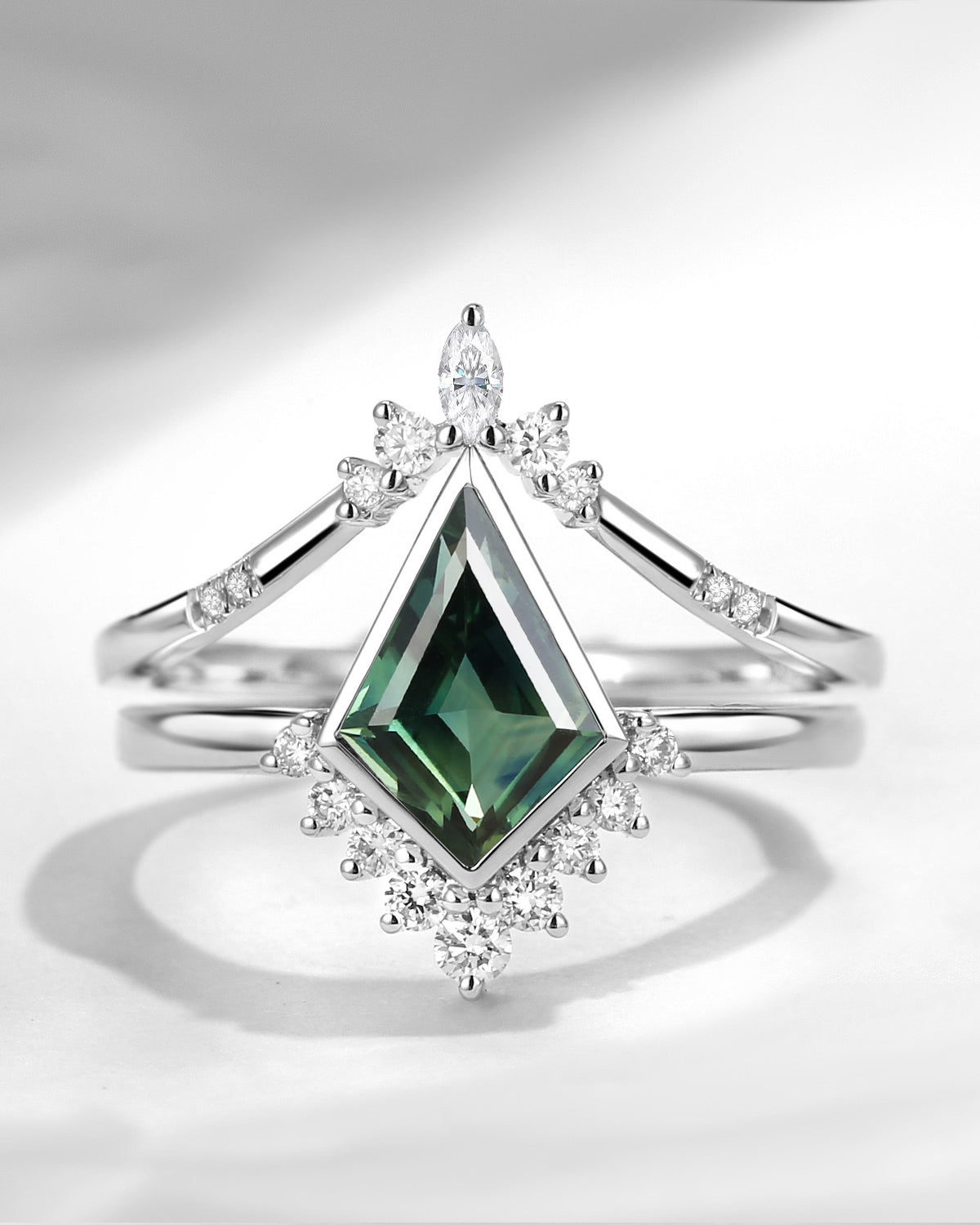 18K Kite Shaped Natural Teal Sapphire Engagement Ring Set 2pcs