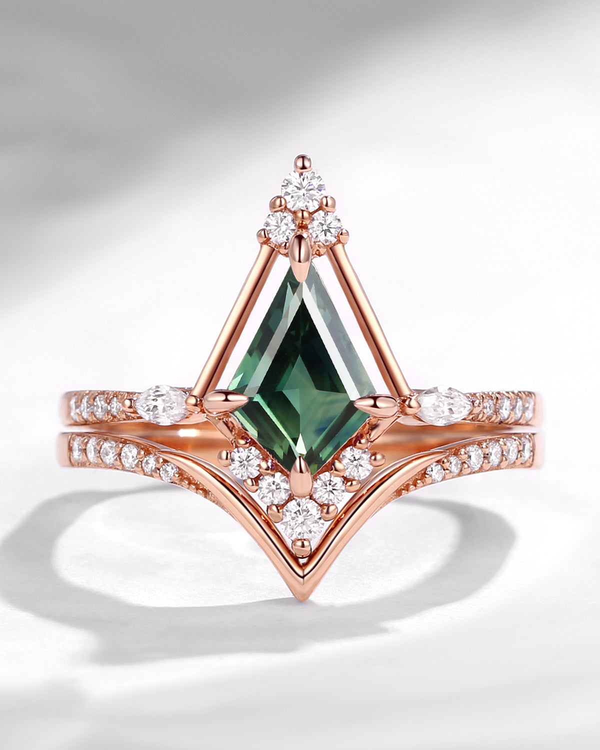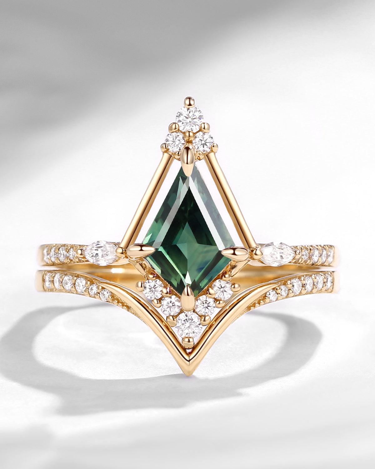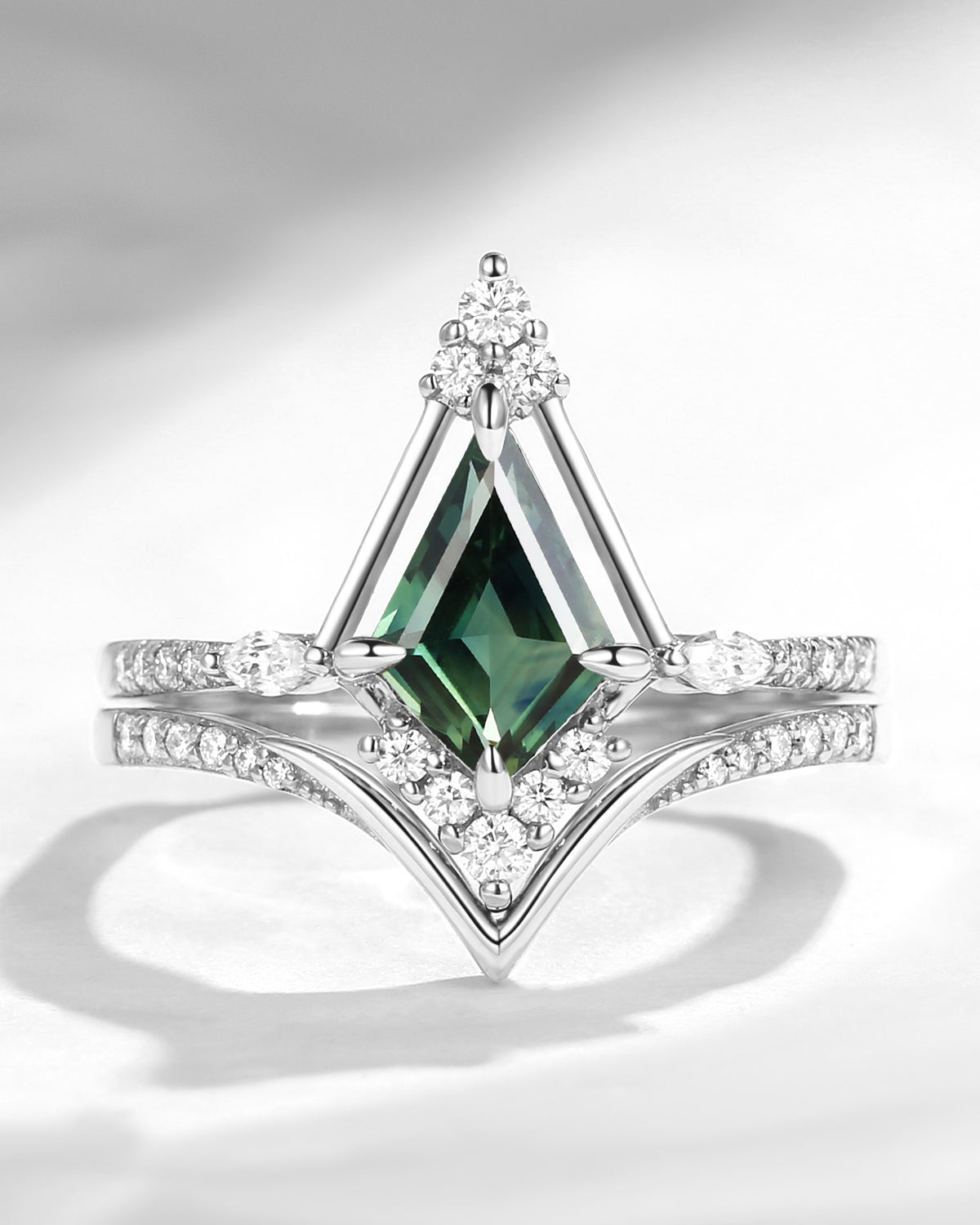 18K Kite Shaped Natural Teal Sapphire Engagement Ring Set 2pcs
