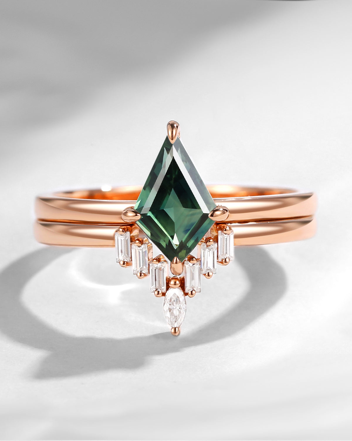 Kite Cut Natural Teal Sapphire Art Deco Engagement Ring Set 2pcs