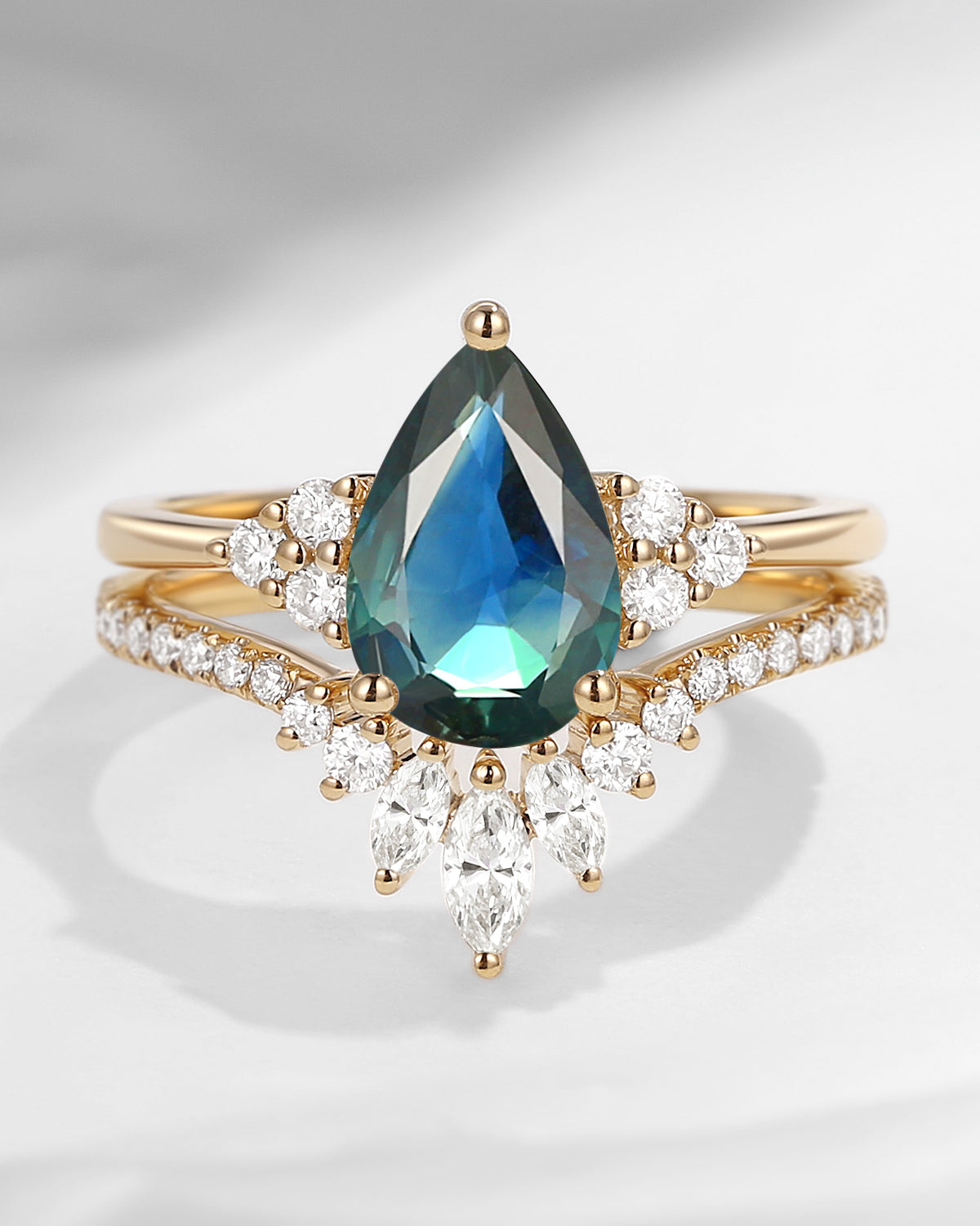 Pear Cut Natural Teal Sapphire Cluster Engagement Ring Set 2pcs - Vivian