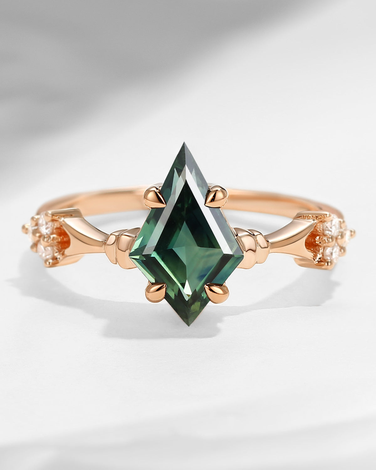 Vintage Inspired Kite Cut Natural Teal Sapphire Engagement Ring