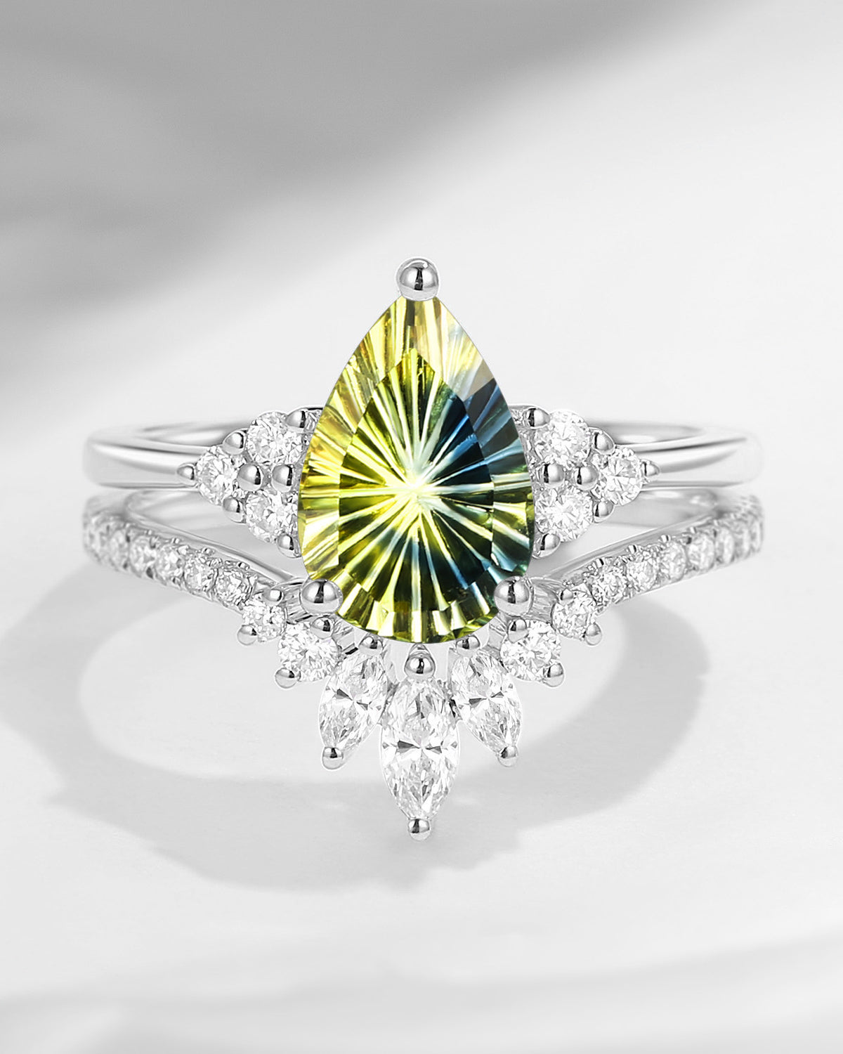 Pear Cut Blue Moissanite Cluster Engagement Ring Set 2pcs - Vivian