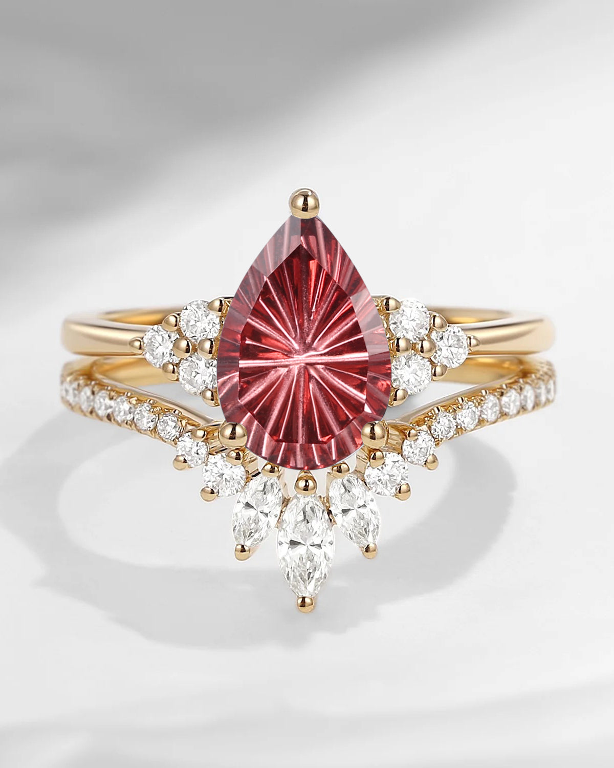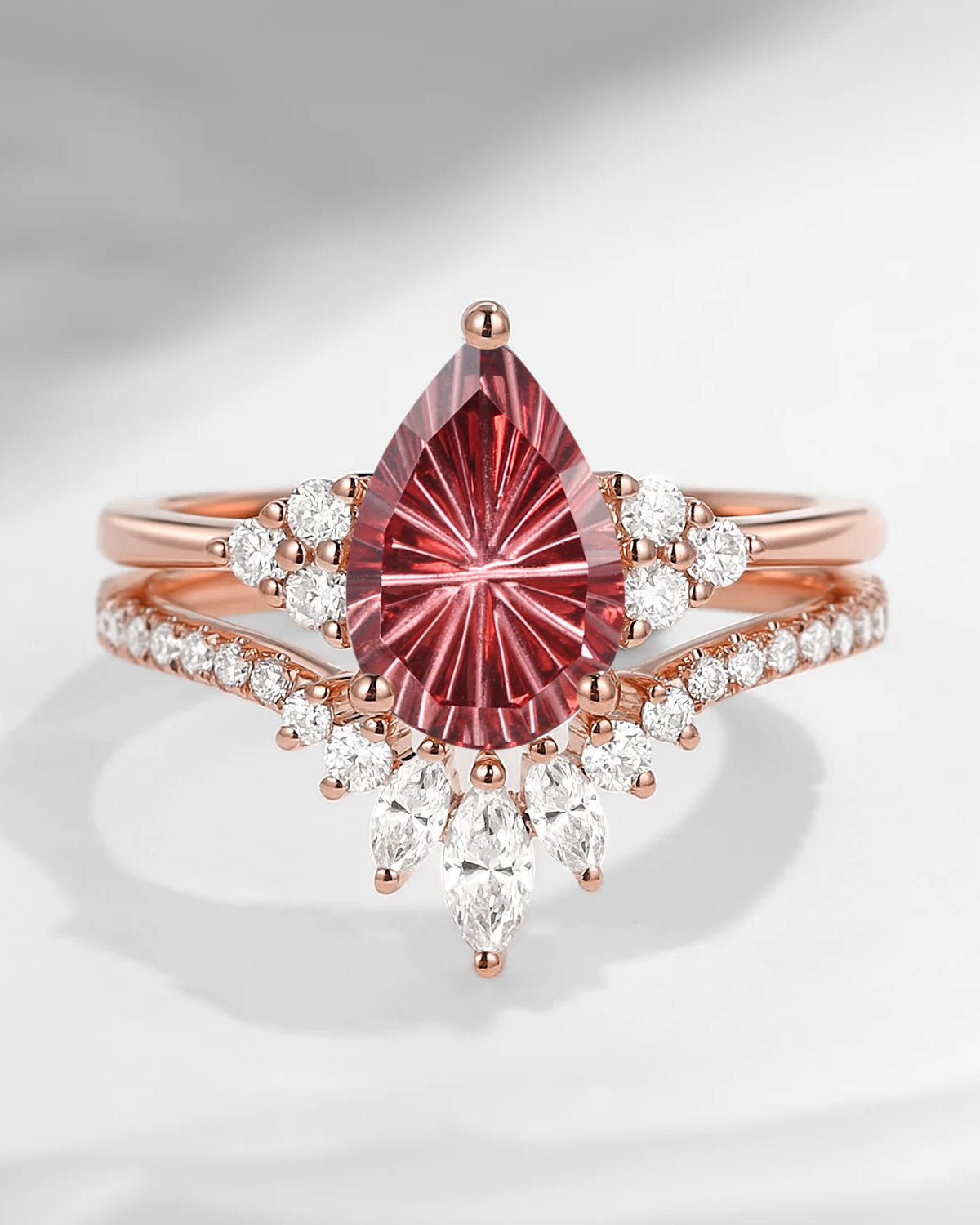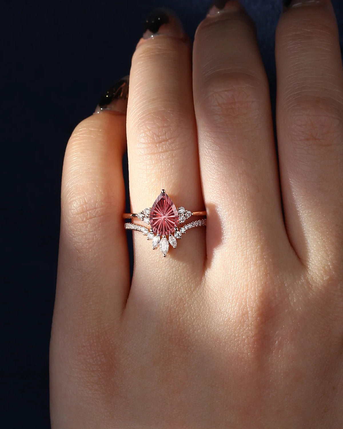 Pear Cut Pink Moissanite Cluster Engagement Ring Set 2pcs - Vivian