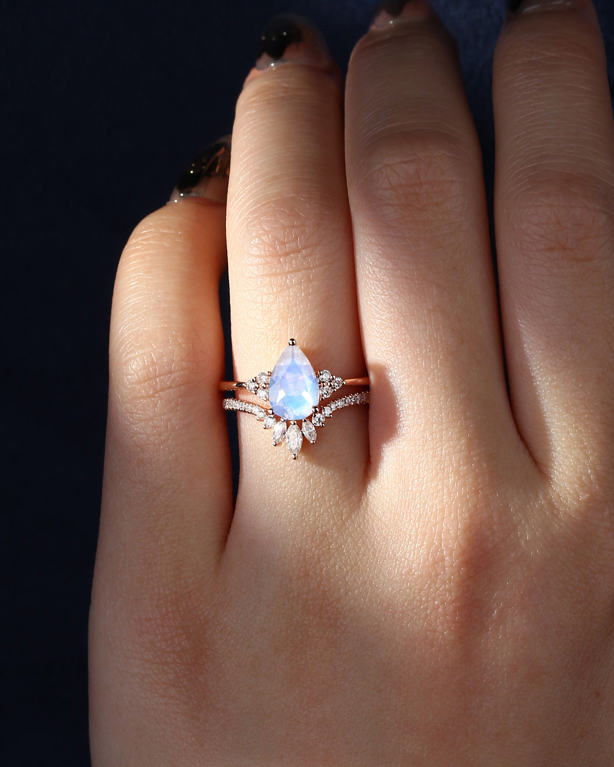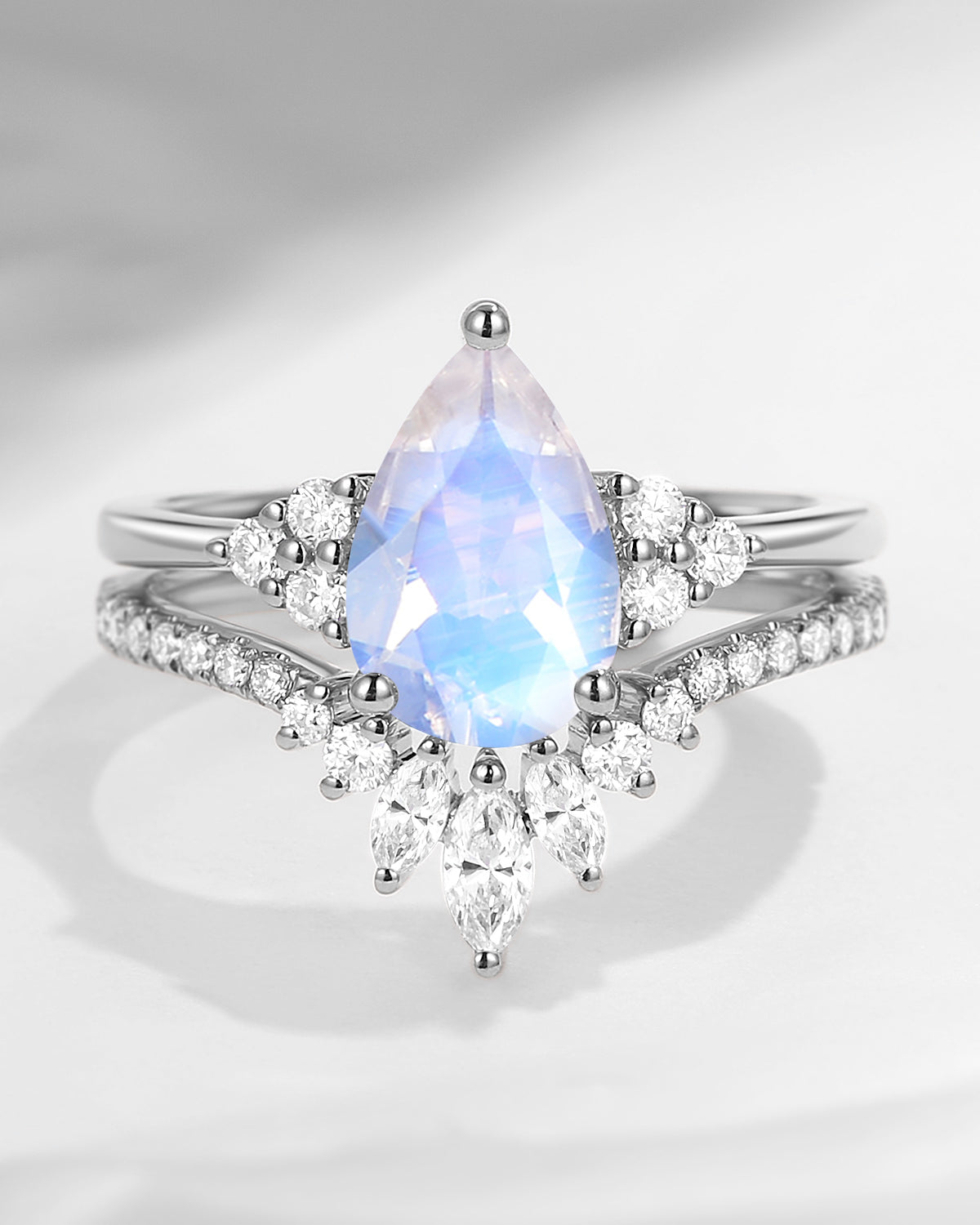 Pear Shaped Classic Cluster Moonstone Engagement Ring Set 2pcs - Vivian