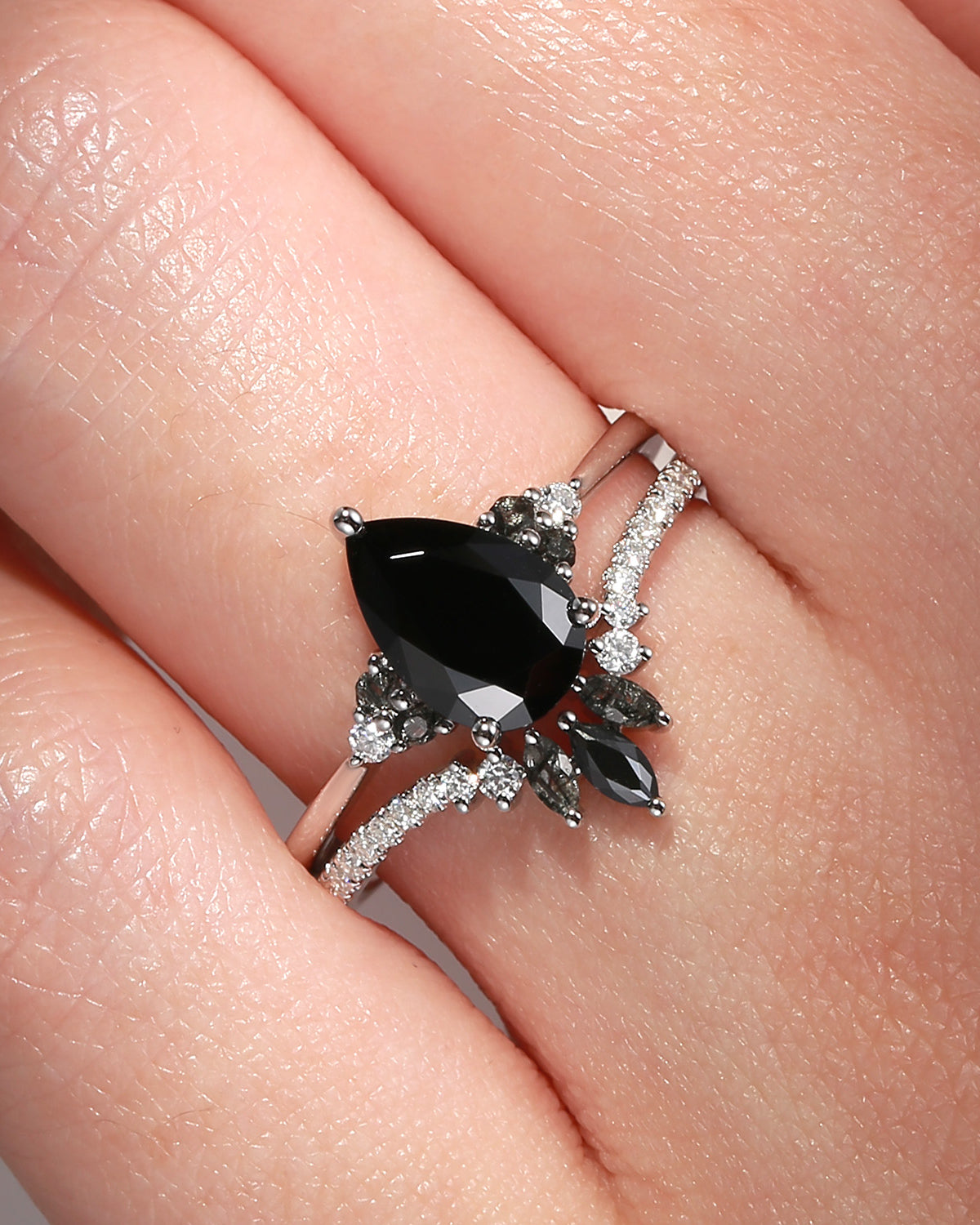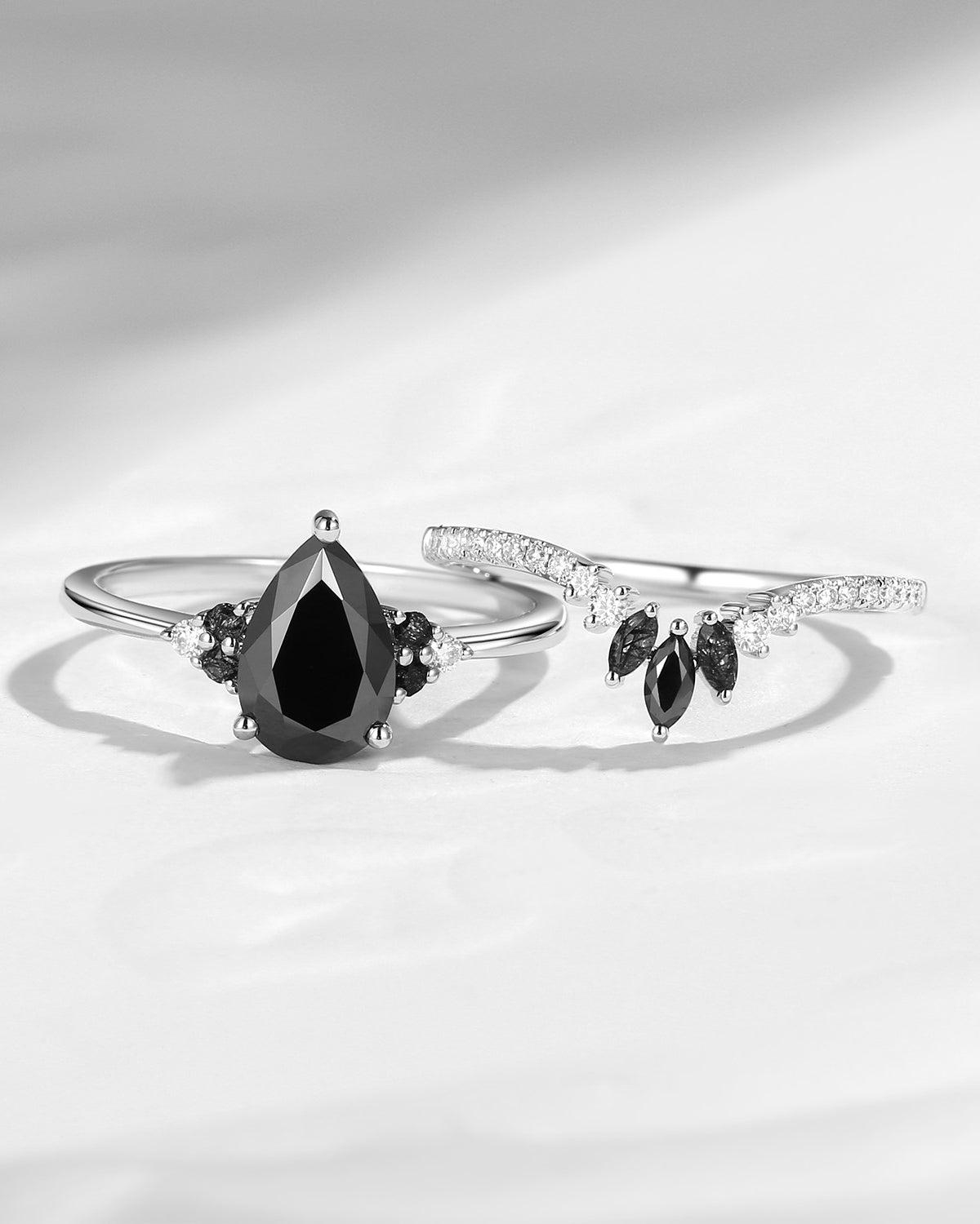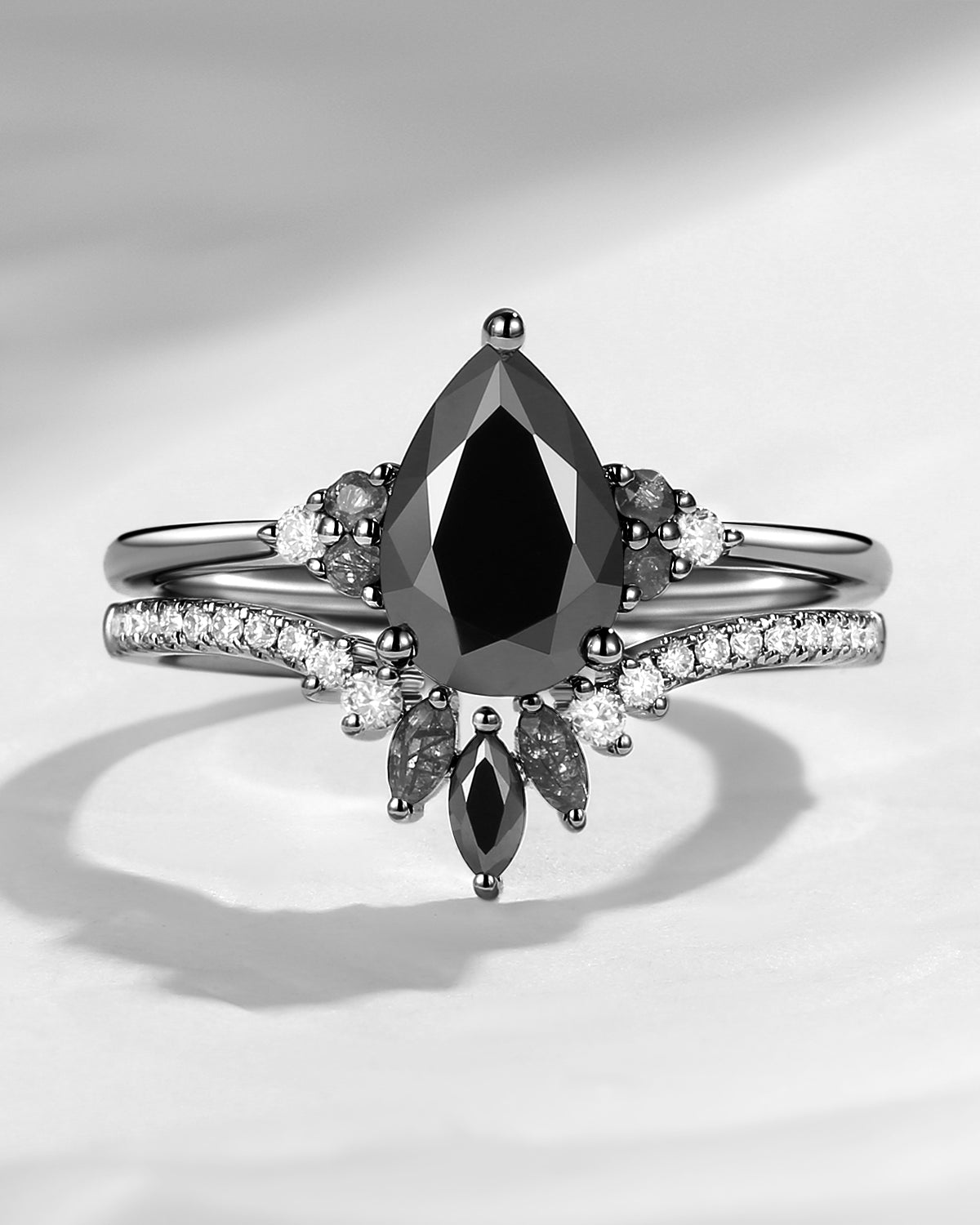 Unique Pear Cut Black Moissanite Cluster Engagement Ring Set 2pcs - Vivian