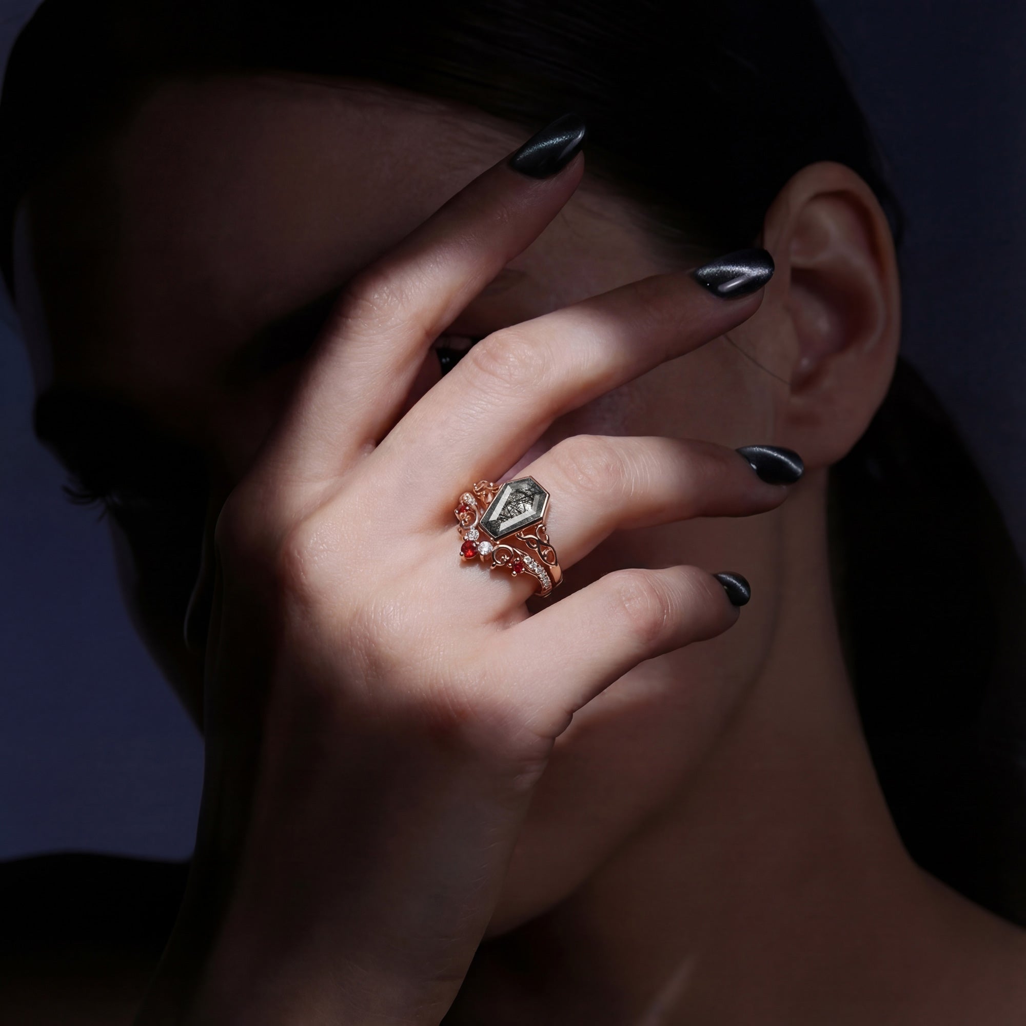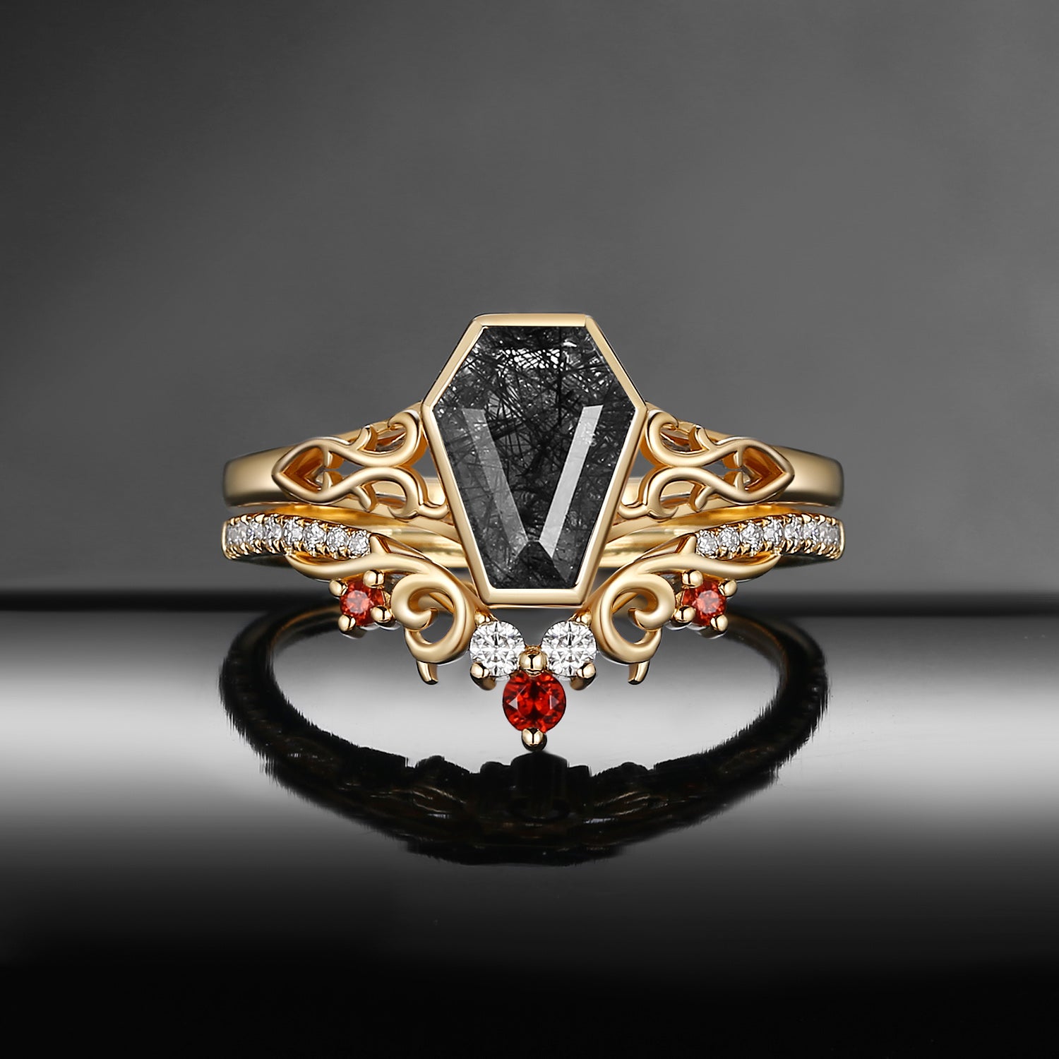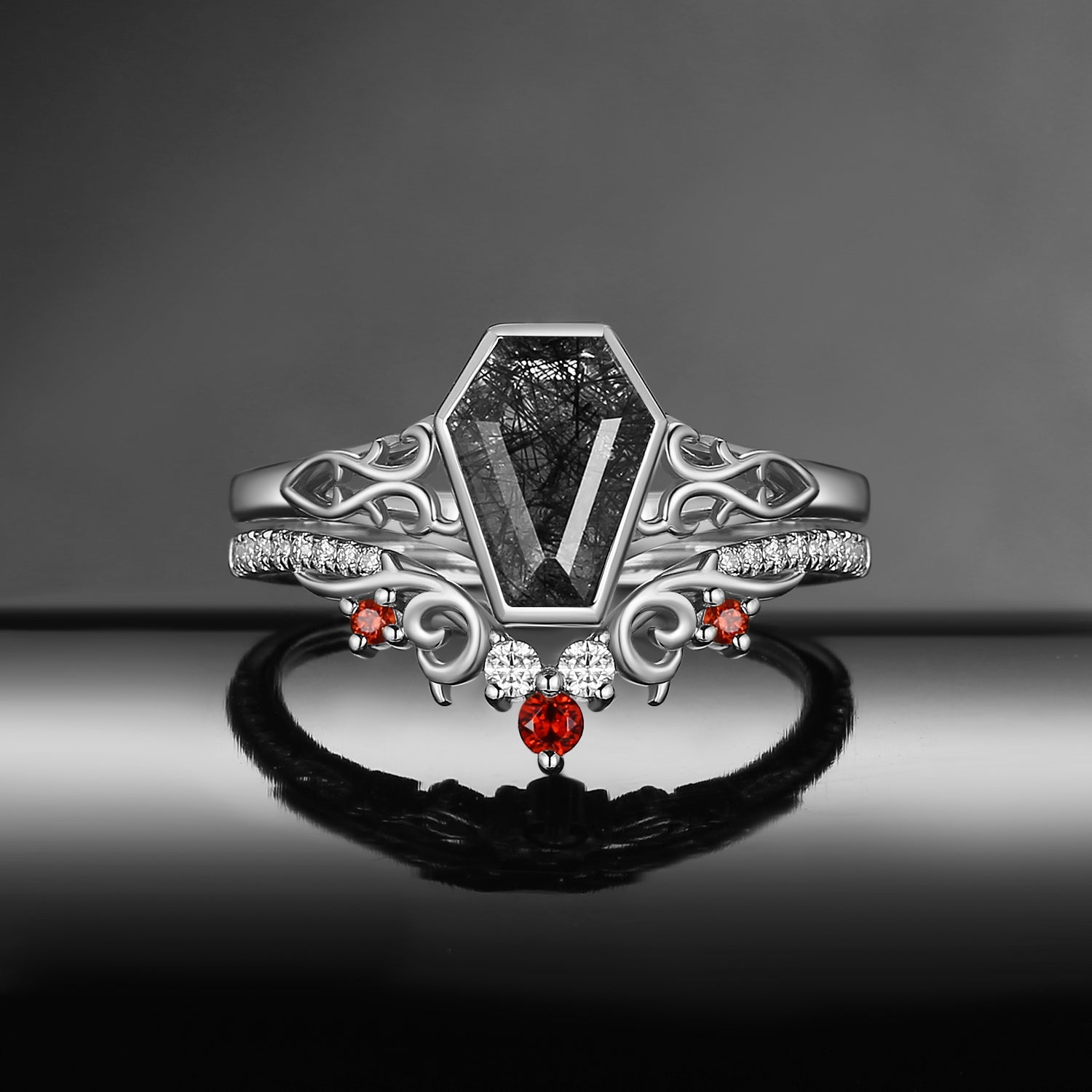 Antique Art Deco Coffin Cut Black Rutilated Quartz 'Thorns & Roses' Engagement Ring Set 2pcs