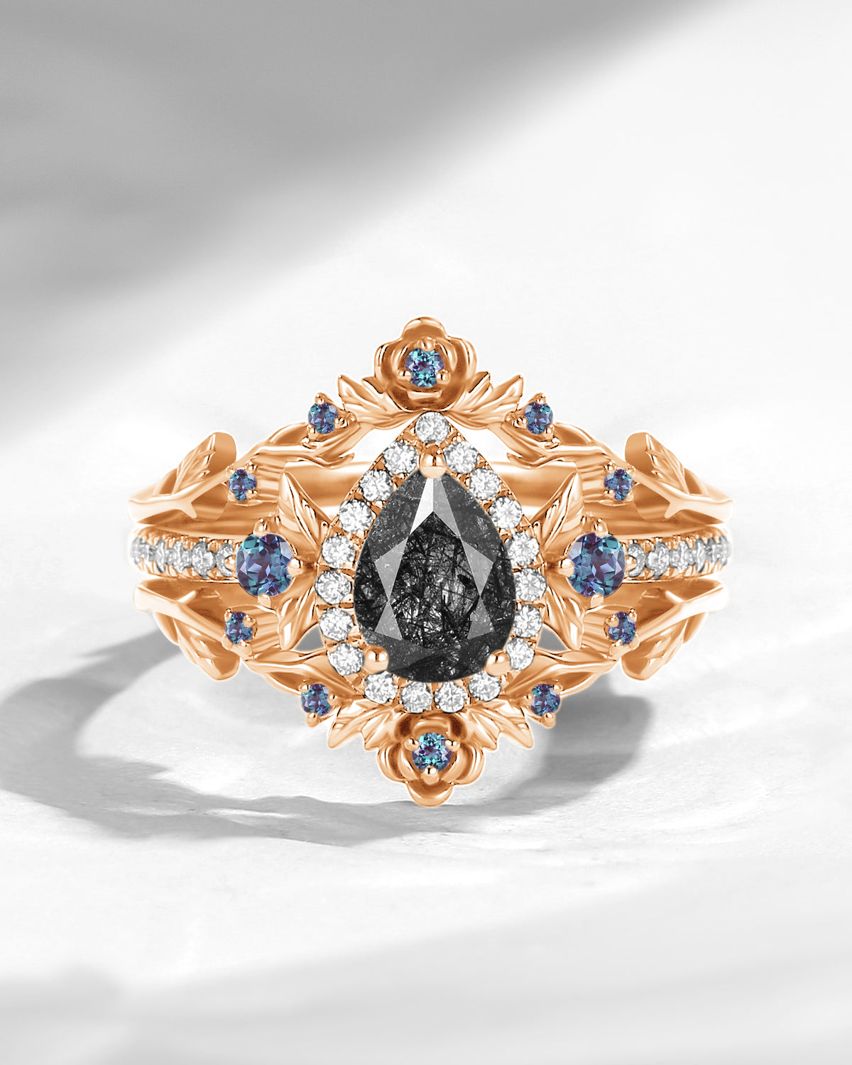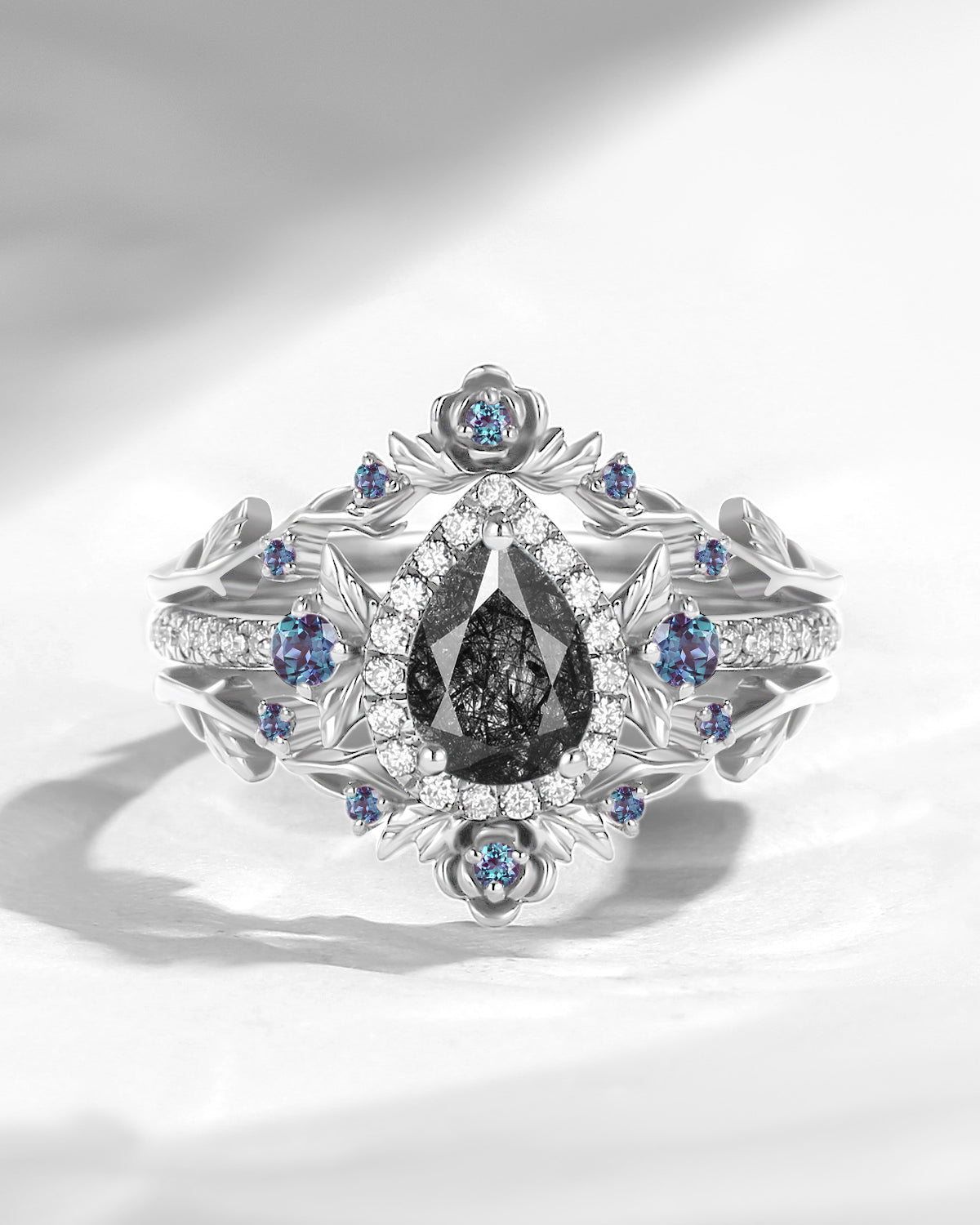 Nature Inspired Pear Cut Moss Agate 'Thorns & Roses' Halo Engagement Ring Set 2pcs