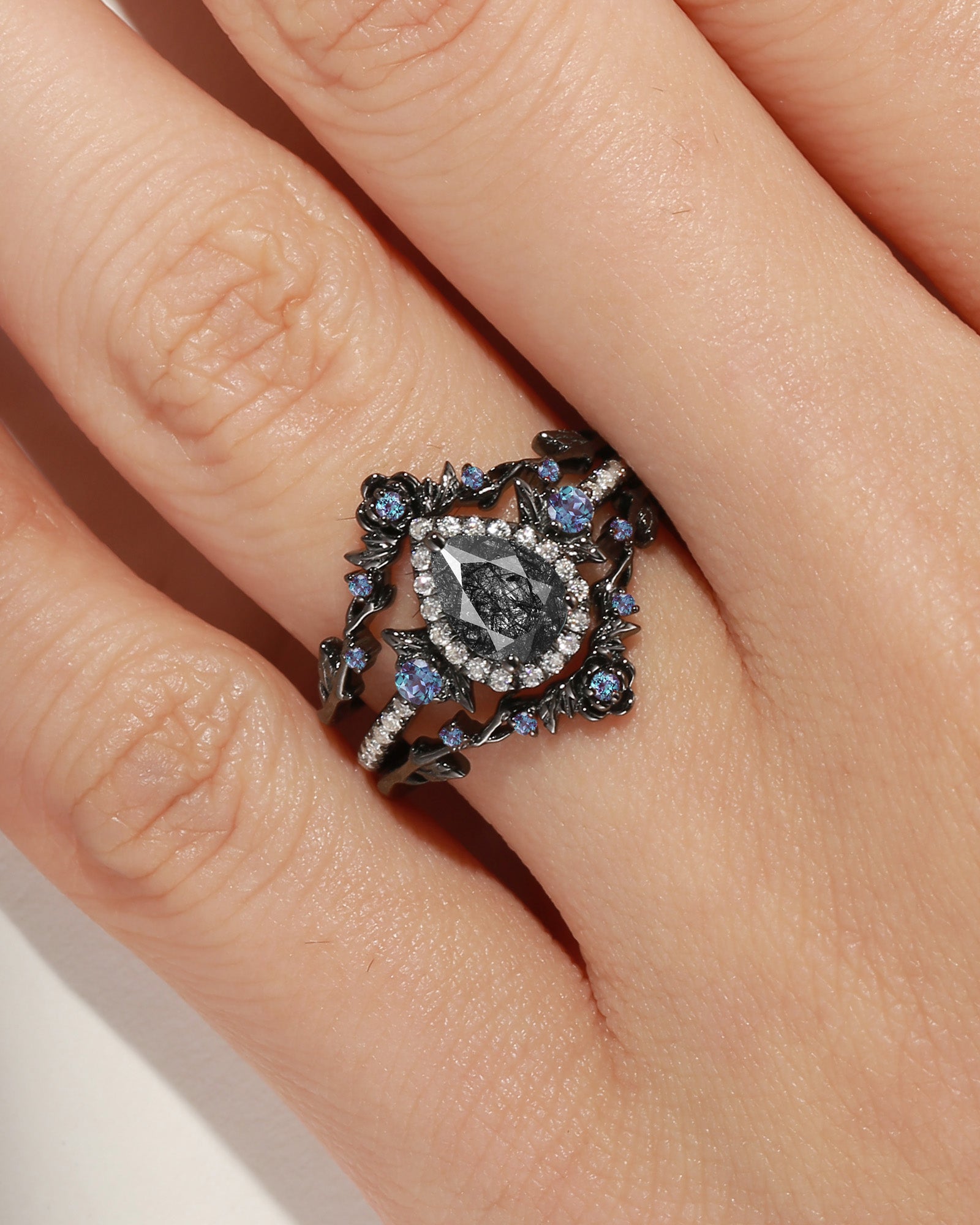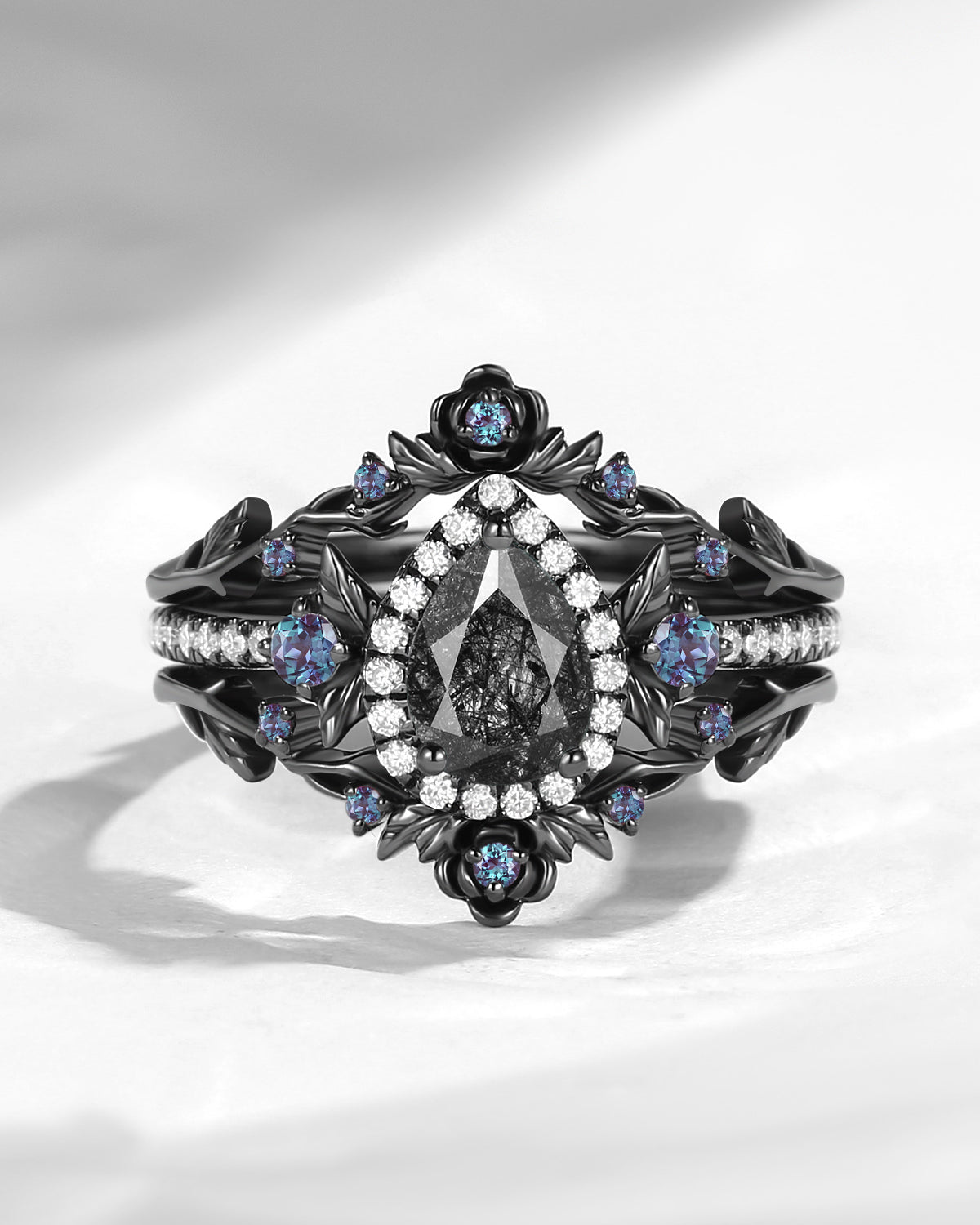 Gothic Style Coffin Black Rutilated Quartz Vine And Thorns Engagement Ring 2pcs