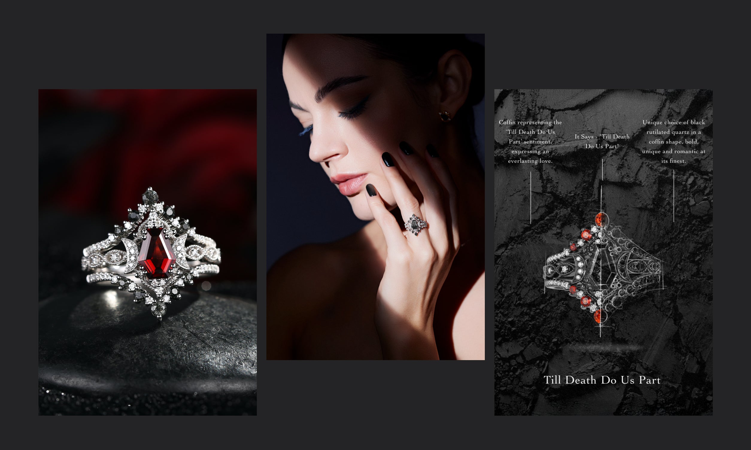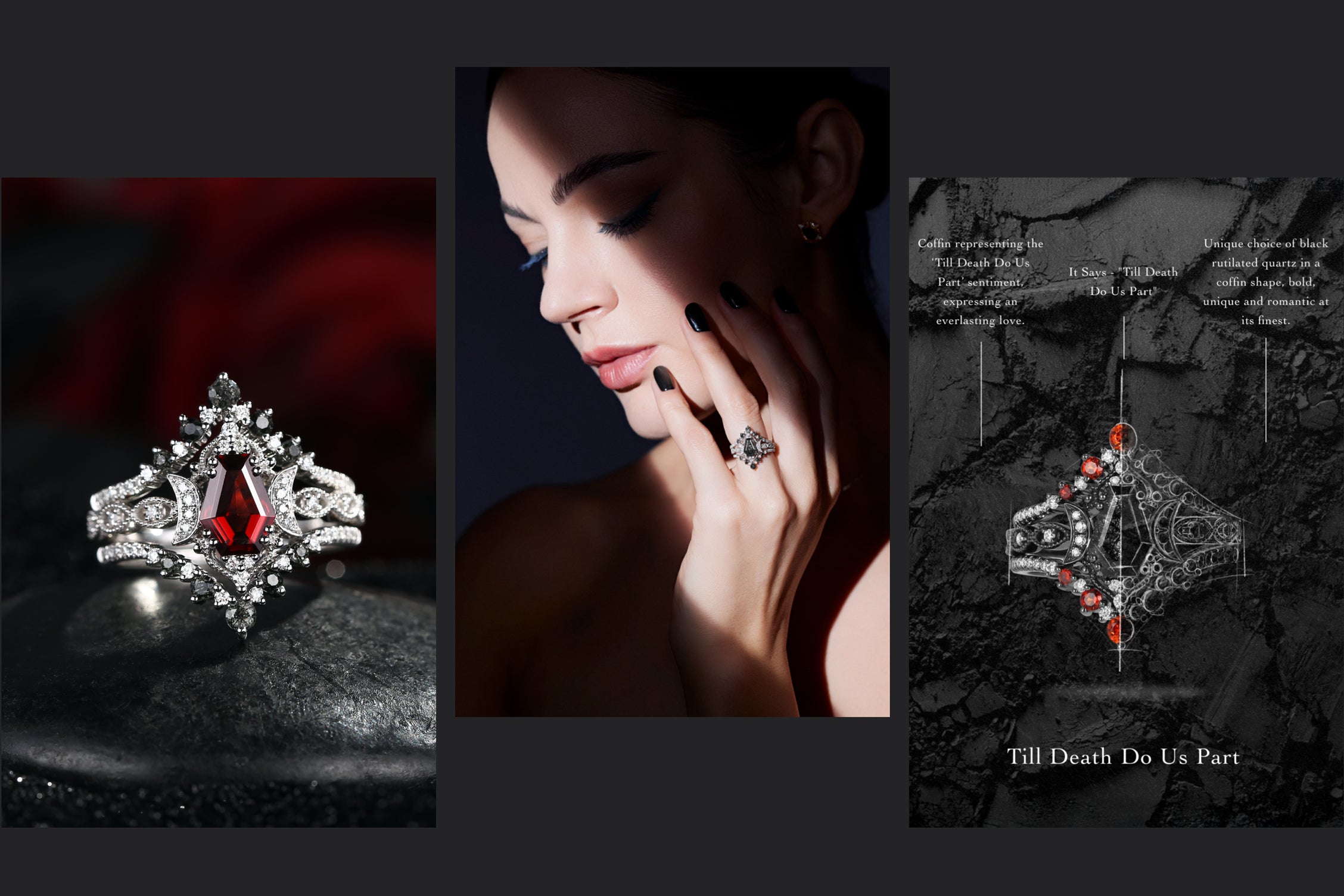 Crescent Moon | Coffin Garnet Engagement Ring 3pcs 18k - Till Death Do Us Apart
