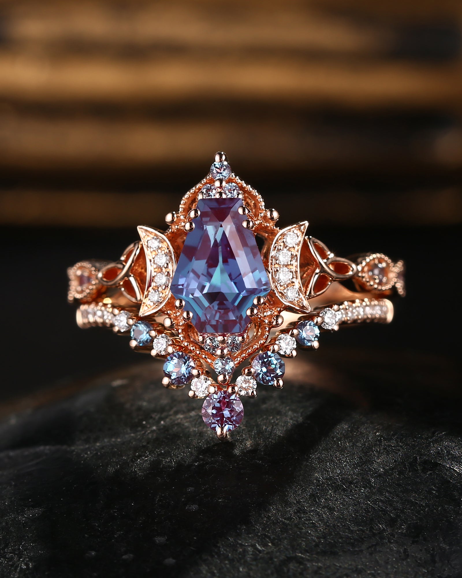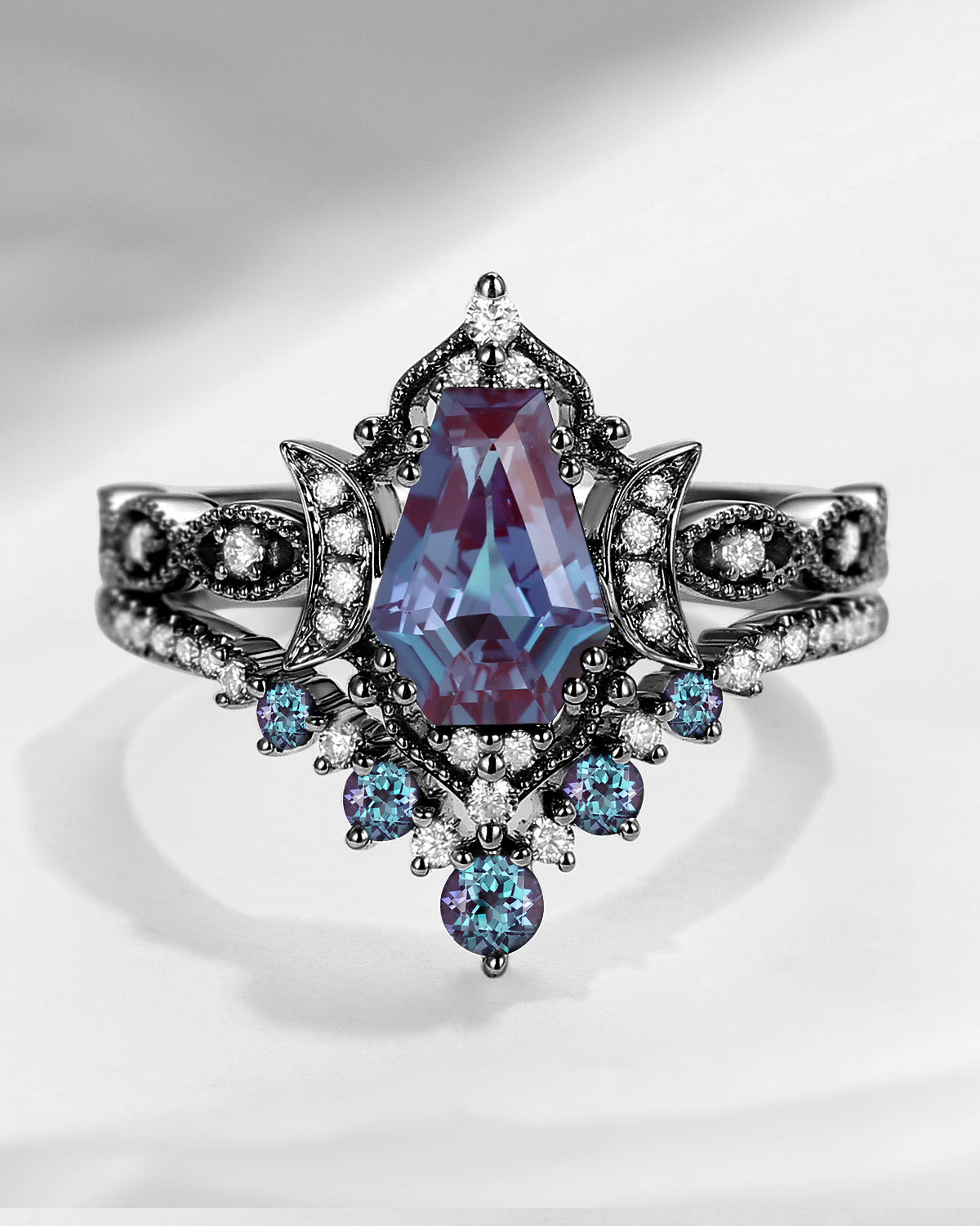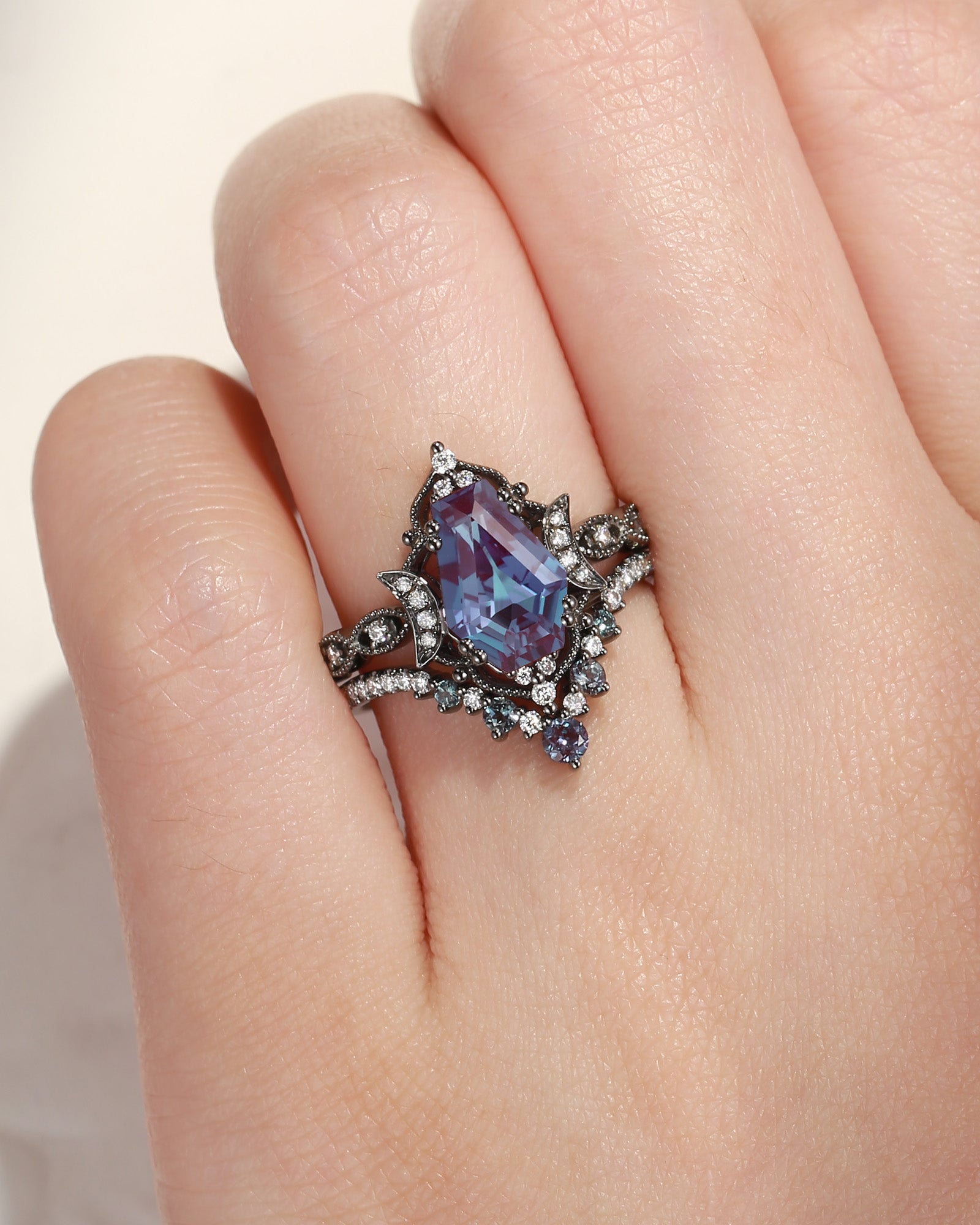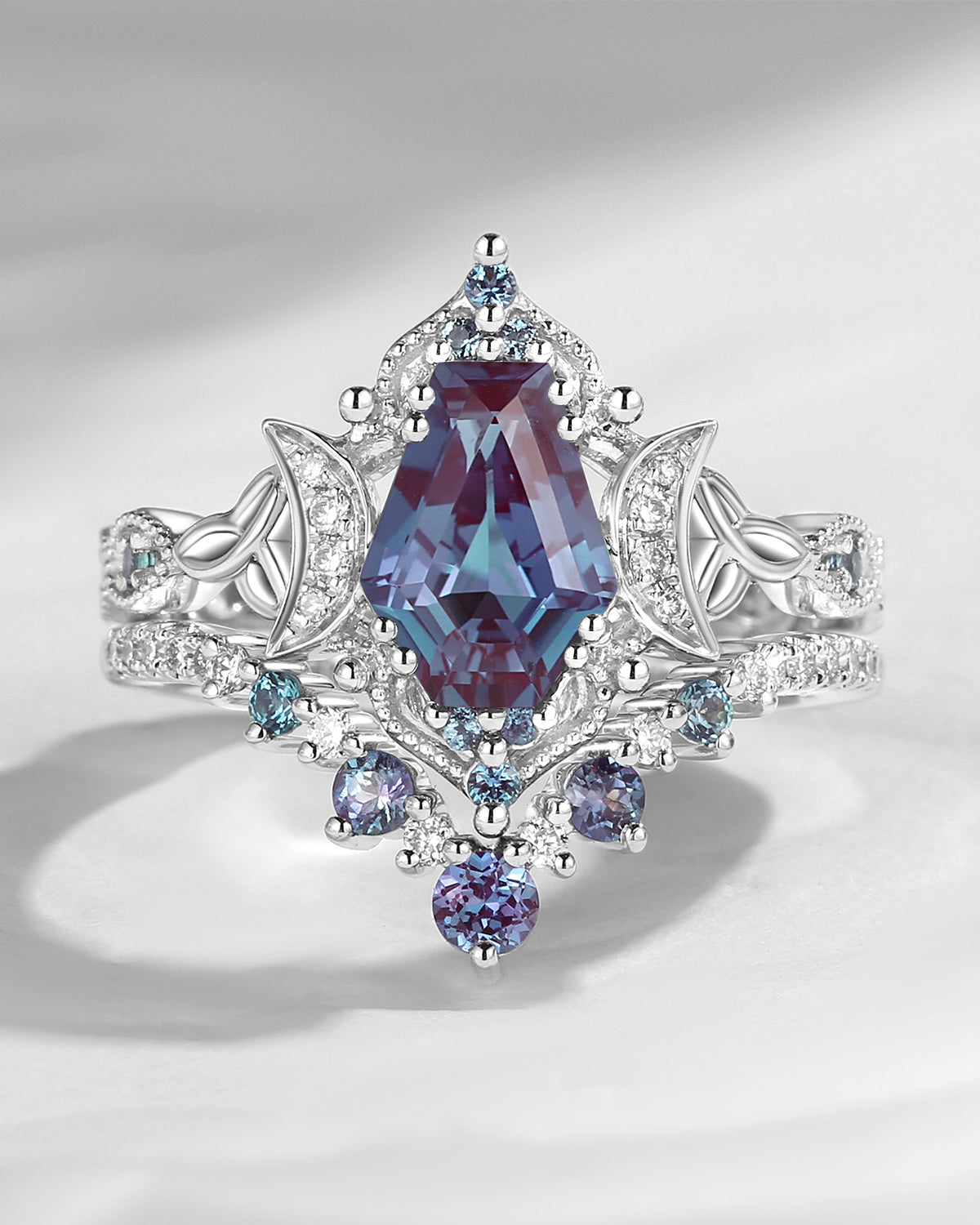 Crescent Moon | Coffin Faceted Lab Alexandrite Engagement Ring Set 3PCS