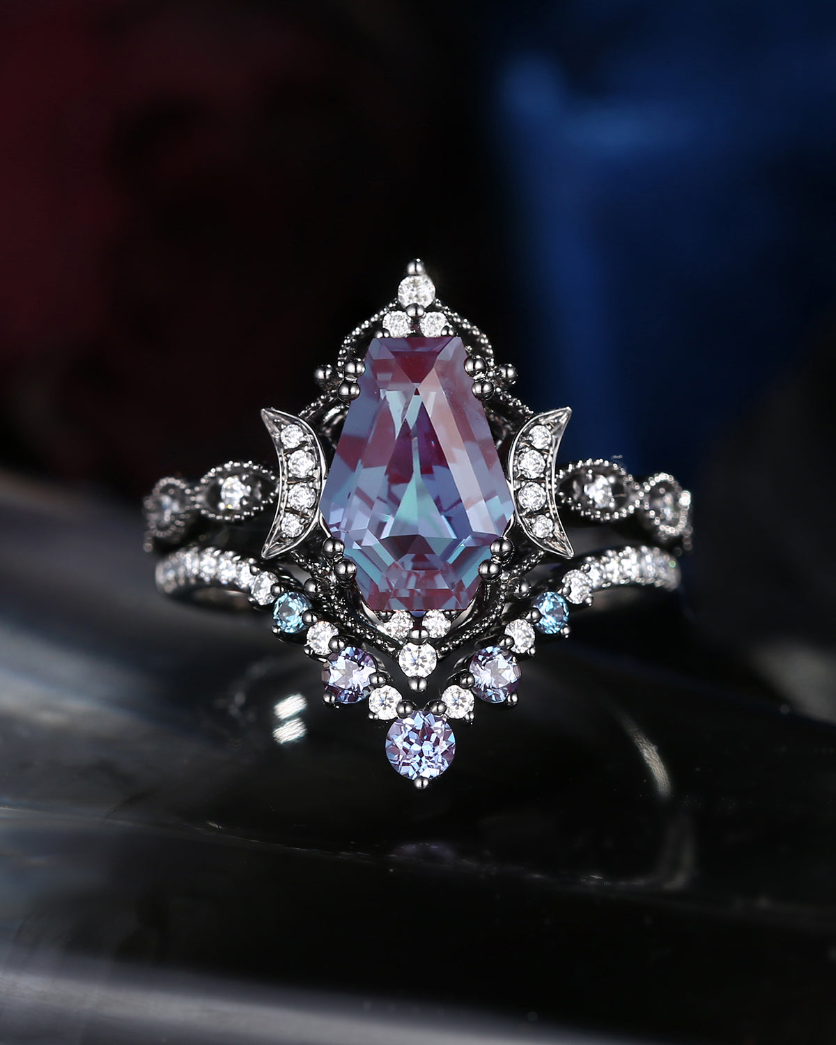 Crescent Moon | Coffin Cut Lab Alexandrite 'Black Statement' Ring Set 2pcs