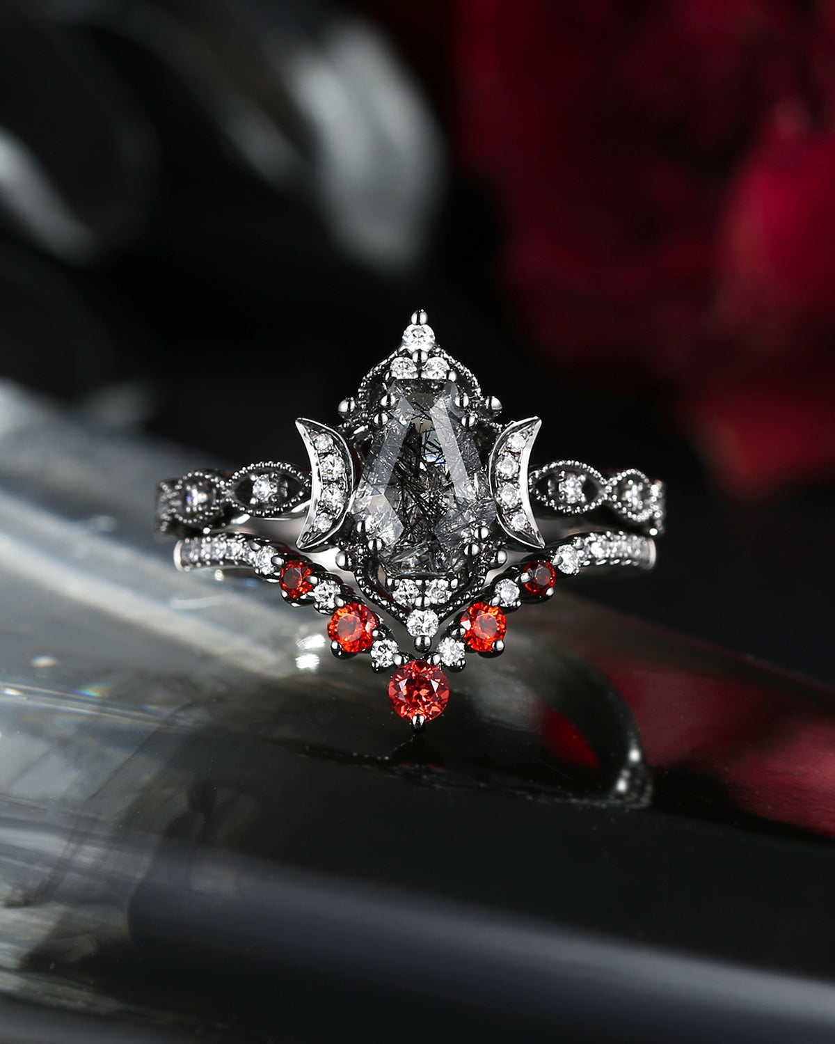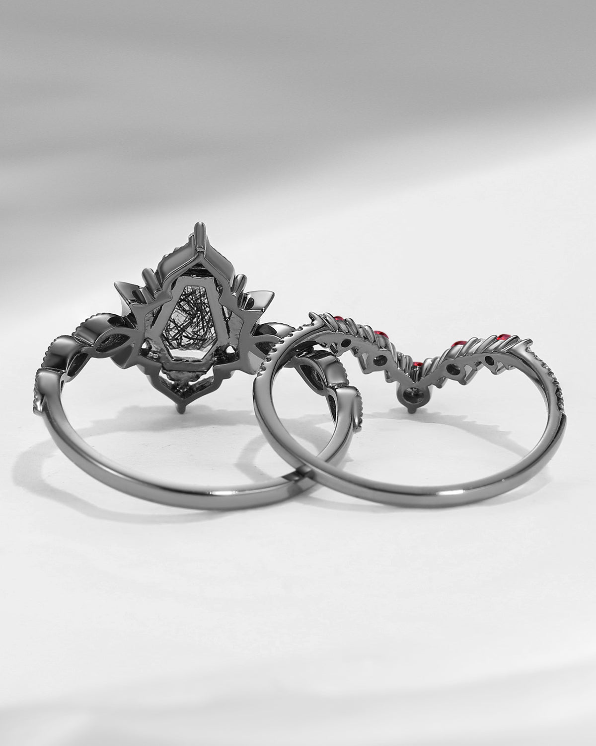 Crescent Moon | Coffin Cut Black Rutilated Quartz 'Till Death Do Us Part' Ring Set 2pcs