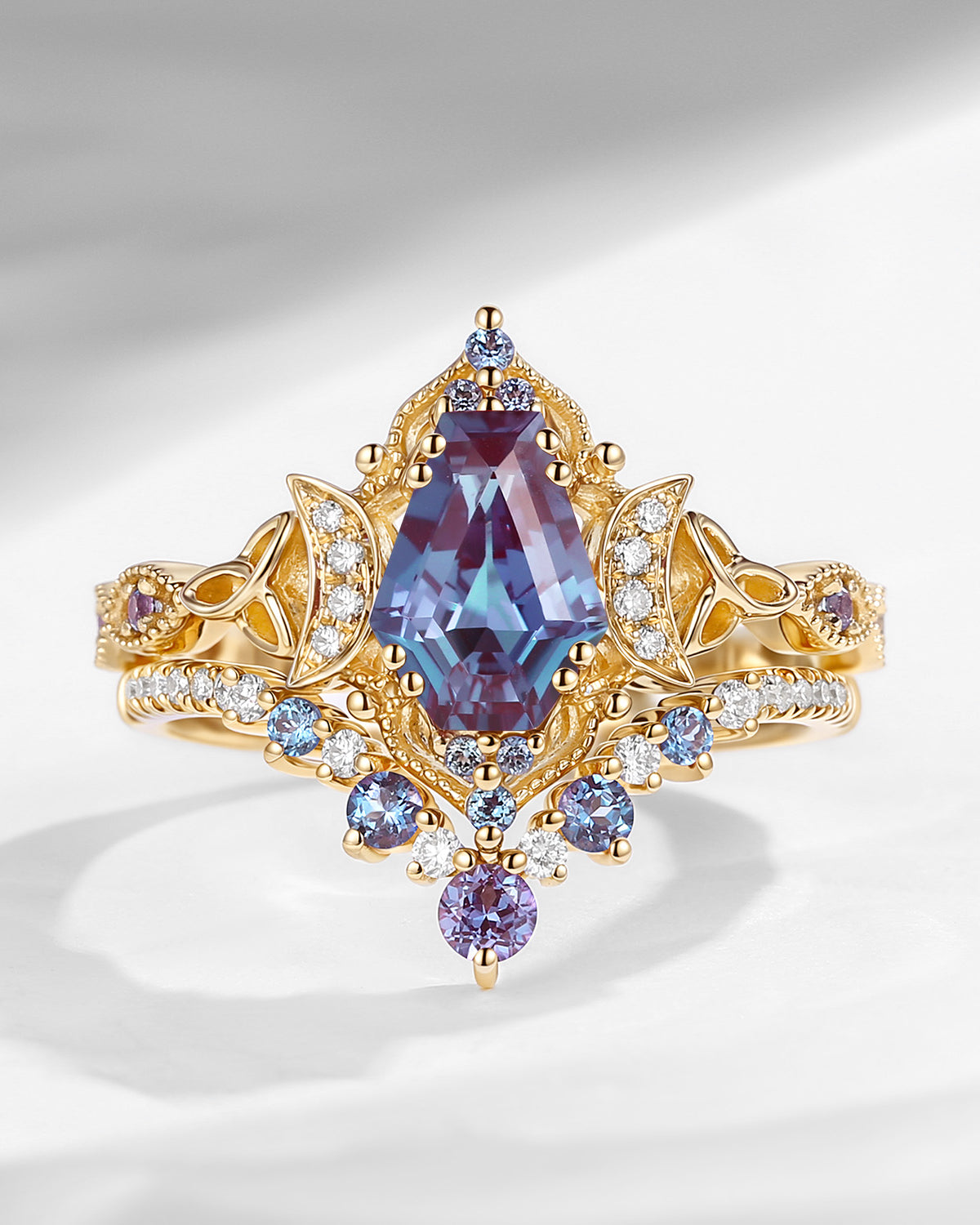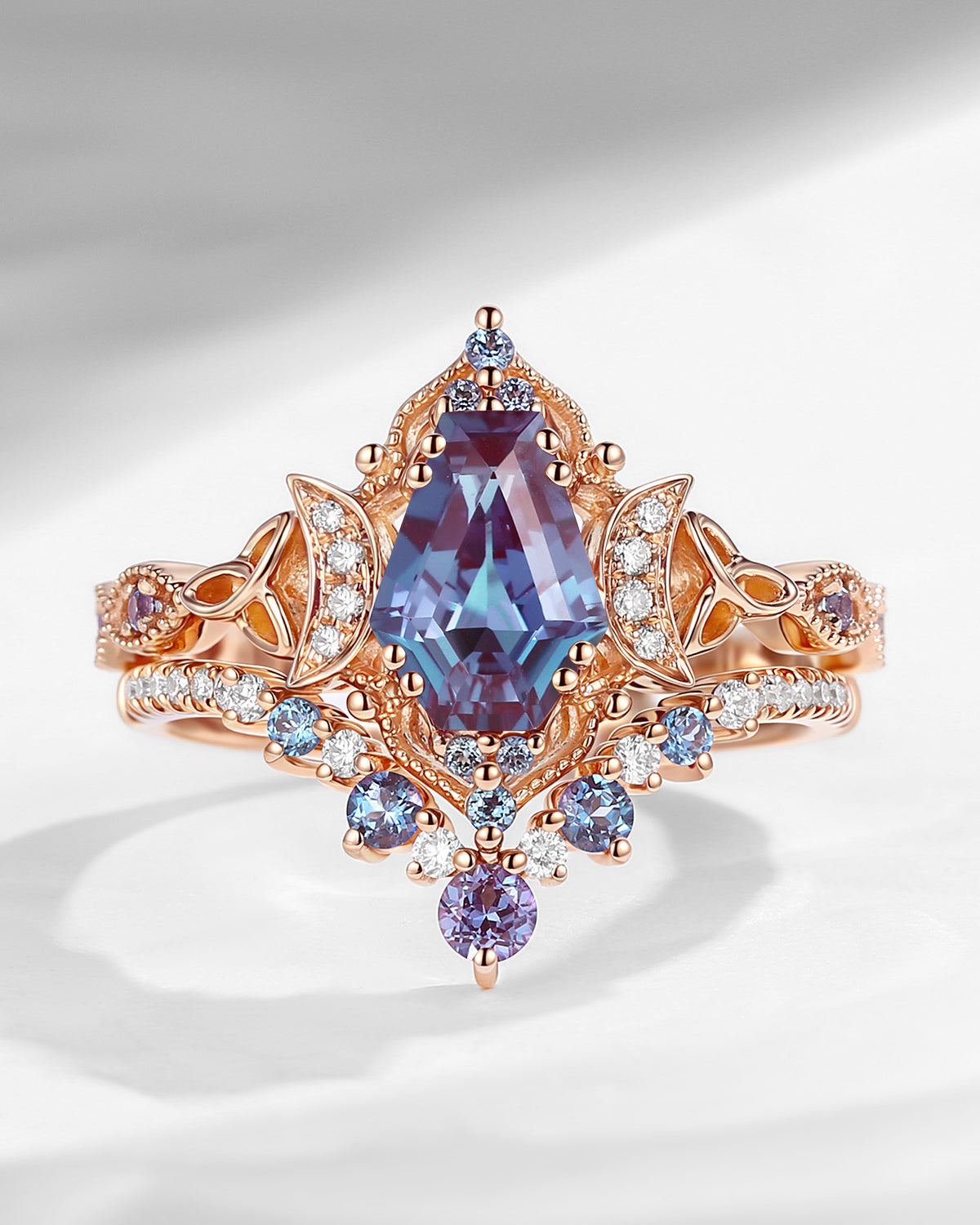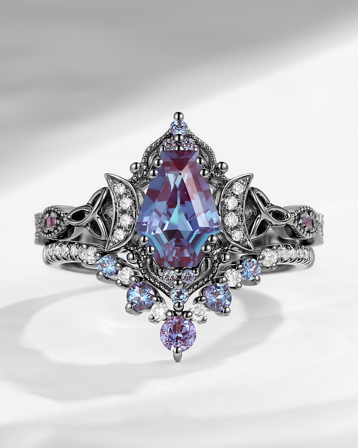 Crescent Moon | Unique Coffin Cut Lab Alexandrite Celtic Engagement Ring Set 2pcs