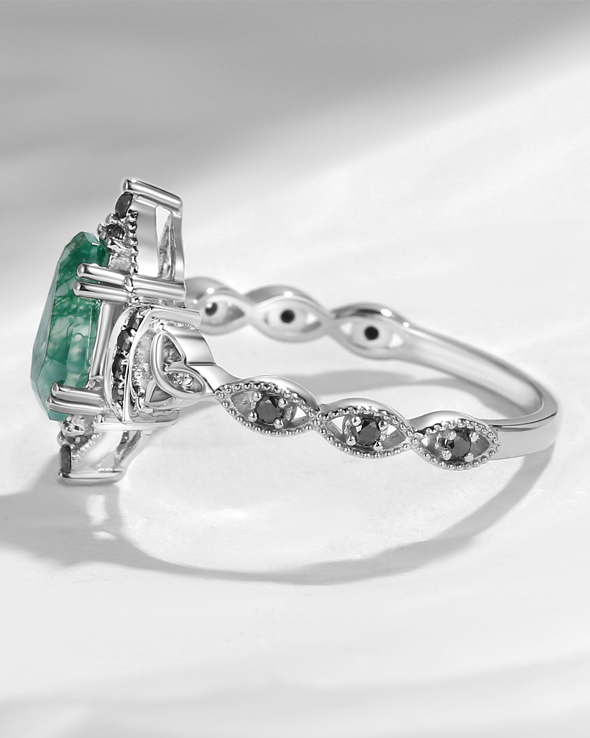 Crescent Moon | Coffin Moss Agate & Lab Emerald 'Black Statement' Ring Set 3pcs